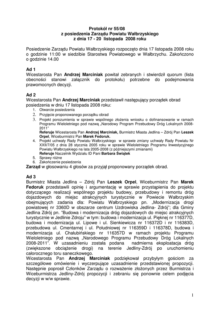 1 Protokół nr 55/08 z posiedzenia Zarządu Powiatu Wałbrzyskiego z