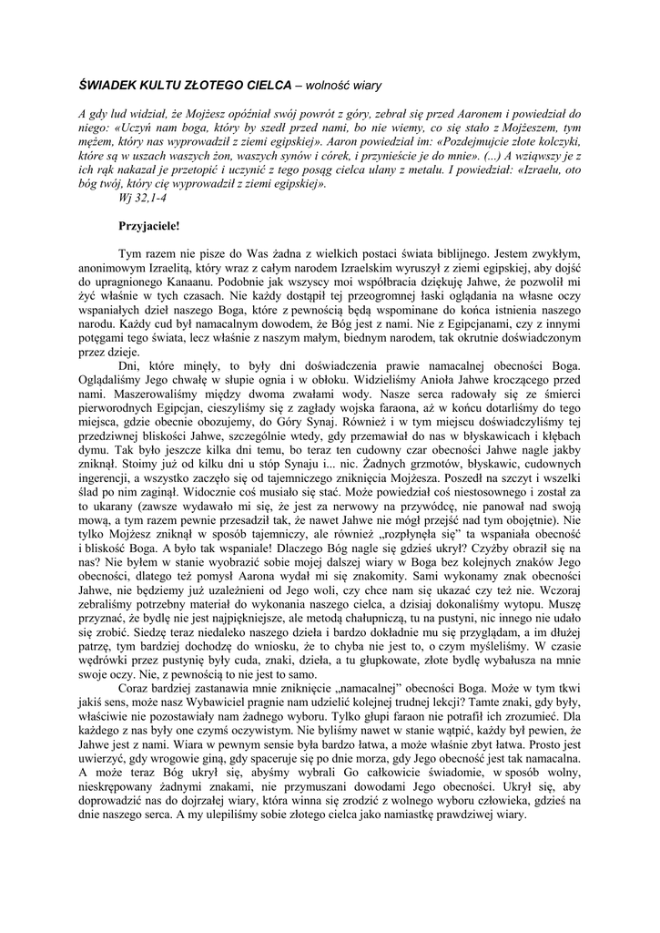 ŚWIADEK KULTU ZŁOTEGO CIELCA – wolność wiary A gdy lud widział, że Mojżesz opóźniał swój powrót z góry, zebrał się przed Aaronem i powiedział do niego: «Uczyń nam boga, który by szedł przed nami, bo nie wiemy, co się stało z Mojżeszem, tym mężem, który nas wyprowadził z ziemi egipskiej». Aaron powiedział im: «Pozdejmujcie złote kolczyki, które są w uszach waszych żon, waszych synów i córek, i przynieście je do mnie». (...) A wziąwszy je z ich rąk nakazał je przetopić i uczynić z tego posąg cielca ulany z metalu. I powiedział: «Izraelu, oto bóg twój, który cię wyprowadził z ziemi egipskiej». Wj 32,1-4 Przyjaciele! Tym razem nie pisze do Was żadna z wielkich postaci świata biblijnego. Jestem zwykłym, anonimowym Izraelitą, który wraz z całym narodem Izraelskim wyruszył z ziemi egipskiej, aby dojść do upragnionego Kanaanu. Podobnie jak wszyscy moi współbracia dziękuję Jahwe, że pozwolił mi żyć właśnie w tych czasach. Nie każdy dostąpił tej przeogromnej łaski oglądania na własne oczy wspaniałych dzieł naszego Boga, które z pewnością będą wspominane do końca istnienia naszego narodu. Każdy cud był namacalnym dowodem, że Bóg jest z nami. Nie z Egipcjanami, czy z innymi potęgami tego świata, lecz właśnie z naszym małym, biednym narodem, tak okrutnie doświadczonym przez dzieje. Dni, które minęły, to były dni doświadczenia prawie namacalnej obecności Boga. Oglądaliśmy Jego chwałę w słupie ognia i w obłoku. Widzieliśmy Anioła Jahwe kroczącego przed nami. Maszerowaliśmy między dwoma zwałami wody. Nasze serca radowały się ze śmierci pierworodnych Egipcjan, cieszyliśmy się z zagłady wojska faraona, aż w końcu dotarliśmy do tego miejsca, gdzie obecnie obozujemy, do Góry Synaj. Również i w tym miejscu doświadczyliśmy tej przedziwnej bliskości Jahwe, szczególnie wtedy, gdy przemawiał do nas w błyskawicach i kłębach dymu. Tak było jeszcze kilka dni temu, bo teraz ten cudowny czar obecności Jahwe nagle jakby zniknął. Stoimy już od kilku dni u stóp Synaju i... nic. Żadnych grzmotów, błyskawic, cudownych ingerencji, a wszystko zaczęło się od tajemniczego zniknięcia Mojżesza. Poszedł na szczyt i wszelki ślad po nim zaginął. Widocznie coś musiało się stać. Może powiedział coś niestosownego i został za to ukarany (zawsze wydawało mi się, że jest za nerwowy na przywódcę, nie panował nad swoją mową, a tym razem pewnie przesadził tak, że nawet Jahwe nie mógł przejść nad tym obojętnie). Nie tylko Mojżesz zniknął w sposób tajemniczy, ale również „rozpłynęła się” ta wspaniała obecność i bliskość Boga. A było tak wspaniale! Dlaczego Bóg nagle się gdzieś ukrył? Czyżby obraził się na nas? Nie byłem w stanie wyobrazić sobie mojej dalszej wiary w Boga bez kolejnych znaków Jego obecności, dlatego też pomysł Aarona wydał mi się znakomity. Sami wykonamy znak obecności Jahwe, nie będziemy już uzależnieni od Jego woli, czy chce nam się ukazać czy też nie. Wczoraj zebraliśmy potrzebny materiał do wykonania naszego cielca, a dzisiaj dokonaliśmy wytopu. Muszę przyznać, że bydlę nie jest najpiękniejsze, ale metodą chałupniczą, tu na pustyni, nic innego nie udało się zrobić. Siedzę teraz niedaleko naszego dzieła i bardzo dokładnie mu się przyglądam, a im dłużej patrzę, tym bardziej dochodzę do wniosku, że to chyba nie jest to, o czym myśleliśmy. W czasie wędrówki przez pustynię były cuda, znaki, dzieła, a tu głupkowate, złote bydlę wybałusza na mnie swoje oczy. Nie, z pewnością to nie jest to samo. Coraz bardziej zastanawia mnie zniknięcie „namacalnej” obecności Boga. Może w tym tkwi jakiś sens, może nasz Wybawiciel pragnie nam udzielić kolejnej trudnej lekcji? Tamte znaki, gdy były, właściwie nie pozostawiały nam żadnego wyboru. Tylko głupi faraon nie potrafił ich zrozumieć. Dla każdego z nas były one czymś oczywistym. Nie byliśmy nawet w stanie wątpić, każdy był pewien, że Jahwe jest z nami. Wiara w pewnym sensie była bardzo łatwa, a może właśnie zbyt łatwa. Prosto jest uwierzyć, gdy wrogowie giną, gdy spaceruje się po dnie morza, gdy Jego obecność jest tak namacalna. A może teraz Bóg ukrył się, abyśmy wybrali Go całkowicie świadomie, w sposób wolny, nieskrępowany żadnymi znakami, nie przymuszani dowodami Jego obecności. Ukrył się, aby doprowadzić nas do dojrzałej wiary, która winna się zrodzić z wolnego wyboru człowieka, gdzieś na dnie naszego serca. A my ulepiliśmy sobie złotego cielca jako namiastkę prawdziwej wiary. Przepraszam, ale muszę już kończyć, bo powstał jakiś ruch w obozie - to Mojżesz wraca z Góry Synaj! O ile dobrze widzę to niesie w rękach jakieś kamienne płyty. Ciekawy jestem, co powie na temat naszego złotego bydlątka. Żyd spod Synaju