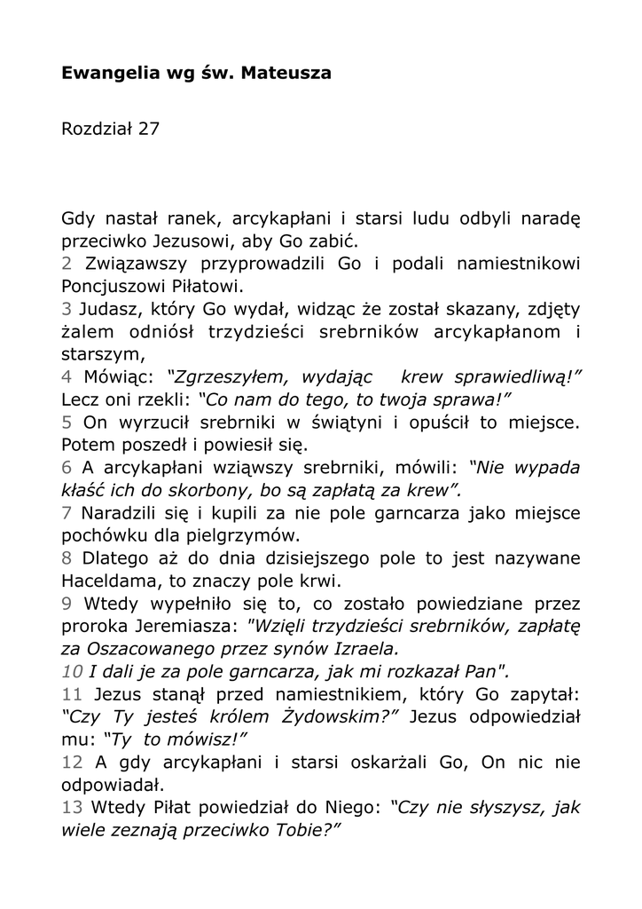 Ewangelia wg św. Mateusza Rozdział 27 Gdy nastał ranek, arcykapłani i starsi ludu odbyli naradę przeciwko Jezusowi, aby Go zabić. 2 Związawszy przyprowadzili Go i podali namiestnikowi Poncjuszowi Piłatowi. 3 Judasz, który Go wydał, widząc że został skazany, zdjęty żalem odniósł trzydzieści srebrników arcykapłanom i starszym, 4 Mówiąc: “Zgrzeszyłem, wydając krew sprawiedliwą!” Lecz oni rzekli: “Co nam do tego, to twoja sprawa!” 5 On wyrzucił srebrniki w świątyni i opuścił to miejsce. Potem poszedł i powiesił się. 6 A arcykapłani wziąwszy srebrniki, mówili: “Nie wypada kłaść ich do skorbony, bo są zapłatą za krew”. 7 Naradzili się i kupili za nie pole garncarza jako miejsce pochówku dla pielgrzymów. 8 Dlatego aż do dnia dzisiejszego pole to jest nazywane Haceldama, to znaczy pole krwi. 9 Wtedy wypełniło się to, co zostało powiedziane przez proroka Jeremiasza: "Wzięli trzydzieści srebrników, zapłatę za Oszacowanego przez synów Izraela. 10 I dali je za pole garncarza, jak mi rozkazał Pan". 11 Jezus stanął przed namiestnikiem, który Go zapytał: “Czy Ty jesteś królem Żydowskim?” Jezus odpowiedział mu: “Ty to mówisz!” 12 A gdy arcykapłani i starsi oskarżali Go, On nic nie odpowiadał. 13 Wtedy Piłat powiedział do Niego: “Czy nie słyszysz, jak wiele zeznają przeciwko Tobie?” 14 Lecz On nie odpowiedział mu na ani jedno pytanie, tak że namiestnik bardzo się dziwił. 15 A z okazji święta namiestnik zwykł był wypuszczać pospólstwu jednego więźnia, o którego prosiliby. 16 Miał w tym czasie znacznego więźnia, zwanego Barabaszem. 17 Gdy więc oni się zebrali, Piłat powiedział: “Wypuszczę wam tego, którego chcecie: Barabasza albo Jezusa, zwanego Chrystusem?” 18 Gdyż wiedział, że wydali Go z zazdrości. 19 Lecz gdy siedział na trybunale sądowym, posłała do niego jego żona, mówiąc: “Nie miej nic do czynienia z tym Sprawiedliwym, bo wiele wycierpiałam dziś w trakcie snu z Jego powodu”. 20 Zaś arcykapłani i starsi namówili tłum, aby prosili o Barabasza, a Jezusa stracili. 21 Namiestnik odpowiedział im: “Którego z tych dwóch mam wam wypuścić?” A oni powiedzieli: “Barabasza!” 22 Piłat rzekł im: “Co mam więc zrobić z Jezusem, którego nazywają Chrystusem?” Wszyscy powiedzieli: “Niech zostanie ukrzyżowany!” 23 Namiestnik powiedział do nich: “Ale cóż złego On zrobił?” A oni jeszcze bardziej wołali: “Niech zostanie ukrzyżowany!” 24 Piłat widząc, że to nic nie pomagało, ale nastał jeszcze większy rozruch, wziął wodę, umył przed tłumem ręce i powiedział: “Nie jestem winny krwi tego Sprawiedliwego. Patrzcie!” 25 Cały lud odpowiedzia zaś: “Jego krew na nas i na dzieci nasze!” 26 Wtedy wypuścił im Barabasza, a ubiczowanego Jezusa wydał im, by został ukrzyżowany. 27 Wtedy żołnierze namiestnika wzięli Jezusa do pretorium i zebrali wokół Niego całą kohortę. 28 Rozebrali Go, włożyli na Niego szkarłatny płaszcz, 29 A uplótłszy koronę z ciernia, włożyli ją na Jego głowę i dali Mu do ręki trzcinę. Kłaniając się Mu, drwili z Niego i mówili: “Bądź pozdrowiony, królu Żydowski!” 30 Plując na Niego, wzięli trzcinę i bili Go w głowę. 31 A gdy się z Niego naśmiali, rozebrali Go z ubrań, ubrali w Jego szaty i zaprowadzili na ukrzyżowanie. 32 Wychodząc, spotkali pewnego człowieka, Cyrenejczyka imieniem Szymon, którego zmusili, by niósł Jego krzyż. 33 Kiedy przyszli na miejsce, które nazywają Golgota, co się tłumaczy Miejsce Czaszki, 34 Dali Mu do picia wino zmieszane z żółcią, lecz gdy skosztował, nie chciał pić. 35 Ukrzyżowali Go i rozdzielili Jego szaty, rzucając los, aby się wypełniły słowa proroka: "Rozdzielili między sobą moje szaty, a o moją suknię rzucili los". 36 I siedząc, pilnowali Go. 37 Przytwierdzili nad Jego głową napis z opisem winy: “Oto Jezus, król Żydowski”. 38 Ukrzyżowano z Nim również dwóch łotrów: Jednego po prawej, a drugiego po lewej stronie. 39 A przechodzący obok lżyli Go, potrząsając głowami 40 I mówiąc: “Hej Ty, którzy burzysz świątynię Bożą, a po trzech dniach znów ją odbudowujesz, uratuj sam siebie! Jeśli jesteś Synem Bożym, zstąp z krzyża!” 41 Także arcykapłani wraz z uczonymi w Piśmie i ze starszymi naigrywali się i mówili: 42 “Innych ratował, a sam siebie nie może uratować. Jeśli jest Królem Izraelskim, niech teraz zejdzie z krzyża, a uwierzymy Mu! 43 Ufał Bogu, niech Go teraz wybawi, jeśli chce! Bo powiedział: “Jestem Synem Bożym”. 44 Urągali Mu również łotrzy, którzy byli z Nim ukrzyżowani. 45 A od godziny szóstej na całej ziemi nastała ciemność aż do godziny dziewiątej. 46 Około dziewiątej Jezus zawołał wielkim głosem: “Eli, Eli, lama sabachtani?” Co znaczy: “Boże Mój, Boże mój, dlaczego Mnie opuściłeś?” 47 Niektórzy z tam stojących słysząc to, mówili: “Woła Eliasza!” 48 Natychmiast przybiegł jeden z nich, wziął gąbkę, napełnił octem, włożył na trzcinę i dawał Mu do picia. 49 Lecz inni mówili: “Zostaw, zobaczmy, czy przyjdzie Eliasz, aby Go wybawić!” 50 Jezus zaś zawołał po raz kolejny wielkim głosem i wyzionął ducha. 51 A oto zasłona świątyni rozdarła się na dwie części od wierzchu aż do dołu, ziemia zadrżała, a skały popękały. 52 Groby się otwarły, i wiele ciał świętych, którzy zasnęli, powstało. 53 Wyszedłszy z grobów po Jego zmartwychwstaniu, weszli do miasta świętego i ukazali się wielu. 54 A setnik oraz ci, którzy byli z nim i pilnowali Jezusa, widząc trzęsienie ziemi oraz to, co się działo, przestraszyli się bardzo i mówili: “On naprawdę był Synem Bożym!” 55 Było tam wiele kobiet z daleka, które przyszły za Jezusem z Galilei, posługując Mu, 56 Między którymi była Maria Magdalena, Maria matka Jakuba i Józefa oraz matka synów Zebedeusza. 57 Gdy 