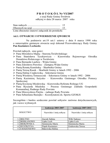 P R O T O K Ó Ł Nr VI/2007 z sesji Rady Gminy Świdwin odbytej w dniu 28 marca 2007 roku Stan radnych ................................................... 15 Obecnych na sesji .......................................... 15 Lista obecności stanowi załącznik do protokołu Ad.1. OTWARCIE I STWIERDZENIE QWORUM Na podstawie art.19 ust.1 ustawy z dnia 8 marca 1990 roku o samorządzie gminnym otwarcia sesji dokonał Przewodniczący Rady Gminy Pan Kazimierz Lechocki. Powitał radnych, oraz gości: Pana Mirosława Majkę - Starostę Świdwińskiego Pana Stanisława Tyszkiewicza – Kierownika Rejonowego Ośrodka Doradztwa Rolniczego w Świdwinie Pana Bernarda Laufera – Wójta Gminy Pana Zdzisława Pawelca – Zastępcę Wójta Gminy Panią Renatę Kamińską – Skarbnika Gminy Panią Teresą Rusek – Skarbnik Gminy w latach 1992 – 2006 Panią Halinę Czajkowską – Sekretarza Gminy Panią Wiesławę Tomaszczuk – Sekretarza Gminy w latach 1992 – 2006 Panią Kazimierę Seżysko – Kierownika Gminnego Ośrodka Pomocy Społecznej Panią Krystynę Miodowską – Kierownika Referatu Rolnego UG Pana Ryszarda Miedzika – Prezesa Gminnego Zakładu Gospodarki Komunalnej, Radnego Rady Powiatu Pana Mieczysława Patyka – radnego Rady Powiatu Pana Sebastiana Basiejko – Koordynatora ds. Sportu GZOKiS Szczególnie i bardzo serdecznie powitał sołtysów zarówno dotychczasowych, jak i nowo wybranych SOŁECTWO 1. 2. 3. 4. 5. BEŁTNO BERKANOWO BIERZWNICA BYSTRZYNA CIESZENIEWO kadencja 2003-2007 kadencja 2007-2011 Nazwisko i imię sołtysa Nazwisko i imię sołtysa Zaczek Sabina Lipka Lech Siminiecka Maria Piątek Kazimierz Bukowska Halina Wilk Tadeusz Lipka Lech Siminiecka Maria Grabowska Teresa 2 6. 7. 8. 9. 10. 11. 12. 13. 14. 15. 16. CIESZYNO KLUCZKOWO KROSINO LEKOWO ŁĄKOWO NIEMIERZYNO OPARZNO PRZYBYSŁAW ROGALINO RUSINOWO SŁAWA 17. SMARDZKO 18. ŚWIDWINEK Skibiński Edward Kozubowski Krzysztof Leske Otto Świątczak Maria Pawlonka Ryszard Czerniawko Henryk Błażejczyk Irena Maksiak Jadwiga Bożek Krzysztof Bieńczak Adam Markiewicz Wojciech Szalkiewicz Eugeniusz Żubert Andrzej Skibiński Edward Kępa Adam Leske Otto Świątczak Maria Pawlonka Ryszard Chmielewska Bronisława Wróblewska Beata Maksiak Jadwiga Lachiewicz Władysław Bieńczak Adam wybory w dniu 29 marca (jutro) Kaniuk Marian Żubert Andrzej Ad.2. ZATWIERDZENIE PROTOKOŁU Z OSTATNIEJ SESJI Pan Przewodniczący poinformował, że protokół z ostatniej sesji wyłożony był do wglądu w Biurze Rady. Uwag nie wniesiono. Radni w głosowaniu jawnym protokół przyjęli jednogłośnie Ad.3. PRZYJĘCIE PORZĄDKU OBRAD Przewodniczący Rady Pan Kazimierz Lechocki przedstawił propozycję porządku obrad. Innych propozycji nie było. W głosowaniu jawnym radni propozycję porządku obrad przyjęli jednogłośnie, a przedstawia się następująco: 1. 2. 3. 4. 5. 6. 7. 8. 9. 10. 11. 12. Otwarcie i stwierdzenie qworum Zatwierdzenie protokołu z ostatniej sesji Przyjęcie porządku obrad Interpelacje radnych Sprawozdanie Przewodniczących Komisji Rady Gminy z prac w okresie między sesjami „Czas dla Samorządów” Podsumowanie inwestycji – hala sportowa Dyskusja Podjęcie uchwał Odpowiedzi na interpelacje i zapytania Wolne wnioski Zakończenie Ad.4. INTERPELACJE RADNYCH - nie było - 3 Ad.5. SPRAWOZDANIE PRZEWODNICZĄCYCH KOMISJI Z PRAC W OKRESIE MIĘDZY SESJAMI Pani Halina Cybul – Przewodnicząca Komisji Rewizyjnej – W okresie międzysesyjnym Komisja dokonała kontroli Gminnego Zespołu Oświaty, Kultury i Sportu. Dotyczyła ona wydatków na sport pod kątem podpisanych umów z klubami sportowymi na 2006 rok jak również wynajmu autobusów tj. zasad pobieranych opłat od tych klubów i innych za 2006 rok. Informacji udzielali Pan Sebastian Basiejko Koordynator ds. Sportu GZOKiS i Pan Mieczysław Patyk Specjalista ds. Technicznej Obsługi Szkół. Komisja potwierdza działalność klubów zgodnie z ustawą z Zarządzeniem Wójta Gminy. W 2006 roku kluby rozliczyły się z przydzielonych środków. Wyjazdy na mecze i inne imprezy sportowe akceptowane są przez Wójta Gminy lub Zastępcę Wójta. Rozliczenie następuje na podstawie kart drogowych tj. z ilości przejechanych kilometrów i godzin pracy kierowcy. Gmina nie prowadzi działalności zarobkowej za wynajem autobusów. Komisja dokonała również kontroli w zakresie wykonania budżetu gminy za rok 2006. Kontrolą objęto I. Zgodność planu budżetowego i prawidłowość dokonywanych zmian w budżecie II. Realizacja dochodów III. Wykonanie wydatków IV. Zobowiązania gminy V. Należności gminy VI. Prowadzenie rachunkowości budżetu VII. Zgodność sprawozdań z rachunkowością VIII. Zabezpieczenie interesów gminy w świetle obrotu cywilnego Wyjaśnień w trakcie kontroli udzielali: mgr Bernard Laufer – Wójt Gminy mgr Renata Kamińska – Skarbnik Gminy Protokół z przeprowadzonej kontroli - do wglądu w aktach Komisji Rewizyjnej w Biurze Rady Gminy. Przewodniczący Komisji Oświaty, Kultury, Zdrowia, Sportu i Etyki Radnych – Pan Otto Leske – W okresie między sesjami Komisja spotkała się jeden raz. Komisja zapoznała się z propozycją kalendarza imprez masowych na 2007 rok, planami pracy świetlic gminnych w roku 2007 oraz propozycją wykorzystania nowo wybudowanej hali sportowej przy Zespole Szkół w Lekowie. 4 Pan Ryszard Pawlonka – Przewodniczący Komisji Rolnictwa, Leśnictwa, Ochrony Środowiska, Bezpieczeństwa i Przestrzegania Prawa poinformował, że Komisja odbyła jedno posiedzenie z udziałem przedstawicieli PSP i OSP na temat bezpieczeństwa publicznego i przeciw pożarowego na terenie gminy. Ad.6. „CZAS DLA SAMORZĄDÓW” Głos kolejno zabrali: Sołtys Lekowa Pani Maria Świątczak: naprawić drogę dojazdową do Zespołu Szkół w Lekowie. Została zniszczona przez ciężkie pojazdy dowożące materiały potrzebne do budowy hali sportowej. Pan Władysław Lachiewicz -Sołtys Rogalina: w miejscowości Rogalino została sprzedana dział