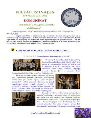 NIEZAPOMINAJKA nr 9 /2012 z 22.11.2012 KOMUNIKAT Pomorskiej Chorągwi Harcerek „Matecznik” wydanie specjalne z okazji Konferencji Organizacji Harcerek ZHR „Trzymaj Kurs!” WITAJCIE! Zapraszamy Was do zapoznania się z wieściami z naszej chorągwi, czyli naszą Matecznikową Niezapominajką. W tym numerze dowiecie się, co w Matecznikowej trawie zapiszczało, co planujemy już niebawem, komu będziemy śpiewać gromkie 100 lat… ale nie tylko. Czeka na Was również podsumowanie Organizacji Harcerek w liczbach, a dla uważnych Czytelników – konkurs. Zatem miłej lektury! Trzymajcie kurs! CO W MATECZNIKOWEJ TRAWIE ZAPISZCZAŁO… 10.11.2012 IV Festiwal Piosenki Harcerskiej „NA STRYCHU” W sobotę 10 listopada odbył się już czwarty Festiwal Piosenki Harcerskiej „Na Strychu”, tym razem w Matemblewie. Udział w akcji wzięło 8 zespołów i także zaszczyciła nas swoją obecnością dość liczna widownia. Występy oceniało dumne Jury w składzie: Beata Kochmańska, Bolesław Pająk oraz Piotr Wojciechowski. Pierwszą kategorią, w jakiej zmierzyły się zespoły była „Zapomniane piosenki harcerskie”. Usłyszeliśmy utwory takie jak: „Szara Lilijka”, „Tak jak ptaki”, „Gwiazdki”, „Ptaki ptakom”, „Koniec”, ale jednak niepokonane zostały zespoły „Szpaki” z 9 GDH „Gniazdo” z piosenką „Harcerska Miłość” i zespół „The Wolfs” z 28 GDH „Wilki” z piosenką „Jak dobrze nam”, którzy otrzymali wspólną Złotą Nutę w tej kategorii. Pomiędzy występami odbywał się turniej „Jaka to melodia?”, polegający na tym, że każdy z 3 uczestników miał podać ilość nut, po jakiej chce odgadnąć piosenkę. Pierwszeństwo miała osoba, która wybrała najmniejszą ilość. Po rozstrzygnięciu danej konkurencji cała sala śpiewała piosenkę. Oczywiście wygrani zawsze byli odpowiednio nagradzani. Teleturniej prowadzili Agata http://trzymajkurs.blog.pl/informacje/ Wasilczuk, Marcin Szczypior oraz Jacek Pawlak, którzy także sumiennie wykonywali każdy utwór. Drugą kategorią były „Złote polskie przeboje”. Usłyszeć mogliśmy między innymi hity: „Konik na biegunach” w wykonaniu zespołu Narwale z 17 GDH „Cardiaca”, „Nie bądź taki szybki Bill” w wykonaniu Szpaków z 9 GDH „Gniazdo”, „Nie polubię Cię”, którą dumnie odśpiewały zuchenki z Całap Ytsbers oraz „Zawsze z Tobą chciałbym być” w wykonaniu Więźbulek. Złote Nuty w tej kategorii zdobyły zuchenki z 17 GGZ „Królestwo Konwalii” z piosenką „Laleczka” oraz gdyński zespół „W Razie Czego” z piosenką „Ktoś mnie pokochał”. Nie można oczywiście zapomnieć o nagrodzie publiczności i przyznanej Zielonej Nucie, którą zdobył zespół „The Wolfs”. Zaśpiewali piosenkę „Mamona” i widać najbardziej spodobali się widzom. Wyglądali zabawnie, a ich występowi towarzyszyły niezapomniane efekty specjalne. Poza konkurencją gościnnie wystąpił zespół Caliestical Dust w repertuarze „Smells like teen spilit” - Nirvana oraz „With or without you” – U2. Występy oczywiście zostały nagrodzone gromkimi brawami. Na końcu sali był także mały bufet, który zorganizowała 9 GDH „Gniazdo”. Były pyszne ciasta i gofry, które można było nabyć za drobną opłatą. Wszyscy byli zachwyceni, festiwal był świetnie zorganizowany, zespoły dobrze przygotowane, dlatego wszystkim się podobało. Już nie możemy doczekać się kolejnego! och. Gosia Łyjak zastępowa z 2 GHH-ek „Morena” 10.11.2012 Zobowiązania Instruktorskie 10 listopada, godzina 20:30. Przed kościołem w Matemblewie stoi już Ula Kijanko, Asia Baj, Julka Łoboda, Zosia Girucka oraz Natalia Osowska. Za chwilę złożą Zobowiązanie Instruktorskie. Jednak zanim to nastąpi Becia (tak naprawdę to dzięki niej to ognisko w ogóle się paliło!) wraz z Natalią i Olą (dwie zuchmistrzynie, ale przecież ktoś musi iść do lasu po drewno…) rozpaliły ognisko. Wszystkie stanęłyśmy naokoło ognia. Atmosfera zrobiła się niezwykle tajemnicza. Po złożeniu Zobowiązań nadszedł czas na powitanie w gronie instruktorek - wręczanie pakietów startowych, a w nich najbardziej potrzebnych rzeczy dla każdej instruktorki. Warto dodać, że dh. Kasia Dryjer była na zobowiązaniu po raz pierwszy w nowej funkcji - jako sekretarz komisji . pwd. Aleksandra Kondraciuk http://trzymajkurs.blog.pl/czy-wiesz-ze/ drużynowa 40 Gdyńskiej Gromady Zuchowej "Źródlane Rusałki" 11.11.2012 Parada z okazji Święta Niepodległości w Gdańsku Przygotowania, jak co roku, rozpoczęły się zaraz po wakacjach, jako że ZHR jest współorganizatorem Gdańskiej Parady Niepodległości wespół ze Stowarzyszeniem Społeczny Urząd Miasta - SUM. Koordynatorem działań w sztabie z naszego ramienia był pwd. Łukasz Kopeć hufcowy Widma. Harcerki i harcerze w tym roku odpowiadali za ustawienie i sprawny przemarsz parady, kolportaż ponad 7 tysięcy biało-czerwonych flag, balonów, wiatraczków, wpinek z logo ZHR oraz opiekę nad częścią grup rekonstrukcyjnych. W tym roku dzięki licznemu przybyciu gromad zuchowych grupa pod flagą ZHR uczestnicząca w przemarszu osiągnęła rekordową liczbę ponad 300 osób! Zostało to zauważone i docenione przez Gdańszczan. Osobną akcją było nocne zdobienie klombu wokół pomnika Sobieskiego - historycznego miejsca manifestacji patriotycznych w Gdańsku. Efekt był prawdziwie godny, za co należą się szczególne podziękowania zjednoczonym siłom instruktorsko-wędrowniczym pod czujnym okiem hm. Roberta Mogiełki. Jeszcze Polska nie zginęła, póki my żyjemy! Jeżeli chodzi o "Elfy ze Słonecznej Krainy", jak i "Leśne Duszki" oraz inne gromady zuchowe z Gdańska - chyba śmiało można powiedzieć, że są one stałymi bywalcami corocznej Parady Niepodległości. W tym roku jednak liczba wszystkich zuchów była zaskakująca! Ludzie oglądający paradę zostali zalani morzem żółtych, zielonych,