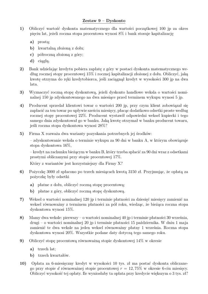 Zestaw 9 – Dyskonto 1) Obliczyć wartość dyskonta matematycznego dla wartości początkowej 100 jp za okres pięciu lat, jeżeli roczna stopa procentowa wynosi 8% i bank stosuje kapitalizację a) prostą; b) kwartalną złożoną z dołu; c) półroczną złożoną z góry; d) ciągłą. 2) Bank udzielając kredytu pobiera zapłatę z góry w postaci dyskonta matematycznego według rocznej stopy procentowej 15% i rocznej kapitalizacji złożonej z dołu. Obliczyć, jaką kwotę otrzyma do ręki kredytobiorca, jeśli zaciągnął kredyt w wysokości 300 jp na dwa lata. 3) Wyznaczyć roczną stopę dyskontową, jeżeli dyskonto handlowe weksla o wartości nominalnej 150 jp zdyskontowanego na dwa miesiące przed terminem wykupu wynosi 5 jp. 4) Producent sprzedał klientowi towar o wartości 200 jp, przy czym klient zobowiązał się zapłacić za ten towar po upływie sześciu miesięcy, płacąc dodatkowo odsetki proste według rocznej stopy procentowej 22%. Producent wystawił odpowiedni weksel kupiecki i tego samego dnia zdyskontował go w banku. Jaką kwotę otrzymał w banku producent towaru, jeśli roczna stopa dyskontowa wynosi 28%? 5) Firma X rozważa dwa warianty pozyskania potrzebnych jej środków: – zdyskontowanie weksla o terminie wykupu za 90 dni w banku A, w którym obowiązuje stopa dyskontowa 16%, – kredyt na rachunku bieżącym w banku B, który trzeba spłacić za 90 dni wraz z odsetkami prostymi obliczanymi przy stopie procentowej 17%. Który z wariantów jest korzystniejszy dla Firmy X? 6) Pożyczkę 3000 zł spłacono po trzech miesiącach kwotą 3150 zł. Przyjmując, że opłatą za pożyczkę były odsetki a) płatne z dołu, obliczyć roczną stopę procentową; b) płatne z góry, obliczyć roczną stopę dyskontową. 7) Weksel o wartości nominalnej 120 jp i terminie płatności za dziesięć miesięcy zamienić na weksel równoważny z terminem płatności za pół roku, wiedząc, że bieżąca roczna stopa dyskontowa wynosi 15%. 8) Mamy dwa weksle: pierwszy – o wartości nominalnej 40 jp i terminie płatności 30 września, drugi – o wartości nominalnej 20 jp i terminie płatności 15 października. W dniu 1 maja zamienić te dwa weksle na jeden weksel równoważny płatny 1 września. Roczna stopa dyskontowa wynosi 20%. Wszystkie podane daty dotyczą tego samego roku. 9) Obliczyć stopę procentową równoważną stopie dyskontowej 14% w okresie a) trzech lat; b) trzech kwartałów. 10) Opłata za 6-miesięczny kredyt w wysokości 10 tys. zł ma postać dyskonta obliczanego przy stopie d równoważnej stopie procentowej r = 12, 75% w okresie 6-ciu miesięcy. Obliczyć wysokość tej opłaty. Ile wyniosłaby ta opłata przy kredycie większym o 3 tys. zł?