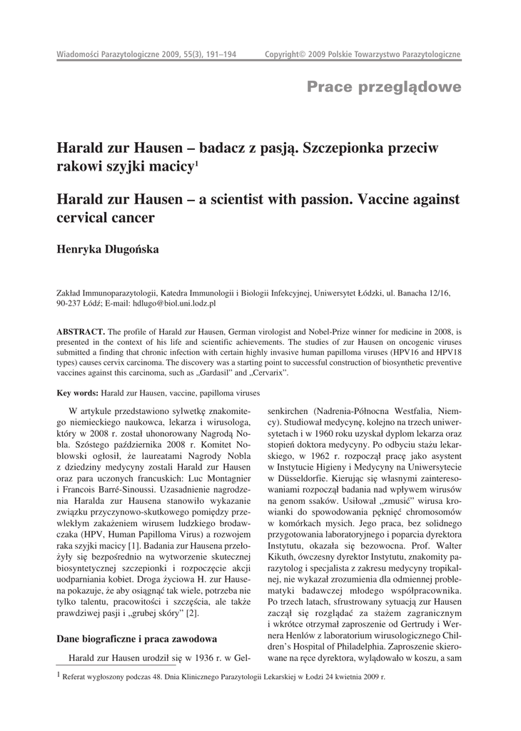 Wiadomoœci Parazytologiczne 2009, 55(3), 191–194 Copyright© 2009 Polskie Towarzystwo Parazytologiczne Prace przeglądowe Harald zur Hausen – badacz z pasją. Szczepionka przeciw rakowi szyjki macicy1 Harald zur Hausen – a scientist with passion. Vaccine against cervical cancer Henryka Długońska Zakład Immunoparazytologii, Katedra Immunologii i Biologii Infekcyjnej, Uniwersytet Łódzki, ul. Banacha 12/16, 90-237 Łódź; E-mail: [email protected] ABSTRACT. The profile of Harald zur Hausen, German virologist and Nobel-Prize winner for medicine in 2008, is presented in the context of his life and scientific achievements. The studies of zur Hausen on oncogenic viruses submitted a finding that chronic infection with certain highly invasive human papilloma viruses (HPV16 and HPV18 types) causes cervix carcinoma. The discovery was a starting point to successful construction of biosynthetic preventive vaccines against this carcinoma, such as „Gardasil” and „Cervarix”. Key words: Harald zur Hausen, vaccine, papilloma viruses W artykule przedstawiono sylwetkę znakomitego niemieckiego naukowca, lekarza i wirusologa, który w 2008 r. został uhonorowany Nagrodą Nobla. Szóstego października 2008 r. Komitet Noblowski ogłosił, że laureatami Nagrody Nobla z dziedziny medycyny zostali Harald zur Hausen oraz para uczonych francuskich: Luc Montagnier i Francois Barré-Sinoussi. Uzasadnienie nagrodzenia Haralda zur Hausena stanowiło wykazanie związku przyczynowo-skutkowego pomiędzy przewlekłym zakażeniem wirusem ludzkiego brodawczaka (HPV, Human Papilloma Virus) a rozwojem raka szyjki macicy [1]. Badania zur Hausena przełożyły się bezpośrednio na wytworzenie skutecznej biosyntetycznej szczepionki i rozpoczęcie akcji uodparniania kobiet. Droga życiowa H. zur Hausena pokazuje, że aby osiągnąć tak wiele, potrzeba nie tylko talentu, pracowitości i szczęścia, ale także prawdziwej pasji i „grubej skóry” [2]. Dane biograficzne i praca zawodowa Harald zur Hausen urodził się w 1936 r. w Gel- senkirchen (Nadrenia-Północna Westfalia, Niemcy). Studiował medycynę, kolejno na trzech uniwersytetach i w 1960 roku uzyskał dyplom lekarza oraz stopień doktora medycyny. Po odbyciu stażu lekarskiego, w 1962 r. rozpoczął pracę jako asystent w Instytucie Higieny i Medycyny na Uniwersytecie w Düsseldorfie. Kierując się własnymi zainteresowaniami rozpoczął badania nad wpływem wirusów na genom ssaków. Usiłował „zmusić” wirusa krowianki do spowodowania pęknięć chromosomów w komórkach mysich. Jego praca, bez solidnego przygotowania laboratoryjnego i poparcia dyrektora Instytutu, okazała się bezowocna. Prof. Walter Kikuth, ówczesny dyrektor Instytutu, znakomity parazytolog i specjalista z zakresu medycyny tropikalnej, nie wykazał zrozumienia dla odmiennej problematyki badawczej młodego współpracownika. Po trzech latach, sfrustrowany sytuacją zur Hausen zaczął się rozglądać za stażem zagranicznym i wkrótce otrzymał zaproszenie od Gertrudy i Wernera Henlów z laboratorium wirusologicznego Children’s Hospital of Philadelphia. Zaproszenie skierowane na ręce dyrektora, wylądowało w koszu, a sam 1 Referat wygłoszony podczas 48. Dnia Klinicznego Parazytologii Lekarskiej w Łodzi 24 kwietnia 2009 r. 192 zainteresowany dowiedział się o nim po kilku dniach. Szczęśliwie odnalazł w odpadkach cenny list i wyemigrował do Ameryki. W laboratorium Henlów włączył się w prace nad onkogennymi wirusami Epsteina-Barr i SV40 (Simian Vacuolating), udoskonalił swój warsztat badawczy i rozpoczął badania nad wirusami ludzkich brodawczaków. Kontynuował je po powrocie do Niemiec, pracując kolejno na Uniwersytecie w Würzburgu, Erlangen-Norymberdze i Freiburgu oraz od 1983 r. w Niemieckim Centrum Badań nad Rakiem w Heidelbergu, którym kierował przez 20 lat. W 2003 roku odszedł na emeryturę, chociaż pracy naukowej nie zaprzestał do dziś [3]. W latach 80. ubiegłego wieku H. zur Hausen potwierdził wielokrotnie, że powodem raka szyki macicy jest długotrwałe zakażenie określonymi serotypami wirusa HPV. Należy dodać, że w tamtym czasie uważano, iż czynnikiem etiologicznym tego nowotworu jest wirus herpes t.2. Harald zur Hausen wraz ze współpracownikami pozostawał w swoim przekonaniu osamotniony. Środowisko naukowe ignorowało jego wyniki, przychylając się do wcześniejszych ustaleń na temat etiologii tego schorzenia. Niektórzy wirusolodzy uparcie demonstrowali własne dane, wskazujące na wirusa herpes t.2 jako przyczynę raka szyjki macicy. W 1974 roku, na kongresie w USA organizatorzy umieścili referat zur Hausena bezpośrednio po doniesieniu naukowca amerykańskiego, który zakomunikował, że z próbek raka szyki macicy wyizolował 40% genomu wirusa herpes 2. Wystąpienie zur Hausena nie zyskało aprobaty głuchej i milczącej sali [4]. Wirus HPV Wirus HPV należy do nowo wyłonionej rodziny wirusów Papillomaviridae. Obejmuje ona wirusy kuliste o średnicy 40–55 nm, nieosłonkowe. Kapsyd, o symetrii ikozaedralnej, jest zbudowany z 3 białek strukturalnych, które tworzą 72 kapsomery i otaczają genom, mający postać jednej kolistej cząsteczki superskręconego dwuniciowego DNA. W genomie można wyróżnić dwa regiony kodujące: wczesny (E) i późny (L). Region E koduje białka enzymatyczne i regulatorowe, z których trzy mają właściwości stymulujące wzrost komórek i transformację nowotworową. E5 upośledza prezentację antygenów wirusa na powierzchni zakażonej komórki i najprawdopodobniej pełni swą funkcję tylko we wczesnych stadiach ekspansji zakażonego klonu komórek. Białko E6 wiąże się z białkiem p53, pozba- H. D³ugoñska wiając komórki kontroli cyklu replikacyjnego sprawowanej przez p53. Białko E7 wiąże się natomiast z produktem genu Rb (pRb) i pokrewnymi białkami, uczynniając wiele białek zaangażowanych w syntezę DNA, wejście w fazę S cyklu komórkowego i niekontrolowan