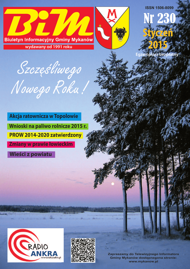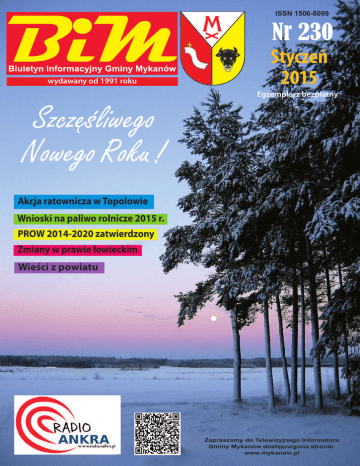 ISSN 1506-8099 Nr 230 wydawany od 1991 roku Styczeń 2015 Egzemplarz bezpłatny Szczęśliwego Nowego Roku ! Akcja ratownicza w Topolowie Wnioski na paliwo rolnicze 2015 r. PROW 2014-2020 zatwierdzony Zmiany w prawie łowieckim Wieści z powiatu Zapraszamy do Telewizyjnego Informatora Gminy Mykanów dostępnegona stronie: www.mykanow.pl str. 18 FERIE w GOK-u Serdecznie zapraszamy dzieci wieku od 6 do 9 lat na ferie w GOK-u w Mykanowie. Zajęcia organizowane będą od 9 do 14 lutego. W programie: warsztaty taneczno ruchowe z elementami tańca ludowego, spektakl teatralny poprzedzony warsztatami, zajęcia plastyczne oraz bal karnawałowy. Udział w zajęciach jest bezpłatny a zapisy przyjmujemy do 5 lutego w Gminnym Ośrodku Kultury lub telefonicznie 034 374 00 42 BiM Biuletyn Informacyjny Gminy Mykanów Miesięcznik Samorządowy ISSN 1506-8099 nr 230 STYCZEŃ 2015 roku Siedziba redakcji: Gminny Ośrodek Kultury w Mykanowie 42-233 Mykanów ul. Samorządowa 1A tel. 34 374 00 42, fax: 034 328 80 37 e-mail: [email protected] www.gokmykanow.pl Wydawca: Rada Gminy Mykanów W numerze m.in.: Informacja Wójta Gminy Mykanów . . . . . . . . . . . . . . . . .s. 4 Katastrofa w Topolowie - relacje . . . . . . . . . . . . . . . . . . . .s. 5 Wieści z Powiatu . . . . . . . . . . . . . . . . . . . . . . . . . . . . . . . . .s. 6 Akcja charytatywna w ZS w Starym Cykarzewie . . . . . . .s. 9 Uwaga tlenek węgla - czad! . . . . . . . . . . . . . . . . . . . . . . .s. 10 Bezdomne zwierzeta do adopcji . . . . . . . . . . . . . . . . . . . .s. 11 Zasady składania wniosków o dopłaty za paliwo . . . . . .s. 12 Dzikie lodowiska - niebezpieczeństwa . . . . . . . . . . . . . . .s. 13 Nowy PROW zatwierdzony . . . . . . . . . . . . . . . . . . . . . . .s. 14 Projekt zmian w prawie łowieckim . . . . . . . . . . . . . . . . . .s. 15 Logopedia - badania . . . . . . . . . . . . . . . . . . . . . . . . . . . . .s. 16 Sukcesy w Taekwondo . . . . . . . . . . . . . . . . . . . . . . . . . . .s. 18 Cennik ogłoszeń i rozmiary modułów reklamowych odpowiednio na stronach: Redaktor naczelny: Adriana Moroń Społeczne Kolegium Redakcyjne Sylwia Kwiecień, Urszula Wróbel, Szymon Migoń, Konrad Kokoszka, Ewa i Jarosław Polczykowie, Edyta Bauć, Adam Wochal, Artur Wasil, Krzysztof Polewski Opracowanie graficzne okładki: Ewa Polczyk CZARNO-BIAŁE - wielkość modułu: 58 x 87 mm (pion) 15 zł 87 x 58 mm (poziom) 15 zł wielokrotność x 2 30 zł wielokrotność x 3 45 zł Skład: Ewa i Jarosław Polczykowie 1/2 strony 60 zł Nakład: 1000 sztuk pełna strona 120 zł Materiały informacyjne do kolejnego wydania należy dostarczać do 25 dnia danego miesiąca. Redakcja zastrzega sobie prawo dokonywania zmian i skracania dostarczonych materiałów oraz nadesłanej korespondencji. Za treść ogłoszeń i reklam redakcja i wydawca nie odpowiadają. 2015 styczeń KOLOR 3 i 4 strona- wielkość modułu: 102 x 145 mm (1/4 strony) 60 zł 210 x 145 mm (1/2 strony) 120 zł 210 x 290 mm (pełna strona) 240 zł 3 Wójt Gminy Mykanów informuje Dariusz Pomada Straż Pożarna w Lubojnie wzbogaciła się o nowy samochód średni. Koszt całkowity jego zakupu to 670 000 zł, z czego dotacja gminy wyniosła 350000 zł, ZG ZOSP zadeklarował dofinansowanie w wysokości 150000 zł i to zrealizował. Jednocześnie OSP Lubojna posiadała promesę z Komendy Głównej PSP również w wysokości 150 000 zł - nie doszła do skutku, mimo że samochód został już wykonany. Gmina zobowiązała się do uregulowania powyższej zaległości. Trwają rozmowy w sprawie zrekompensowania tej kwoty w formie dotacji przy zakupie kolejnego samochodu. Samochód specjalistyczny marki Volkswagen Transporter został zakupiony dla Gminnego Ośrodka Pomocy Społecznej do przewożenia osób niepełnosprawnych na badania i zabiegi rehabilitacyjne. Samochód może zabrać jednocześnie aż 8 osób, posiada windę przystosowaną do podnoszenia chorych na wózkach inwalidzkich. Po złożeniu tylnych siedzeń samochodem można przewozić dwóch chorych na wózkach inwalidzkich. Proszę mieszkańców o zgłaszanie potrzeb w tym zakresie do Gminnego Ośrodka Pomocy Społecznej. Straż Gminna Wójt Gminy Kłomnice wypowiedział porozumienie w sprawie utrzymania wspólnej straży gminnej. Na tej podstawie od dnia 1 lutego 2015r. zostanie zmniejszone zatrudnienie o 3 strażników z terenu Kłomnic. Obecnie trwa dyskusja nad przyszłością straży w naszej gminie. Radni zdecydują, czy straż będzie dalej działać, czy zostanie zlikwidowana. Na sesji Rady Gminy w lutym przedstawię projekt uchwały o jej likwidacji. Uważam, że nie stać nas na jej utrzymanie, a po wprowadzeniu przepisu nakazującego używanie przez straż gminną tylko radarów stacjonarnych, zniknie prawie zupełnie możliwość pozyskiwania dochodów z mandatów za przekroczenie prędkości. Pojawiła się wprawdzie nowa możliwość pozyskiwania dochodów z mandatów za przejazd na skrzyżowaniu na czerwonym świetle, jednak Główny Inspektor Transportu Drogowego nie wyraził zgody na zainstalowanie kamer rejestrujących naruszenie przepisów ruchu drogowego polegających na niestosowaniu się do sygnałów świetlnych na skrzyżowaniu drogi powiatowej 1059S Mykanów – Kościelec z droga krajową nr 1. Ruszyła budowa hali sportowej przy Zespole Szkół w Mykanowie. Koszt całkowity wyniesie - 3674010 zł z czego w roku 2015 – 2 mln zł. Nowoczesna hala będzie miała wymiary 38 x 52 m, w tym boisko ponad 24 x 45 m. Widownia pomieści 350 kibiców. Oprócz zaplecza technicznego i socjalnego nasi sportowcy będą mieli do dyspozycji siłownię z sauną. Hala będzie połączona z budynkiem szkoły łącznikiem o długości 11 m. Wykonawcą inwestycji jest Firma PHU SZYMBUD z Widzowa koło Kruszyny. Termin zakończenia inwestycji – lato 2016 r. Wtedy nasi sportowcy, którzy już teraz osiągają nieprzeciętne wyniki będą mogli naprawdę rozwinąć skrzydła. Trwa projektowanie rozbudowy pom