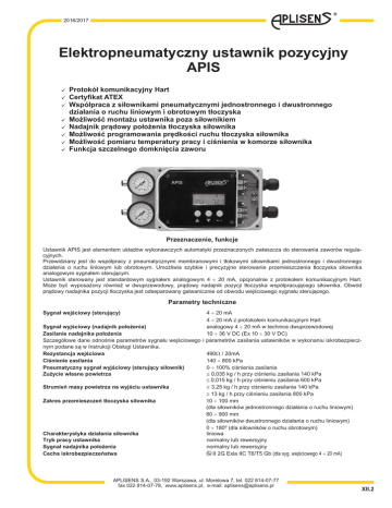 2016/2017 Elektropneumatyczny ustawnik pozycyjny APIS [ Protokó³ komunikacyjny Hart [ Certyfikat ATEX [ Wspó³praca z si³ownikami pneumatycznymi jednostronnego i dwustronnego dzia³ania o ruchu liniowym i obrotowym t³oczyska [ Mo¿liwoœæ monta¿u ustawnika poza si³ownikiem [ Nadajnik pr¹dowy po³o¿enia t³oczyska si³ownika [ Mo¿liwoœæ programowania prêdkoœci ruchu t³oczyska si³ownika [ Mo¿liwoœæ pomiaru temperatury pracy i ciœnienia w komorze si³ownika [ Funkcja szczelnego domkniêcia zaworu Przeznaczenie, funkcje Ustawnik APIS jest elementem uk³adów wykonawczych automatyki przeznaczonych zw³aszcza do sterowania zaworów regulacyjnych. Przewidziany jest do wspó³pracy z pneumatycznymi membranowymi i t³okowymi si³ownikami jednostronnego i dwustronnego dzia³ania o ruchu liniowym lub obrotowym. Umo¿liwia szybkie i precyzyjne sterowanie przemieszczenia t³oczyska si³ownika analogowym sygna³em steruj¹cym. Ustawnik sterowany jest standardowym sygna³em analogowym 4 ¸ 20 mA, opcjonalnie z protoko³em komunikacyjnym Hart. Mo¿e byæ wyposa¿ony równie¿ w dwuprzewodowy, pr¹dowy nadajnik pozycji t³oczyska wspó³pracuj¹cego si³ownika. Obwód pr¹dowy nadajnika pozycji t³oczyska jest odseparowany galwanicznie od obwodu wejœciowego sygna³u steruj¹cego. Parametry techniczne Sygna³ wejœciowy (steruj¹cy) 4¸ 20 mA 4¸ 20 mA z protoko³em komunikacyjnym Hart Sygna³ wyjœciowy (nadajnik po³o¿enia) analogowy 4 ¸ 20 mA w technice dwuprzewodowej Zasilanie nadajnika po³o¿enia 10 ¸ 36 V DC (Ex 10 ¸ 30 V DC) Szczegó³owe dane odnoœnie parametrów sygna³u wejœciowego i parametrów zasilania ustawników w wykonaniu iskrobezpiecznym podane s¹ w Instrukcji Obs³ugi Ustawnika. Rezystancja wejœciowa 490W / 20mA Ciœnienie zasilania 140 ¸ 800 kPa Pneumatyczny sygna³ wyjœciowy (steruj¹cy si³ownik) 0¸ 100% ciœnienia zasilania Zu¿ycie w³asne powietrza L 0,035 kg / h przy ciœnieniu zasilania 140 kPa L 0,015 kg / h przy ciœnieniu zasilania 600 kPa Strumieñ masy powietrza na wyjœciu ustawnika 3 3,25 kg / h przy ciœnieniu zasilania 140 kPa 3 13 kg / h przy ciœnieniu zasilania 800 kPa Zakres przemieszczeñ t³oczyska si³ownika 10 ¸ 100 mm (dla si³owników jednostronnego dzia³ania o ruchu liniowym) 80 ¸ 900 mm (dla si³owników dwustronnego dzia³ania o ruchu liniowym) 0¸ 180º (dla si³owników o ruchu obrotowym) Charakterystyka dzia³ania si³ownika liniowa Tryb pracy ustawnika normalny lub rewersyjny Sygna³ nadajnika po³o¿enia normalny lub rewersyjny Cecha iskrobezpieczeñstwa II 2G Exia IIC T6/T5 Gb (dla syg. wejœciowego 4 ¸ 20 mA) APLISENS S.A., 03-192 Warszawa, ul. Morelowa 7, tel. 022 814-07-77 fax 022 814-07-78, www.aplisens.pl, e-mail: [email protected] XII.2 2016/2017 B³êdy dodatkowe - od zmian ciœnienia zasilania - od zmian temperatury otoczenia < 0,05% / 100kPa 0,15% / 10ºC - dla zakresu temperatur -30 ¸ 60ºC 0,25% / 10ºC - dla zakresów temperatur -40 ¸ -30ºC i 60 ¸ 85ºC - od drgañ w zakresie: 10...60Hz, amplituda < 0,35 mm, 60....500Hz, przyspieszenie 5g Histereza Próg nieczu³oœci Stopieñ ochrony obudowy Masa 0,25% < 0,4% < 0,1% IP 65 wg PN-EN 60529:2003 1,8 kg Warunki pracy Czynnik roboczy powietrze nie zawieraj¹ce py³u, oleju, agresywnych zanieczyszczeñ, cz¹stek sta³ych o wielkoœci powy¿ej 1,5 µm, o wilgotnoœci wzglêdnej takiej, aby temperatura punktu rosy by³a ni¿sza nie mniej ni¿ 10ºC od temperatury otoczenia (wg PN-EN 60654-2:1999) Temperatura otoczenia wykonania bez manometrów wykonania z manometrami -40 ¸ 85ºC -40 ¸ 85ºC (materia³ obudowy i mechanizmu manometrów - stal kwasoodporna) -25 ¸ 65ºC (materia³ obudowy manometrów - stal wêglowa lub kwasoodporna, materia³ mechanizmu manometrów - mosi¹dz) <95% wg PN-EN 60654-3: 1997; klasa VH6 amplituda < 0,35 mm przyspieszenie L 5g dowolna Wilgotnoœæ otaczaj¹cego powietrza Dopuszczalne wibracje 10 ¸ 60Hz, 60 ¸ 500Hz, Pozycja pracy 110 Wymiary gabarytowe 4xM8 49 46 91.9 105 147.5 D³awnica M16x1,5, kabel 4...9 mm. Zewnêtrzny zacisk uziemiaj¹cy APIS-200-... APIS-100-... 2 49 49 2 3 1 1 1 - przy³¹cze zasilania pneumatycznego ustawnika 2, 3 - przy³¹cze si³ownika pneumatycznego 201.5 248.5 Wymiary gabarytowe ustawników APIS-100-... i APIS-200-... XII. 3 APLISENS S.A., 03-192 Warszawa, ul. Morelowa 7, tel. 022 814-07-77 fax 022 814-07-78, www.aplisens.pl, e-mail: [email protected] 91.5 2016/2017 23 4xM8 147.5 46 91.9 105 D³awnica M16x1,5, kabel 4...9 mm. Zewnêtrzny zacisk uziemiaj¹cy APIS-101-... i APIS-151-.... 2 2 49 49 3 1 1 1 - przy³¹cze zasilania pneumatycznego ustawnika 2, 3 - przy³¹cze si³ownika pneumatycznego 201.5 248.5 133 Wymiary gabarytowe ustawników APIS-101-..., APIS-151-..., APIS-201-... i APIS-251... 4xM8 41 49 147.5 4 46 91.9 105 D³awnica M16x1,5, kabel 4...9 mm. APIS-250-... APIS-150-... Zewnêtrzny zacisk uziemiaj¹cy 2 49 49 2 1 1 - przy³¹cze zasilania pneumatycznego ustawnika 2, 3 - przy³¹cze si³ownika pneumatycznego 3 1 201.5 248.5 Wymiary gabarytowe ustawników APIS-150 i APIS-250... APLISENS S.A., 03-192 Warszawa, ul. Morelowa 7, tel. 022 814-07-77 fax 022 814-07-78, www.aplisens.pl, e-mail: [email protected] XII. 4 2016/2017 Schematy po³¹czeñ elektrycznych 1 Sygna³ wejœciowy (steruj¹cy) analogowy 4...20 mA (dowolna polaryzacja sygna³u) 2 Dla wykonañ iskrobezpiecznych parametry wejœciowe wg za³¹cznika Exi pkt 5.1 Instrukcji Obs³ugi Dla wykonañ iskrobezpiecznych parametry wejœciowe wg za³¹cznika Exi pkt 5.1 Instrukcji Obs³ugi przewód w kol. br¹zowym 3 2 1 Sygna³ wejœciowy (steruj¹cy) analogowy 4...20 mA (dowolna polaryzacja sygna³u) Zewnêtrzny przetwornik po³o¿enia 4 przewód w kol. zielonym (bia³ym*) Dla wykonañ iskrobezpiecznych parametry wyjœciowe wg za³¹cznika Exi pkt 5.3 Instrukcji Obs³ugi Dla wykonañ iskrobezpiecznych parametry wejœciowe uk³adu wyjœciowego wg za³¹cznika Exi pkt 5.2 Instrukcji Obs³ugi Sygna³ wyjœciowy (nadajnika po³o¿enia) an