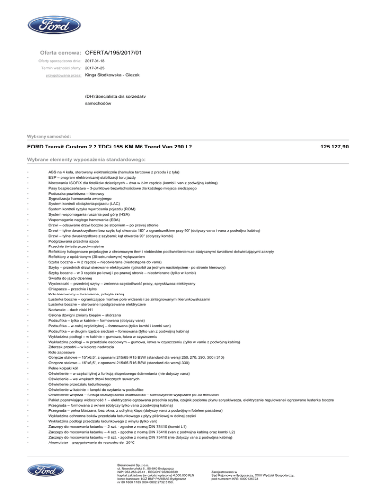 Oferta cenowa: OFERTA/195/2017/01 Ofertę sporządzono dnia: 2017-01-18 Termin ważności oferty: 2017-01-25 przygotowana przez: Kinga Słodkowska - Giezek (DH) Specjalista d/s sprzedaży samochodów Wybrany samochód: FORD Transit Custom 2.2 TDCi 155 KM M6 Trend Van 290 L2 125 127,90 Wybrane elementy wyposażenia standardowego: * ABS na 4 koła, sterowany elektronicznie (hamulce tarczowe z przodu i z tyłu) * ESP – program elektronicznej stabilizacji toru jazdy * Mocowania ISOFIX dla fotelików dziecięcych – dwa w 2-im rzędzie (kombi i van z podwójną kabiną) * Pasy bezpieczeństwa – 3-punktowe bezwładnościowe dla każdego miejsca siedzącego * Poduszka powietrzna – kierowcy * Sygnalizacja hamowania awaryjnego * System kontroli obciążenia pojazdu (LAC) * System kontroli ryzyka wywrócenia pojazdu (ROM) * System wspomagania ruszania pod górę (HSA) * Wspomaganie nagłego hamowania (EBA) * Drzwi – odsuwane drzwi boczne ze stopniem – po prawej stronie * Drzwi – tylne dwuskrzydłowe bez szyb; kąt otwarcia 180° z ogranicznikiem przy 90° (dotyczy vana i vana z podwójna kabiną) * Drzwi – tylne dwuskrzydłowe z szybami; kąt otwarcia 90° (dotyczy kombi) * Podgrzewana przednia szyba * Przednie światła przeciwmgielne * Reflektory halogenowe projekcyjne z chromowym tłem i niebieskim podświetleniem ze statycznymi światłami doświetlającymi zakręty * Reflektory z opóźnionym (30-sekundowym) wyłączaniem * Szyba boczna – w 2 rzędzie – nieotwierana (niedostępna do vana) * Szyby – przednich drzwi sterowane elektrycznie (góra/dół za jednym naciśnięciem - po stronie kierowcy) * Szyby boczne – w 3 rzędzie po lewej i po prawej stronie – nieotwierane (tylko w kombi) * Światła do jazdy dziennej * Wycieraczki – przedniej szyby – zmienna częstotliwość pracy, spryskiwacz elektryczny * Chlapacze – przednie i tylne * Koło kierownicy – 4-ramienne, pokryte skórą * Lusterka boczne – ograniczające martwe pole widzenia i ze zintegrowanymi kierunkowskazami * Lusterka boczne – sterowane i podgrzewane elektrycznie * Nadwozie – dach niski H1 * Osłona dźwigni zmiany biegów – skórzana * Podsufitka – tylko w kabinie – formowana (dotyczy vana) * Podsufitka – w całej części tylnej – formowana (tylko kombi i kombi van) * Podsufitka – w drugim rzędzie siedzeń – formowana (tylko van z podwójną kabiną) * Wykładzina podłogi – w kabinie – gumowa, łatwa w czyszczeniu * Wykładzina podłogi – w przedziale osobowym – gumowa, łatwa w czyszczeniu (tylko w vanie z podwójną kabiną) * Zderzak przedni – w kolorze nadwozia * Koło zapasowe * Obręcze stalowe – 15"x6,5", z oponami 215/65 R15 BSW (standard dla wersji 250, 270, 290, 300 i 310) * Obręcze stalowe – 16"x6,5", z oponami 215/65 R16 BSW (standard dla wersji 330) * Pełne kołpaki kół * Oświetlenie – w części tylnej z funkcją stopniowego ściemniania (nie dotyczy vana) * Oświetlenie – we wnękach drzwi bocznych suwanych * Oświetlenie przedziału ładunkowego * Oświetlenie w kabinie – lampki do czytania w podsufitce * Oświetlenie wnętrza – funkcja oszczędzania akumulatora – samoczynnie wyłączane po 30 minutach * Pakiet poprawiający widoczność 1 – elektrycznie ogrzewana przednia szyba, czujnik poziomu płynu spryskiwacza, elektrycznie regulowane i ogrzewane lusterka boczne * Przegroda – formowana z oknem (dotyczy tylko vana z podwójną kabiną) * Przegroda – pełna blaszana, bez okna, z uchylną klapą (dotyczy vana z podwójnym fotelem pasażera) * Wykładzina ochronna boków przedziału ładunkowego z płyty pilśniowej w dolnej części * Wykładzina podłogi przedziału ładunkowego z winylu (tylko van) * Zaczepy do mocowania ładunku – 2 szt. - zgodne z normą DIN 75410 (kombi L1) * Zaczepy do mocowania ładunku – 4 szt. - zgodne z normą DIN 75410 (van z podwójna kabiną oraz kombi L2) * Zaczepy do mocowania ładunku – 8 szt. - zgodne z normą DIN 75410 (nie dotyczy vana z podwójna kabiną) * Akumulator – przygotowanie do rozruchu do -20°C Bieranowski Sp. z o.o. ul. Nowotoruńska 8 , 85-840 Bydgoszcz NIP: 953-253-25-41 , REGON: 932893539 kapitał zakładowy (w całości opłacony) 4.000.000 PLN konto bankowe: BGŻ BNP PARIBAS Bydgoszcz nr 80 1600 1185 0004 0802 2732 5150. Zarejestrowano w Sąd Rejonowy w Bydgoszczy, XXIII Wydział Gospodarczy, pod numerem KRS: 0000136723 Oferta cenowa: OFERTA/195/2017/01 Ofertę sporządzono dnia: 2017-01-18 Termin ważności oferty: 2017-01-25 przygotowana przez: Kinga Słodkowska - Giezek (DH) Specjalista d/s sprzedaży samochodów * Alternator 150 A * Filtr wody w paliwie z czujnikiem * Gniazda zasilania – 3 X 60 A, zlokalizowane pod cokołem fotela kierowcy * Komputer pokładowy (funkcje licznika czasu, zasięgu, chwilowe i średnie zużycie paliwa, średnia prędkość, temperatura zewnętrzna) * Tempomat – z kołem kierownicy pokrytym skórą i regulowanym ogranicznikiem prędkości (ASLD) * Wskaźnik zmiany biegu * Fotel kierowcy – z regulacją przesuwu, pochylenia oparcia, pochylenia siedziska, wysokości i podparcia kręgosłupa, z podłokietnikiem * Fotel pasażera – podwójny z unoszonym siedziskiem i schowkiem pod fotelem, część środkowa składana do stolika * Tylne fotele – drugi rząd – trzymiejscowy (2 + 1) (kombi i kombi van) * Tylne fotele – drugi rząd – trzymiejscowy ławkowy ze schowkiem pod siedziskami (tylko van z podwójną kabiną) * Tylne fotele – trzeci rząd – trzymiejscowy (2 + 1) (tylko kombi) * cDPF (powlekany filtr cząstek stałych) * Ford Eco Mode (system informujący o ekonomice jazdy) * Radio MyConnection, gniazdo AUX do podłączania zewnętrznych urządzeń muzycznych (w schowku na górze deski rozdzielczej), telefoniczny zestaw głośnomówiący * Dwuobwodowy, wspomaganie z samoczynną regulacją i układem ABS. Hamulce tarczowe z przodu i z tyłu Bluetooth®, z portem USB/iPod® i możliwością sterowania iPoda®,