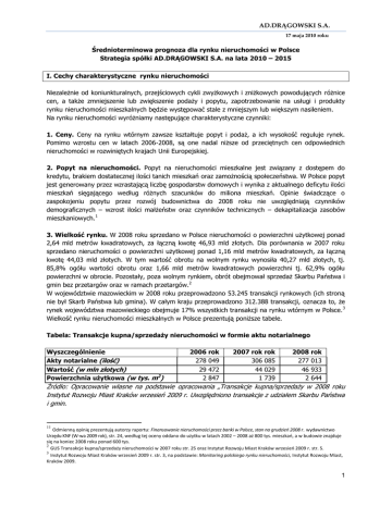 AD.DRĄGOWSKI S.A. 17 maja 2010 roku Średnioterminowa prognoza dla rynku nieruchomości w Polsce Strategia spółki AD.DRĄGOWSKI S.A. na lata 2010 – 2015 I. Cechy charakterystyczne rynku nieruchomości Niezależnie od koniunkturalnych, przejściowych cykli zwyżkowych i zniżkowych powodujących różnice cen, a także zmniejszenie lub zwiększenie podaży i popytu, zapotrzebowanie na usługi i produkty rynku nieruchomości mieszkalnych będzie występować stale z mniejszym lub większym nasileniem. Na rynku nieruchomości wyróżniamy następujące charakterystyczne czynniki: 1. Ceny. Ceny na rynku wtórnym zawsze kształtuje popyt i podaż, a ich wysokość reguluje rynek. Pomimo wzrostu cen w latach 2006-2008, są one nadal niższe od przeciętnych cen odpowiednich nieruchomości w rozwiniętych krajach Unii Europejskiej. 2. Popyt na nieruchomości. Popyt na nieruchomości mieszkalne jest związany z dostępem do kredytu, brakiem dostatecznej ilości tanich mieszkań oraz zamożnością społeczeństwa. W Polsce popyt jest generowany przez wzrastającą liczbę gospodarstw domowych i wynika z aktualnego deficytu ilości mieszkań sięgającego według różnych szacunków do miliona mieszkań. Opinie świadczące o zaspokojeniu popytu przez rozwój budownictwa do 2008 roku nie uwzględniają czynników demograficznych – wzrost ilości małżeństw oraz czynników technicznych – dekapitalizacja zasobów mieszkaniowych.1 3. Wielkość rynku. W 2008 roku sprzedano w Polsce nieruchomości o powierzchni użytkowej ponad 2,64 mld metrów kwadratowych, za łączną kwotę 46,93 mld złotych. Dla porównania w 2007 roku sprzedano nieruchomości o powierzchni użytkowej ponad 1,16 mld metrów kwadratowych, za łączną kwotę 44,03 mld złotych. W tym wartość obrotu na wolnym rynku wynosiła 40,27 mld złotych, tj. 85,8% ogółu wartości obrotu oraz 1,66 mld metrów kwadratowych powierzchni tj. 62,9% ogółu powierzchni w obrocie. Pozostały, poza wolnym rynkiem, obrót obejmował sprzedaż Skarbu Państwa i gmin bez przetargów oraz w ramach przetargów.2 W województwie mazowieckim w 2008 roku przeprowadzono 53.245 transakcji rynkowych (ich stroną nie był Skarb Państwa lub gmina). W całym kraju przeprowadzono 312.388 transakcji, oznacza to, że rynek województwa mazowieckiego obejmuje 17% wszystkich transakcji na rynku wtórnym w Polsce. 3 Wielkość rynku nieruchomości mieszkalnych w Polsce prezentują poniższe tabele. Tabela: Transakcje kupna/sprzedaży nieruchomości w formie aktu notarialnego Wyszczególnienie Akty notarialne (ilość) Wartość (w mln złotych) Powierzchnia użytkowa (w tys. m2) 2006 rok 278 049 29 472 2 847 2007 rok rok 306 085 44 029 1 739 2008 rok 277 013 46 933 2 644 Źródło: Opracowanie własne na podstawie opracowania „Transakcje kupna/sprzedaży w 2008 roku Instytut Rozwoju Miast Kraków wrzesień 2009 r. Uwzględniono transakcje z udziałem Skarbu Państwa i gmin. 11 Odmienną opinię prezentują autorzy raportu: Finansowanie nieruchomości przez banki w Polsce, stan na grudzieo 2008 r. wydawnictwo Urzędu KNF (W-wa 2009 rok), str. 24, według tej oceny oddano do użytku w latach 2002 – 2008 aż 800 tys. mieszkao, a w budowie znajduje się na koniec 2008 roku ponad 600 tys. 2 GUS Transakcje kupna/sprzedaży nieruchomości w 2007 roku str. 25 oraz Instytut Rozwoju Miast Kraków wrzesieo 2009 r. str. 5. 3 Instytut Rozwoju Miast Kraków wrzesieo 2009 r. str. 3, na podstawie: Monitoring polskiego rynku nieruchomości, Instytut Rozwoju Miast, Kraków 2009. 1 AD.DRĄGOWSKI S.A. 17 maja 2010 roku Obrót lokalami mieszkalnymi w województwie mazowieckim stanowi 15,2% obrotu całego rynku krajowego obliczając w stosunku do ilości transakcji (11.809 transakcji w 2008 roku) oraz aż 30,7% rynku krajowego, obliczając w stosunku do wartości transakcji (3.897,69 mln złotych w 2008 roku). Szczególne miejsce na tym rynku zajmuje Warszawa, gdzie przeprowadzono 8,9% wszystkich krajowych transakcji mieszkaniami (6.922 transakcje w 2008 roku) za kwotę stanowiącą 25,8% rynku krajowego, obliczając w stosunku do wartości transakcji (3.271,04 mln złotych). Ponad jedna czwarta całego krajowego rynku lokali mieszkalnych w 2008 roku przypadała na Warszawę. 4 Poniżej tabela obrazująca obrót w 2008 roku w całym kraju. Tabela: Transakcje kupna/sprzedaży lokali mieszkalnych w formie aktu notarialnego Wyszczególnienie Lokale mieszkalne (ilość) Wartość (w mln złotych) Powierzchnia użytkowa (w tys. m2) 2006 rok 67 936 5 309 3 679 2007 rok 65 792 7 329 3 497 2008 rok 77 526 12 682 4 248 Źródło: Opracowanie własne na podstawie opracowania „Transakcje kupna/sprzedaży w 2008 roku” Instytut Rozwoju Miast Kraków wrzesień 2009 r. Uwzględniono transakcje z udziałem Skarbu Państwa i gmin. Obrót budynkami mieszkalnymi w województwie mazowieckim stanowi 11,3% obrotu całego rynku krajowego obliczając w stosunku do ilości transakcji (166 transakcji w 2008 roku) oraz aż 49,3% rynku krajowego, obliczając w stosunku do wartości transakcji (270,39 mln złotych w 2008 roku). Szczególne miejsce na tym rynku zajmuje Warszawa, gdzie przeprowadzono tylko 1,4% wszystkich krajowych transakcji budynkami mieszkalnymi (21 transakcji w 2008 roku) za kwotę stanowiącą 38,3% rynku krajowego, obliczając w stosunku do wartości transakcji (210,04 mln złotych). Ponad jedna trzecia całego krajowego rynku budynków mieszkalnych w 2008 roku przypadała na Warszawę. 5 Poniżej tabela obrazująca obrót w 2008 roku w całym kraju. Tabela: Transakcje kupna/sprzedaży budynków mieszkalnych w formie aktu notarialnego Wyszczególnienie Budynki mieszkalne (ilość) Wartość (w mln złotych) Powierzchnia użytkowa (w tys. m2) 2006 rok 2 478 470 707 2007 rok 1 668 387 257 2008 rok 1 467 549 591 Źródło: Opracowanie własne na podstawie opracowania „Transakcje kupna/sprzedaży w 2008 roku” Instytut Rozwoju Miast Kraków wrzesień 2009 r. Uwzględniono t