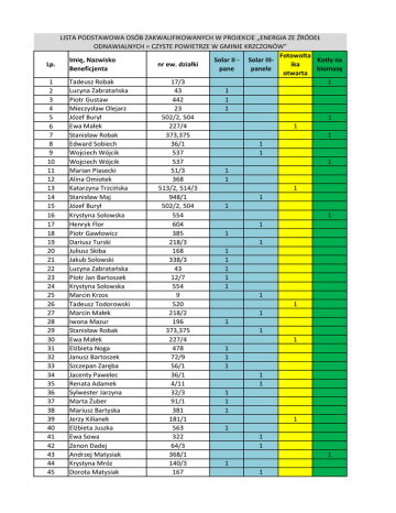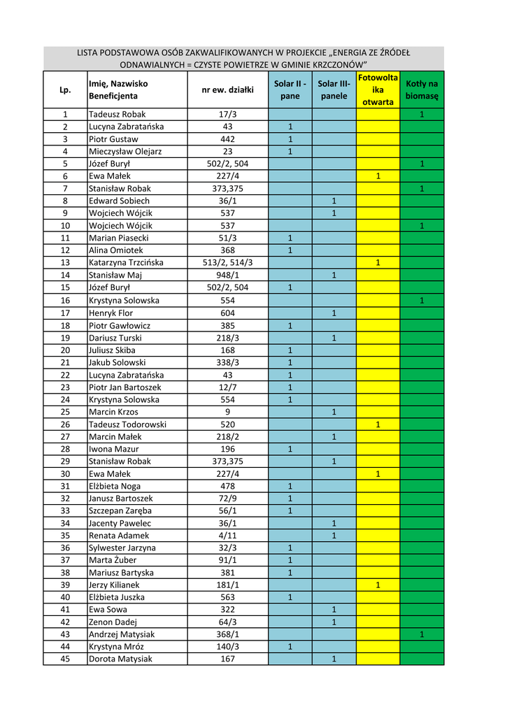 Lp. 1 2 3 4 5 6 7 8 9 10 11 12 13 14 15 16 17 18 19 20 21 22 23 24 25 26 27 28 29 30 31 32 33 34 35 36 37 38 39 40 41 42 43 44 45 LISTA PODSTAWOWA OSÓB ZAKWALIFIKOWANYCH W PROJEKCIE „ENERGIA ZE ŹRÓDEŁ ODNAWIALNYCH = CZYSTE POWIETRZE W GMINIE KRZCZONÓW” Fotowolta Imię, Nazwisko Solar II - Solar IIIKotły na nr ew. działki ika Beneficjenta pane panele biomasę otwarta Tadeusz Robak 17/3 1 Lucyna Zabratańska 43 1 Piotr Gustaw 442 1 Mieczysław Olejarz 23 1 Józef Burył 502/2, 504 1 Ewa Małek 227/4 1 Stanisław Robak 373,375 1 Edward Sobiech 36/1 1 Wojciech Wójcik 537 1 Wojciech Wójcik 537 1 Marian Piasecki 51/3 1 Alina Omiotek 368 1 Katarzyna Trzcińska 513/2, 514/3 1 Stanisław Maj 948/1 1 Józef Burył 502/2, 504 1 Krystyna Solowska 554 1 Henryk Flor 604 1 Piotr Gawłowicz 385 1 Dariusz Turski 218/3 1 Juliusz Skiba 168 1 Jakub Solowski 338/3 1 Lucyna Zabratańska 43 1 Piotr Jan Bartoszek 12/7 1 Krystyna Solowska 554 1 Marcin Krzos 9 1 Tadeusz Todorowski 520 1 Marcin Małek 218/2 1 Iwona Mazur 196 1 Stanisław Robak 373,375 1 Ewa Małek 227/4 1 Elżbieta Noga 478 1 Janusz Bartoszek 72/9 1 Szczepan Zaręba 56/1 1 Jacenty Pawelec 36/1 1 Renata Adamek 4/11 1 Sylwester Jarzyna 32/3 1 Marta Żuber 91/1 1 Mariusz Bartyska 381 1 Jerzy Kilianek 181/1 1 Elżbieta Juszka 563 1 Ewa Sowa 322 1 Zenon Dadej 64/3 1 Andrzej Matysiak 368/1 1 Krystyna Mróz 140/3 1 Dorota Matysiak 167 1 46 47 48 49 50 51 52 53 Piotr Gustaw Monika Sek Mariusz Pawlak Mariusz Pawlak Mirosław Małecki Mirosław Kochaniec Radosław Stachyra Joanna Wilczopolska 442 465/1 228, 12, 8, 84 228, 12, 8, 84 314 342 692/1 58 54 Agnieszka Goncikowska 957/2 55 56 57 58 59 60 61 62 63 64 65 66 67 68 69 70 71 72 73 74 75 76 77 78 79 80 81 82 83 84 85 86 87 88 89 90 91 92 93 94 Monika Mardoń Leszek Szczygielski Ireneusz Flis Ireneusz Flis Sylwia Nastaj Sylwia Nastaj Jarosław Niedźwiedź Bogusław Rząd Jolanta Wójcicka Beata Sulowska Paweł Gustaw Jacek Bratos Renata Maj Renata Maj Michał Bil Adam Rubaszko Dorota Nawłatyna Zbigniew Chrust Maria Kowalik Adam Małek Adam Małek Czesław Pawlak Zofia Klimek Mariusz Łabiga Michał Wójcik Danuta Jędruch Józef Romanek Józef Romanek Wiesław Krasoń Józef Grzebuła Stanisław Mazur Krzysztof Olech Stanisław Borzęcki Paweł Makuła Mazur Ryszard Bożena Bil Adam Kasperek Zbigniew Błaziak Grażyna Sztorc Krystyna Gryka 10 312 249 249 247/2 247/2 143 273 16 92/1 602 375 102/1 102/1 343/1 380 222 41/3 566 207/2 207/2 594/1 199 206/2 657 819 810/5 810/5 168 1176 630/1 8/2 9/1 353/5 278 307 338/2 66/3 76/2 76/1 1 1 1 1 1 1 1 1 1 1 1 1 1 1 1 1 1 1 1 1 1 1 1 1 1 1 1 1 1 1 1 1 1 1 1 1 1 1 1 1 1 1 1 1 1 1 1 1 1 95 96 97 98 99 100 101 102 103 104 105 106 107 108 109 110 Zennon Michalak Beata Stasieczek Marek Kwaśnica Leszek Mysiak Jacek Wójcik Agnieszka Połeć Dariusz Grzegorczyk Paweł Duda Tomasz Mamczarz Gabriela Małecka Bogusława Kuśmierz Waldemar Pasierbik Waldemar Pasierbik Zenon Kozioł Arkadiusz Smoliński Arkadiusz Smoliński 111 Magdalena Słowikowska 164 1 112 512 1 114 115 116 117 118 119 120 121 122 123 124 125 126 127 128 129 130 131 132 133 134 135 136 137 138 Zbigniew Kamiński Magdalena Sieciechowicz-Bil Tomasz Basiak Witold Basiak Leszek Zaręba Leszek Zaręba Joanna Mysłowska Edward Goś Piotr Zbigniew Pawlak Henryk Sidor Sylwester Buda Sylwester Buda Sylwester Buda Jarosław Mazur Jarosław Mazur Renata Sadurska Teresa Pawlak Mirosław Wach Tomasz Mazelan Mariusz Siczek Krystyna Wójtowicz Waldemar Nieckarz Sławomir Potręć Sławomir Potręć Tadeusz Pasierbik Beata Świerk Tomasz Adam Małecki 340 340 302/1 302/1 19/3 17/1 459/1 295/3 80 80 80 219 219 365 440/1 26 12/6 142 1456/2 317/1 531/2 531/2 361 875/2 384/2, 384/3 139 Tomasz Adam Małecki 384/2, 384/3 140 141 Tomasz Adam Małecki Anna Wilkołek 384/2, 384/3 28 113 171 37/2 36/3 320 36/1 88/2 228 114/2 218/1 452/1 299/1 227/1 227/1 298 493/1, 495 493/1, 495 720 1 1 1 1 1 1 1 1 1 1 1 1 1 1 1 1 1 1 1 1 1 1 1 1 1 1 1 1 1 1 1 1 1 1 1 1 1 1 1 1 1 1 1 1 1 142 143 144 145 146 147 148 149 150 151 152 153 154 155 156 157 158 159 160 161 162 163 164 Aneta Chrust-Ćwikła Andrzej Kutrzepa Monika Król Piotr Gawłowicz Jacek Kryk Marcin Kielar Katarzyna Kłos Katarzyna Kłos Mieczysław Cioczek Agnieszka Cioczek Eugeniusz Mysłowski Anna Mikuła Daniel Potręć Janusz Głowala Sławomir Bis Waldemar Bis Jarosław Krasoń Stanisław Chodowicz Bogusław Siczek Zdzisław Wójtowicz Edward Kolasa Jacek Kasperek Andrzej Bartnik 165 Anna Krystyna Gryglicka 59/1 166 167 168 169 170 171 172 173 174 175 Jarosław Landecki Dariusz Pawłat Krzysztof Ćwikła Edyta Styk Edyta Styk Anna Bednarz Agnieszka Kuśmierz Teresa Kula Natalia Poleszak Józef Furgał Eugeniusz Stanisław Soiech Paweł Barszczewski Piotr Głąb Piotr Buda Tomasz Małek Tomasz Małek Joanna Łokaj Jerzy Wójcik Teresa Mróz Teresa Mróz Bernadetta Mikuła Janusz Warda Andrzej Karaś Alicja Kulig 195 1455 1669 314/3 314/3 246/2 259 336 59/1 374/1 176 177 178 179 180 181 182 183 184 185 186 187 188 189 515/1 216 217/1 385 1024/2 163 515 515 677 144/2 461 748, 749 591, 593/2 369/2 288 200 218 275 474/1 1167, 1171/1 877 916/3 249 220/2 835 369 1077/4 329/1 329/1 821 1261/1 346 346 141/1 110/1, 111/1 125/1 936 1 1 1 1 1 1 1 1 1 1 1 1 1 1 1 1 1 1 1 1 1 1 1 1 1 1 1 1 1 1 1 1 1 1 1 1 1 1 1 1 1 1 1 1 1 1 1 1 190 191 192 193 194 195 196 197 198 199 200 201 202 203 204 205 206 207 208 209 210 211 212 213 214 215 216 217 218 219 220 Patrycja Potrenć Małgorzata Głąb Grażyna Duma Łukasz Drapsiak Grzegorz Drapsiak Marian Staniak Marian Staniak Ewa Kłodnicka Piotr Pawlak Jan Zabratański Zofia Frankiewicz Jerzy Frant Zbigniew Bartnik Stefan Kochaniec Anna Wilińska Anna Wilińska Grzegorz Widyński Grażyna Kicia Patryk Małek Buda Janusz Beata Antczak Urszula Kłodnicka Teresa Januszek Teresa Januszek Milena Cioczek Milena Cioczek Magdalena Bogdańska Magdalena Bogdańska Paweł Psujek Alina Kochaniec Alina Kochaniec 221 Teresa Stanisława Baran 222 223 2