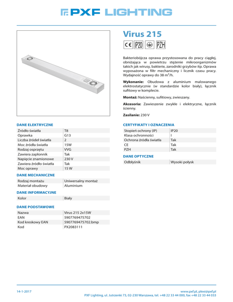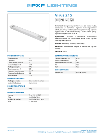 Virus 215 Bakteriobójcza oprawa przystosowana do pracy ciągłej, obniżająca w powietrzu stężenie mikroorganizmów takich jak wirusy, bakterie, zarodniki grzybów itp. Oprawa wyposażona w filtr mechaniczny i licznik czasu pracy. Wydajność oprawy do 38 m³/h. Wykonanie: Obudowa z aluminium malowanego elektrostatycznie (w standardzie kolor biały), łącznik sufitowy w komplecie. Montaż: Naścienny, sufitiowy, zwieszany. Akcesoria: Zawieszenie zwykłe i elektryczne, łącznik ścienny. Zasilanie: 230 V DANE ELEKTRYCZNE Źródło światła Oprawka Liczba źródeł światła Moc źródła światła Rodzaj osprzętu Zawiera zapłonnik Napięcie znamionowe Zawiera źródło światła Moc oprawy CERTYFIKATY I OZNACZENIA T8 G13 2 15W VVG Tak 230 V Tak 15 W Stopień ochrony (IP) Klasa ochronności Ochrona źródła światła CE PZH IP20 I Tak Tak Tak DANE OPTYCZNE Odbłyśnik Wysoki połysk DANE MECHANICZNE Rodzaj montażu Materiał obudowy Uniwersalny montaż Aluminium DANE INFORMACYJNE Kolor Biały DANE PODSTAWOWE Nazwa EAN Kod kreskowy EAN Kod 14-1-2017 Virus 215 2x15W 5907769475702 5907769475702.bmp PX2083111 www.pxf.pl, [email protected] PXF Lighting, ul. Jutrzenki 73, 02-230 Warszawa, tel. +48 22 33 44 000, fax +48 22 33 44 033 WYMIARY H L [mm] W [mm] H [mm] 1090 135 55 L = Długość | W = Szerokość | H = Wysokość / głębokość W L AKCESORIA Element elektryczny PX0922021 Szary PX0922032 Biały Zawieszenie elektryczne Sztuki w komplecie: 1 Element montażowy Zawieszenie zwykłe 14-1-2017 PX0922143 www.pxf.pl, [email protected] PXF Lighting, ul. Jutrzenki 73, 02-230 Warszawa, tel. +48 22 33 44 000, fax +48 22 33 44 033