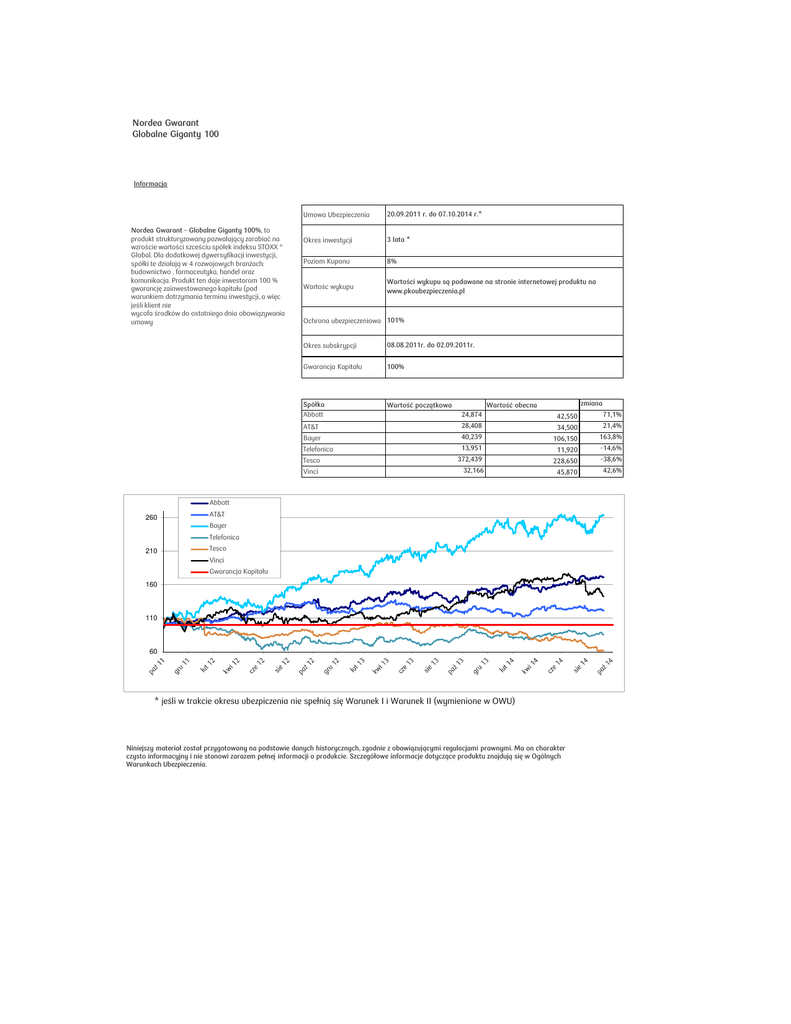 Nordea Gwarant Globalne Giganty 100 Informacja Nordea Gwarant – Globalne Giganty 100%, to produkt strukturyzowany pozwalający zarabiać na wzroście wartości szceściu spółek indeksu STOXX ® Global. Dla dodatkowej dywersyfikacji inwestycji, spółki te działają w 4 rozwojowych branżach: budownictwo , farmaceutyka, handel oraz komunikacja. Produkt ten daje inwestorom 100 % gwarancję zainwestowanego kapitału (pod warunkiem dotrzymania terminu inwestycji, a więc jeśli klient nie wycofa środków do ostatniego dnia obowiązywania umowy Umowa Ubezpieczenia 20.09.2011 r. do 07.10.2014 r.* Okres inwestycji 3 lata * Poziom Kuponu 8% Wartośc wykupu Wartości wykupu są podawane na stronie internetowej produktu na www.pkoubezpieczenia.pl Ochrona ubezpieczeniowa 101% Okres subskrypcji 08.08.2011r. do 02.09.2011r. Gwarancja Kapitału 100% Spółka Abbott Wartość początkowa zmiana Wartość obecna 24,874 42,550 AT&T 28,408 34,500 21,4% Bayer 40,239 106,150 163,8% Telefonica Tesco Vinci 13,951 11,920 -14,6% 372,439 228,650 -38,6% 32,166 45,870 42,6% Abbott 260 AT&T Bayer Telefonica 210 71,1% Tesco Vinci Gwarancja Kapitału 160 110 60 * jeśli w trakcie okresu ubezpiczenia nie spełnią się Warunek I i Warunek II (wymienione w OWU) Niniejszy materiał został przygotowany na podstawie danych historycznych, zgodnie z obowiązującymi regulacjami prawnymi. Ma on charakter czysto informacyjny i nie stanowi zarazem pełnej informacji o produkcie. Szczegółowe informacje dotyczące produktu znajdują się w Ogólnych Warunkach Ubezpieczenia.