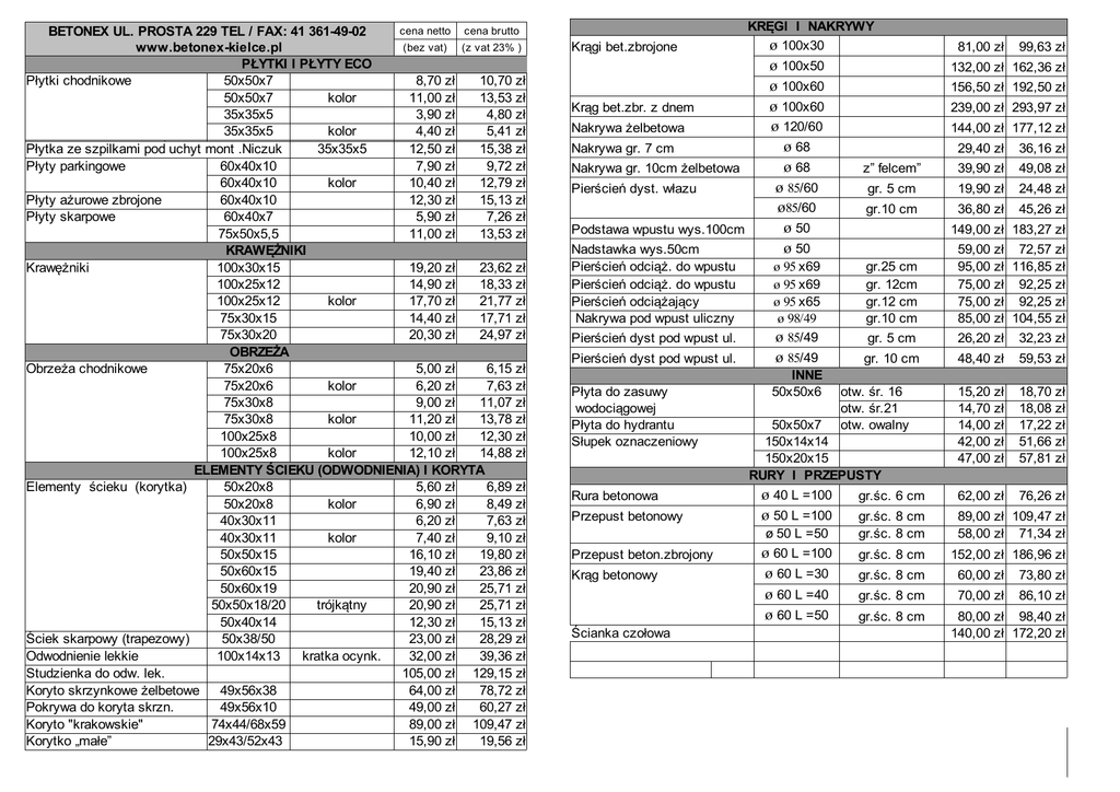 cena netto cena brutto BETONEX UL. PROSTA 229 TEL / FAX: 41 361-49-02 (bez vat) (z vat 23% ) www.betonex-kielce.pl PŁYTKI I PŁYTY ECO Płytki chodnikowe 50x50x7 8,70 zł 10,70 zł 50x50x7 kolor 11,00 zł 13,53 zł 35x35x5 3,90 zł 4,80 zł 35x35x5 kolor 4,40 zł 5,41 zł 0,00 Płytka ze szpilkami pod uchyt mont .Niczuk 35x35x5 12,50 zł 15,38 zł Płyty parkingowe 60x40x10 7,90 zł 9,72 zł 60x40x10 kolor 10,40 zł 12,79 zł Płyty ażurowe zbrojone 60x40x10 12,30 zł 15,13 zł Płyty skarpowe 60x40x7 5,90 zł 7,26 zł 75x50x5,5 11,00 zł 13,53 zł KRAWĘŻNIKI Krawężniki 100x30x15 19,20 zł 23,62 zł 100x25x12 14,90 zł 18,33 zł 100x25x12 kolor 17,70 zł 21,77 zł 75x30x15 14,40 zł 17,71 zł 75x30x20 20,30 zł 24,97 zł OBRZEŻA Obrzeża chodnikowe 75x20x6 5,00 zł 6,15 zł 75x20x6 kolor 6,20 zł 7,63 zł 75x30x8 9,00 zł 11,07 zł 75x30x8 kolor 11,20 zł 13,78 zł 100x25x8 10,00 zł 12,30 zł 100x25x8 kolor 12,10 zł 14,88 zł ELEMENTY ŚCIEKU (ODWODNIENIA) I KORYTA Elementy ścieku (korytka) 50x20x8 5,60 zł 6,89 zł 50x20x8 kolor 6,90 zł 8,49 zł 40x30x11 6,20 zł 7,63 zł 40x30x11 kolor 7,40 zł 9,10 zł 50x50x15 16,10 zł 19,80 zł 50x60x15 19,40 zł 23,86 zł 50x60x19 20,90 zł 25,71 zł 50x50x18/20 trójkątny 20,90 zł 25,71 zł 50x40x14 12,30 zł 15,13 zł Ściek skarpowy (trapezowy) 50x38/50 23,00 zł 28,29 zł Odwodnienie lekkie 100x14x13 kratka ocynk. 32,00 zł 39,36 zł Studzienka do odw. lek. 105,00 zł 129,15 zł Koryto skrzynkowe żelbetowe 49x56x38 64,00 zł 78,72 zł Pokrywa do koryta skrzn. 49x56x10 49,00 zł 60,27 zł Koryto "krakowskie" 74x44/68x59 89,00 zł 109,47 zł Korytko „małe” 29x43/52x43 15,90 zł 19,56 zł Krągi bet.zbrojone Krąg bet.zbr. z dnem Nakrywa żelbetowa Nakrywa gr. 7 cm Nakrywa gr. 10cm żelbetowa Pierścień dyst. włazu Podstawa wpustu wys.100cm Nadstawka wys.50cm Pierścień odciąż. do wpustu Pierścień odciąż. do wpustu Pierścień odciążający Nakrywa pod wpust uliczny KRĘGI I NAKRYWY ø 100x30 ø 100x50 ø 100x60 ø 100x60 ø 120/60 ø 68 ø 68 ø 85/60 ø85/60 ø 50 ø 50 81,00 zł 99,63 zł 132,00 zł 162,36 zł 156,50 zł 192,50 zł 239,00 zł 293,97 zł 144,00 zł 177,12 zł 29,40 zł 36,16 zł z” felcem” 39,90 zł 49,08 zł gr. 5 cm 19,90 zł 24,48 zł 36,80 zł 45,26 zł gr.10 cm 149,00 zł 183,27 zł gr.25 cm gr. 12cm gr.12 cm gr.10 cm 59,00 zł 72,57 zł 95,00 zł 116,85 zł 75,00 zł 92,25 zł 75,00 zł 92,25 zł 85,00 zł 104,55 zł Pierścień dyst pod wpust ul. ø 95 x69 ø 95 x69 ø 95 x65 ø 98/49 ø 85/49 gr. 5 cm 26,20 zł 32,23 zł Pierścień dyst pod wpust ul. ø 85/49 gr. 10 cm 48,40 zł 59,53 zł 15,20 zł 14,70 zł 14,00 zł 42,00 zł 47,00 zł 18,70 zł 18,08 zł 17,22 zł 51,66 zł 57,81 zł gr.śc. 6 cm 62,00 zł 76,26 zł gr.śc. 8 cm gr.śc. 8 cm 89,00 zł 109,47 zł 58,00 zł 71,34 zł gr.śc. 8 cm 152,00 zł 186,96 zł Płyta do zasuwy wodociągowej Płyta do hydrantu Słupek oznaczeniowy Rura betonowa Przepust betonowy INNE 50x50x6 50x50x7 150x14x14 150x20x15 RURY I PRZEPUSTY ø 40 L =100 ø 50 L =100 ø 50 L =50 Przepust beton.zbrojony Krąg betonowy Ścianka czołowa otw. śr. 16 otw. śr.21 otw. owalny ø 60 L =100 ø 60 L =30 ø 60 L =40 ø 60 L =50 gr.śc. 8 cm 60,00 zł 73,80 zł gr.śc. 8 cm 70,00 zł 86,10 zł gr.śc. 8 cm 80,00 zł 98,40 zł 140,00 zł 172,20 zł BETONEX UL. PROSTA 229 TEL / FAX: 41 361-49-02 www.betonex-kielce.pl BLOCZKI Bloczki betonowe fundament. 38x24x12 B-20 39x19x19 B-20 Bloczki betonowe drogowe 38x24x12 B-30 Bloczki trapezowe 24x18/30x15 B-30 TRYLINKA grub. 15cm Trylinka grub. 12cm grub. 10cm DYBLE SKARPOWE Dybel betonowy DC-15 gr. 15cm gr. 12cm gr. 10cm połów. połów. gr. 15cm INNE Słupek graniczny (geodezyjny) wys. 60cm Gazon (kwietnik) 50x40x30 kolor Obciążnik bet. śr. 34cm wys. 34cm 35x35 h=40cm Fundament pod latarnie Stopa fundamentowa pod reklame 120x50cm gr.25cm cena netto cena brutto (bez vat) (z vat 23% ) 2,70 zł 3,40 zł 5,20 zł 4,90 zł 3,32 zł 4,18 zł 6,40 zł 6,03 zł 7,50 zł 6,20 zł 5,30 zł 9,23 zł 7,63 zł 6,52 zł 9,30 zł 7,60 zł 6,50 zł 4,90 zł 11,44 zł 9,35 zł 8,00 zł 6,03 zł 14,90 zł 18,33 zł 14,50 zł 17,84 zł 18,00 zł 22,14 zł 29,00 zł 35,67 zł 120,00 zł 147,60 zł 180,00 zł 221,40 zł Firma wykonuje także elementy betonowe wg zamówień indywidualnych. Cena wyrobu nie obejmuje transportu do klienta. Cennik nie jest oferta handlową w rozumieniu prawa i ma charakter informacyjny. CENNIK NA WYROBY BETONOWE I MATERIAŁY BUDOWLANE OFEROWANE PRZEZ: Kielce ul. Prosta 229 mgr inż. Bzowski Zdzisław tel. kom. 509568898 Bedla Bogusław 606916889 PONIEDZIAŁEK - PIĄTEK: ODBIÓR TOWARU: 7.00 - 15.00 7.00 - 14.00 SOBOTA: (nie w każdą) ODBIÓR TOWARU: 7.00 - 12.00 7.00 - 11.30 Przy niesprzyjających warunkach pogodowych (silne opady ) prosimy o każdorazowe uzgadnianie odbioru towaru telefonicznie. W okresie zimowym ,zakład nieczynny, możliwy zakup towaru po umówieniu telefonicznym. ODWIEDŹ NASZĄ STRONĘ: