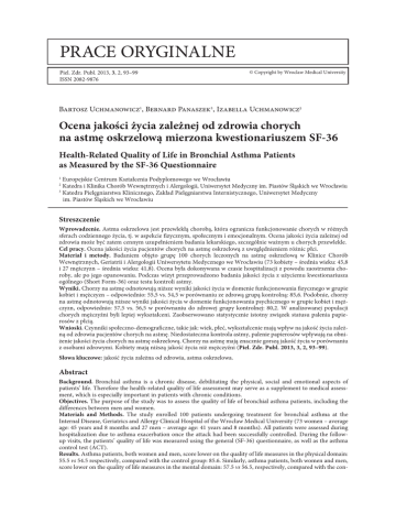 prace oryginalne Piel. Zdr. Publ. 2013, 3, 2, 93–99 ISSN 2082-9876 © Copyright by Wroclaw Medical University Bartosz Uchmanowicz1, Bernard Panaszek2, Izabella Uchmanowicz3 Ocena jakości życia zależnej od zdrowia chorych na astmę oskrzelową mierzona kwestionariuszem SF-36 Health-Related Quality of Life in Bronchial Asthma Patients as Measured by the SF-36 Questionnaire Europejskie Centrum Kształcenia Podyplomowego we Wrocławiu Katedra i Klinika Chorób Wewnętrznych i Alergologii, Uniwersytet Medyczny im. Piastów Śląskich we Wrocławiu 3 Katedra Pielęgniarstwa Klinicznego, Zakład Pielęgniarstwa Internistycznego, Uniwersytet Medyczny im. Piastów Śląskich we Wrocławiu 1 2 Streszczenie Wprowadzenie. Astma oskrzelowa jest przewlekłą chorobą, która ogranicza funkcjonowanie chorych w różnych sferach codziennego życia, tj. w aspekcie fizycznym, społecznym i emocjonalnym. Ocena jakości życia zależnej od zdrowia może być zatem cennym uzupełnieniem badania lekarskiego, szczególnie ważnym u chorych przewlekle. Cel pracy. Ocena jakości życia pacjentów chorych na astmę oskrzelową z uwzględnieniem różnic płci. Materiał i metody. Badaniem objęto grupę 100 chorych leczonych na astmę oskrzelową w Klinice Chorób Wewnętrznych, Geriatrii i Alergologii Uniwersytetu Medycznego we Wrocławiu (73 kobiety – średnia wieku: 45,8 i 27 mężczyzn – średnia wieku: 41,8). Ocena była dokonywana w czasie hospitalizacji z powodu zaostrzenia choroby, ale po jego opanowaniu. Podczas wizyt przeprowadzono badania jakości życia z użyciemu kwestionariusza ogólnego (Short Form-36) oraz testu kontroli astmy. Wyniki. Chorzy na astmę odnotowują niższe wyniki jakości życia w domenie funkcjonowania fizycznego w grupie kobiet i mężczyzn – odpowiednio: 55,5 vs. 54,5 w porównaniu ze zdrową grupą kontrolną: 85,6. Podobnie, chorzy na astmę odnotowują niższe wyniki jakości życia w domenie funkcjonowania psychicznego w grupie kobiet i mężczyzn, odpowiednio: 57,5 vs. 56,5 w porównaniu do zdrowej grupy kontrolnej: 80,2. W analizowanej populacji chorych mężczyźni byli lepiej wykształceni. Zaobserwowano statystycznie istotny związek statusu palenia papierosów z płcią. Wnioski. Czynniki społeczno-demograficzne, takie jak: wiek, płeć, wykształcenie mają wpływ na jakość życia zależną od zdrowia pacjentów chorych na astmę. Niedostateczna kontrola astmy, palenie papierosów wpływają na obniżenie jakości życia chorych na astmę oskrzelową. Chorzy na astmę mają znacznie gorszą jakość życia w porównaniu z osobami zdrowymi. Kobiety mają niższą jakość życia niż mężczyźni (Piel. Zdr. Publ. 2013, 3, 2, 93–99). Słowa kluczowe: jakość życia zależna od zdrowia, astma oskrzelowa. Abstract Background. Bronchial asthma is a chronic disease, debilitating the physical, social and emotional aspects of patients’ life. Therefore the health-related quality of life assessment may serve as a supplement to medical assessment, which is especially important in patients with chronic conditions. Objectives. The purpose of the study was to assess the quality of life of bronchial asthma patients, including the differences between men and women. Materials and Methods. The study enrolled 100 patients undergoing treatment for bronchial asthma at the Internal Disease, Geriatrics and Allergy Clinical Hospital of the Wrocław Medical University (73 women – average age: 45 years and 8 months and 27 men – average age: 41 years and 8 months). All patients were assessed during hospitalization due to asthma exacerbation once the attack had been successfully controlled. During the followup visits, the patients’ quality of life was measured using the general (SF-36) questionnaire, as well as the asthma control test (ACT). Results. Asthma patients, both women and men, score lower on the quality of life measures in the physical domain: 55.5 vs 54.5 respectively, compared with the control group: 85.6. Similarly, asthma patients, both women and men, score lower on the quality of life measures in the mental domain: 57.5 vs 56.5, respectively, compared with the con- 94 B. Uchmanowicz, B. Panaszek, I. Uchmanowicz trol group: 80.2. In the study population men were better educated than women. The relation between smoking and sex was reported as statistically significant. Women scored much lower on the quality of life outcomes as measured by the SF-36 questionnaires than men. Conclusions. Socio-demographic factors, such as age, sex, and education play a role in the HRQOL outcome in asthma patients. Poor asthma control and smoking lower the quality of life of patients with bronchial asthma. The quality of life of these patients is much worse than in the healthy population. The quality of life of women has been reported to be lower than of men (Piel. Zdr. Publ. 2013, 3, 2, 93–99). Key words: health related quality of life, asthma bronchiale. Dane GINA (Global Initiative for Asthma) pokazują, że astma oskrzelowa dotyczy ok. 300 mln ludzi na całym świecie [1]. Przewlekłe objawy choroby oraz ich napadowy charakter to przyczyny znacznego ograniczenia funkcjonowania chorych w aspekcie fizycznym, społecznym i emocjonalnym [2–4]. Konieczne zatem staje się podjęcie interdyscyplinarnych działań, mających na celu poprawę skuteczności leczenia i zminimalizowania wpływu tych interwencji na jakość życia pacjentów chorych na astmę oskrzelową [4]. Zainteresowanie jakością życia w chorobach somatycznych zostało zapoczątkowane przez próbę oceny niektórych czynników wpływających na przedłużenie ludzkiego życia wolnego od objawów choroby, pozwalających na codzienne funkcjonowanie. Takie podejście różni się od stosowanych dotychczas kryteriów uwzględniających głównie takie aspekty, jak zachorowalność czy śmiertelność. Efekty terapeutyczne powinny być oceniane w kategoriach potrzeb zdrowotnych, sytuacji zdrowotnej lub zadowolen