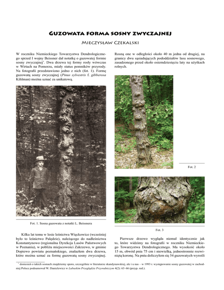 Guzowata forma sosny zwyczajnej Mieczysław Czekalski W roczniku Niemieckiego Towarzystwa Dendrologicznego sprzed I wojny Beissner dał notatkę o guzowatej formie sosny zwyczajnej*. Dwa drzewa tej formy rosły wówczas w Wirtach na Pomorzu, miały status pomników przyrody. Na fotografii przedstawiono jedno z nich (fot. 1). Formę guzowatą sosny zwyczajnej (Pinus sylvestris f. gibberosa Kihlman) można uznać za unikatową. Rosną one w odległości około 40 m jedna od drugiej, na granicy dwu sąsiadujących pododdziałów lasu sosnowego, zasadzonego przed około osiemdziesięciu laty na użytkach rolnych. Fot. 2 Fot. 1. Sosna guzowata z notatki L. Beissnera Fot. 3 Kilka lat temu w lesie leśnictwa Więckowice (wcześniej było to leśnictwo Palędzie), należącego do nadleśnictwa Konstantynowo (regionalna Dyrekcja Lasów Państwowych w Poznaniu), w pobliżu miejscowości Zakrzewo, w gminie Dopiewo powiatu poznańskiego, znalazłem dwa drzewa, które można uznać za formę guzowatą sosny zwyczajnej. * Pierwsze drzewo wygląda niemal identycznie jak to, które widzimy na fotografii w roczniku Niemieckiego Towarzystwa Dendrologicznego. Ma wysokość około 15 m, obwód pnia 75 cm i niewielką, jednostronnie rozwiniętą koronę. Na pniu doliczyłem się 54 guzowatych wyrośli doniesień o takich sosnach znajdziemy sporo, szczególnie w literaturze skandynawskiej, ale i u nas – w 1993 r. występowanie sosny guzowatej w zachod- niej Polsce podsumował W. Danielewicz w Lubuskim Przeglądzie Przyrodniczym 4(2): 63–66 (przyp. red.). Guzowata forma sosny zwyczajnej 15 drewna i martwicy korkowej; kształt mają półkulisty, różną wielkość i grubość (fot. 2, 3). Widać też małe wyrośla, |w stadium inicjacji. Najniżej położony guz znajduje się już u nasady pnia. Kolejne leżą blisko siebie, a nawet się przenikają. Największy powstał na wysokości 4 m, występowanie guzów kończy się na wysokości 8 m. Pień sosny z guzami wygląda nadzwyczaj osobliwie. Drugie drzewo ma wysokość około 18 m i obwód pnia 121 cm. Pień jest lekko pochyły, korona szeroka i gęsta. |Na pniu widać 23 guzy. Pierwszy znajduje się na wysokości 3,5 m (fot. 4), trzy największe – na wysokości 5, 10 i 10,5 m. W porównaniu z pierwszym drzewem guzy są na pniu rozmieszczone rzadziej, ale są większe. Przyczyna powstawania guzów na pniu sosny nie jest znana. Wykorzystano: Beissner L. 1911. Jahresversammlung. Mitteilungen der Deutschen Dendrologischen Gesellschaft [1911]: 314–353. prof. dr hab. Mieczysław Czekalski jest emerytowanym profesorem zwyczajnym Katedry Roślin Ozdobnych Uniwersytetu Przyrodniczego w Poznaniu i członkiem honorowym PTD Fot. 4.