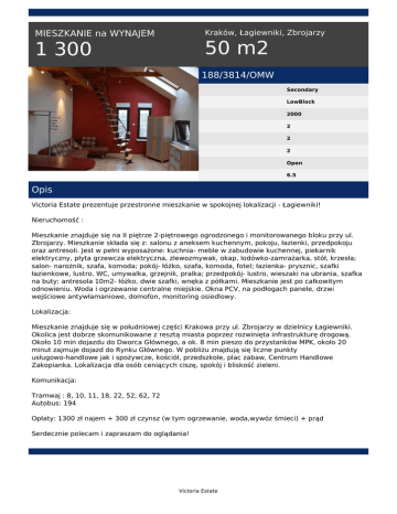 Kraków, Łagiewniki, Zbrojarzy MIESZKANIE na WYNAJEM 50 m2 1 300 188/3814/OMW Secondary LowBlock 2000 2 2 2 Open 6.5 Opis Victoria Estate prezentuje przestronne mieszkanie w spokojnej lokalizacji - Łagiewniki! Nieruchomość : Mieszkanie znajduje się na II piętrze 2-piętrowego ogrodzonego i monitorowanego bloku przy ul. Zbrojarzy. Mieszkanie składa się z: salonu z aneksem kuchennym, pokoju, łazienki, przedpokoju oraz antresoli. Jest w pełni wyposażone: kuchnia- meble w zabudowie kuchennej, piekarnik elektryczny, płyta grzewcza elektryczna, zlewozmywak, okap, lodówko-zamrażarka, stół, krzesła; salon- narożnik, szafa, komoda; pokój- łóżko, szafa, komoda, fotel; łazienka- prysznic, szafki łazienkowe, lustro, WC, umywalka, grzejnik, pralka; przedpokój- lustro, wieszaki na ubrania, szafka na buty; antresola 10m2- łóżko, dwie szafki, wnęka z półkami. Mieszkanie jest po całkowitym odnowieniu. Woda i ogrzewanie centralne miejskie. Okna PCV, na podłogach panele, drzwi wejściowe antywłamaniowe, domofon, monitoring osiedlowy. Lokalizacja: Mieszkanie znajduje się w południowej części Krakowa przy ul. Zbrojarzy w dzielnicy Łagiewniki. Okolica jest dobrze skomunikowane z resztą miasta poprzez rozwinięta infrastrukturę drogową. Około 10 min dojazdu do Dworca Głównego, a ok. 8 min pieszo do przystanków MPK, około 20 minut zajmuje dojazd do Rynku Głównego. W pobliżu znajdują się liczne punkty usługowo-handlowe jak i spożywcze, kościół, przedszkole, plac zabaw, Centrum Handlowe Zakopianka. Lokalizacja dla osób ceniących ciszę, spokój i bliskość zieleni. Komunikacja: Tramwaj : 8, 10, 11, 18, 22, 52, 62, 72 Autobus: 194 Opłaty: 1300 zł najem + 300 zł czynsz (w tym ogrzewanie, woda,wywóz śmieci) + prąd Serdecznie polecam i zapraszam do oglądania! Victoria Estate Małgorzata Wicha tel. +48 511 560 721 email: [email protected] Victoria Estate Powered by TCPDF (www.tcpdf.org)