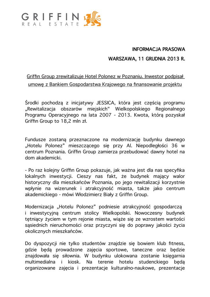 INFORMACJA PRASOWA WARSZAWA, 11 GRUDNIA 2013 R. Griffn Group zrewitalizuje Hotel Polonez w Poznaniu. Inwestor podpisał umowę z Bankiem Gospodarstwa Krajowego na fnansowanie projektu Środki pochodzą z inicjatywy JESSICA, która jest częścią programu „Rewitalizacja obszarów miejskich" Wielkopolskiego Regionalnego Programu Operacyjnego na lata 2007 - 2013. Kwota, którą pozyskał Griffn Group to 18,2 mln zł. Fundusze zostaną przeznaczone na modernizację budynku dawnego „Hotelu Polonez” mieszczącego się przy Al. Niepodległości 36 w centrum Poznania. Griffn Group zamierza przebudować dawny hotel na dom akademicki. - Po raz kolejny Griffn Group pokazuje, jak ważna jest dla nas specyfka lokalnych inwestycji. Cieszy nas fakt, że budynek mający walor historyczny dla mieszkańców Poznania, po jego rewitalizacji korzystnie wpłynie na wizerunek i atrakcyjność miasta, także jako centrum akademickiego - mówi Włodzimierz Biały z Griffn Group. Modernizacja „Hotelu Polonez” podniesie atrakcyjność gospodarczą i inwestycyjną centrum stolicy Wielkopolski. Nowoczesny budynek tętniący życiem w tym rejonie miasta, wiąże się ze wzrostem wartości sąsiednich nieruchomości oraz przyczyni się do poprawy jakości życia okolicznych mieszkańców. Do dyspozycji nie tylko studentów znajdzie się bowiem klub ftness, gdzie będą prowadzone zajęcia sportowe, taneczne oraz będzie znajdowała się siłownia. W budynku ulokowana zostanie księgarnia multimedialna i kiosk. Na terenie hotelu studenckiego będą organizowane zajęcia i prezentacje kulturalno-naukowe, prezentacje dzieł sztuki i wynalazków poznańskiej młodzieży, które zwiększą dostępność do kultury i nauki. Odnowienie dawnego „Hotelu Polonez” pozwoli na zwiększenie liczby miejsc w domach studenckich, a także wpłynie na integrację społeczności akademickiej Poznania. Dom akademicki będzie otwarty na wszystkich studentów bez względu na uczelnię. Studenci będą mogli korzystać ze stołówki pralni i suszarni, klubów studenckich, sklepów ogólnospożywczych, usług kosmetycznych, kwiaciarni. Bezprzewodowy Internet będzie dostępny w całym budynku. Inwestycja zostanie oddana do użytku w drugiej połowie 2014 roku. O GRIFFIN GROUP Griffn Real Estate został założony w 2006 roku jako platforma do zarządzania funduszami, inwestującymi w sektor nieruchomości. Od początku istnienia inwestuje w nie także swój własny kapitał. W marcu 2013 Griffn pozyskał inwestora strategicznego – Oaktree Capital Management, z którym współpracuje od 2010 roku. Oaktree jest hedgingowym funduszem wywodzącym się z USA. Posiada biura na całym świecie, zatrudnia ponad 650 osób oraz zarządza środkami w wysokości prawie 90 miliardów dolarów. Griffn to wiodący na polskim rynku nieruchomości inwestor, który w imieniu zarządzanych przez siebie Funduszy, aktywnie lokuje środki w prestiżowe projekty. Celem strategicznym jest zbudowanie w ciągu kilku lat unikatowego portfela nieruchomości. W portfolio grupy Griffn znajduje się obecnie m.in. Hala Koszyki w Warszawie, Dom Handlowy Renoma we Wrocławiu, Prima Court w Warszawie oraz inne obiekty biurowe i handlowe, a także działki inwestycyjne. Griffn wspiera liczne inicjatywy, w tym Fundację Jana Karskiego. W przestrzeniach należących do Funduszy zarządzanych przez Griffn realizowane są również projekty artystyczne, inicjowane przez Griffn Art Space, instytucję powołaną przez Griffn, aby wspierać sztukę i promować jej obecność w przestrzeni publicznej.