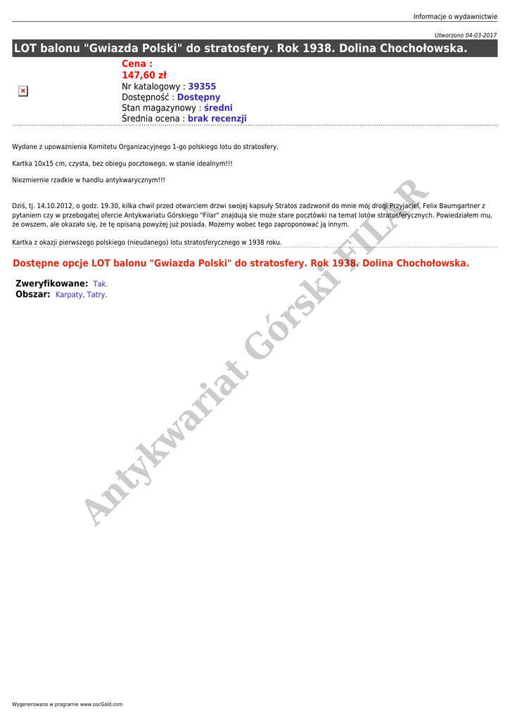 Informacje o wydawnictwie Utworzono 04-03-2017 LOT balonu "Gwiazda Polski" do stratosfery. Rok 1938. Dolina Chochołowska. Cena : 147,60 zł Nr katalogowy : 39355 Dostępność : Dostępny Stan magazynowy : średni Średnia ocena : brak recenzji Wydane z upoważnienia Komitetu Organizacyjnego 1-go polskiego lotu do stratosfery. Kartka 10x15 cm, czysta, bez obiegu pocztowego, w stanie idealnym!!! R Niezmiernie rzadkie w handlu antykwarycznym!!! FI Kartka z okazji pierwszego polskiego (nieudanego) lotu stratosferycznego w 1938 roku. LA Dziś, tj. 14.10.2012, o godz. 19.30, kilka chwil przed otwarciem drzwi swojej kapsuły Stratos zadzwonił do mnie mój drogi Przyjaciel, Felix Baumgartner z pytaniem czy w przebogatej ofercie Antykwariatu Górskiego "Filar" znajdują sie może stare pocztówki na temat lotów stratosferycznych. Powiedziałem mu, że owszem, ale okazało się, że tę opisaną powyżej już posiada. Możemy wobec tego zaproponować ją innym. Dostępne opcje LOT balonu "Gwiazda Polski" do stratosfery. Rok 1938. Dolina Chochołowska. An ty k w ar ia t G ór sk i Zweryfikowane: Tak. Obszar: Karpaty, Tatry. Wygenerowano w programie www.oscGold.com
