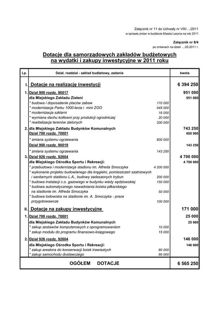 Załącznik nr 11 do Uchwały nr VIII/…/2011 w sprawie zmian w budżecie Miasta Leszna na rok 2011 Załącznik nr 8/4 po zmianach na dzień ....05.2011 r. Dotacje dla samorządowych zakładów budżetowych na wydatki i zakupy inwestycyjne w 2011 roku Lp. Dział, rozdział - zakład budżetowy, zadanie kwota I. Dotacje na realizację inwestycji 1. Dział 900 rozdz. 90017 dla Miejskiego Zakładu Zieleni * budowa i doposażenie placów zabaw * modernizacja Parku 1000-lecia i mini ZOO * modernizacja szklarni * wymiana dachu kotłowni przy produkcji ogrodniczej * rewitalizacja terenów zielonych 6 394 250 951 000 951 000 170 000 545 000 16 000 20 000 200 000 743 250 2. dla Miejskiego Zakładu Budynków Komunalnych Dział 700 rozdz. 70001 * zmiana systemu ogrzewania 600 000 600 000 Dział 900 rozdz. 90019 143 250 * zmiana systemu ogrzewania 143 250 3. Dział 926 rozdz. 92604 dla Miejskiego Ośrodka Sportu i Rekreacji: * przebudowa i modernizacja stadionu im. Alfreda Smoczyka 4 200 000 * wykonanie projektu budowlanego dla kręgielni, pomieszczeń szatniowych i sanitarnych stadionu L.A., budowy zadaszonych trybun 200 000 * budowa instalacji c.o. gazowego w budynku wieży sędziowskiej 150 000 * budowa automatycznego nawadniania boiska piłkarskiego na stadionie im. Alfreda Smoczyka 50 000 * budowa lodowiska na stadionie im. A. Smoczyka - prace przygotowawcze 100 000 II. Dotacje na zakupy inwestycyjne 4 700 000 4 700 000 171 000 25 000 1. Dział 700 rozdz. 70001 dla Miejskiego Zakładu Budynków Komunalnych * zakup zestawów komputerowych z oprogramowaniem * zakup modułu do programu finansowo-księgowego 25 000 10 000 15 000 146 000 2. Dział 926 rozdz. 92604 dla Miejskiego Ośrodka Sportu i Rekreacji: * zakup areatora do konserwacji boisk trawiastych * zakup samochodu dostawczego OGÓŁEM DOTACJE 146 000 80 000 66 000 6 565 250