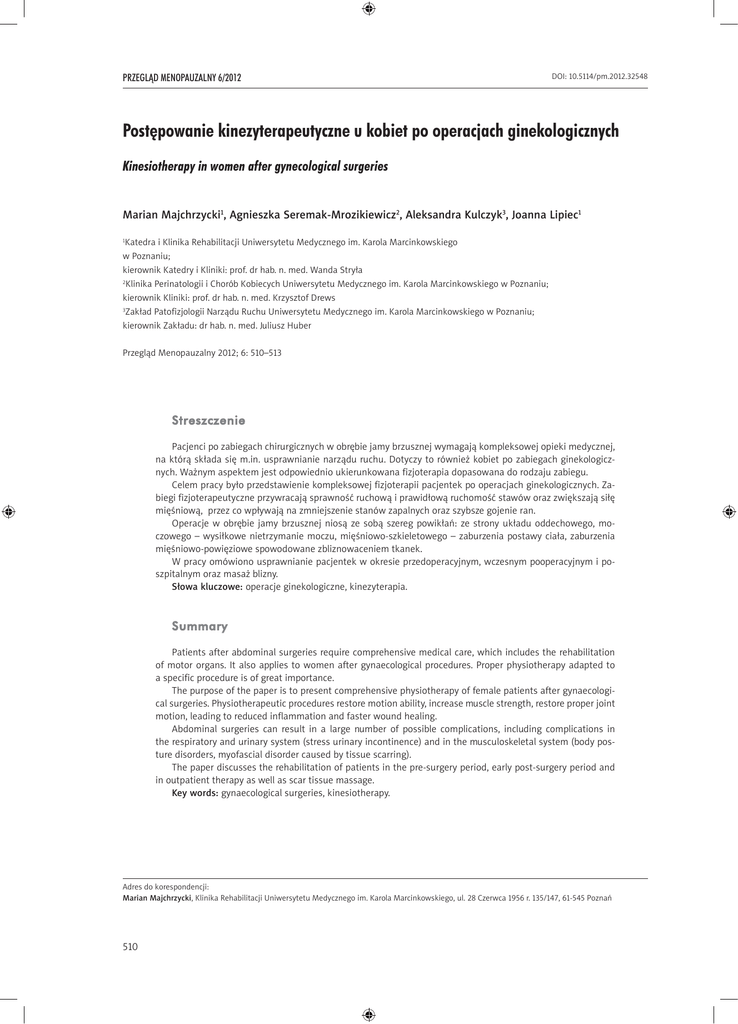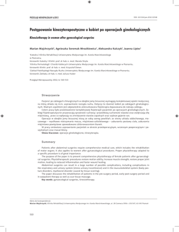 Przegl¥d menopauzalny 6/2012 DOI: 10.5114/pm.2012.32548 Postêpowanie kinezyterapeutyczne u kobiet po operacjach ginekologicznych Kinesiotherapy in women after gynecological surgeries Marian Majchrzycki1, Agnieszka Seremak-Mrozikiewicz2, Aleksandra Kulczyk3, Joanna Lipiec1 Katedra i Klinika Rehabilitacji Uniwersytetu Medycznego im. Karola Marcinkowskiego w Poznaniu; kierownik Katedry i Kliniki: prof. dr hab. n. med. Wanda Stryła 2 Klinika Perinatologii i Chorób Kobiecych Uniwersytetu Medycznego im. Karola Marcinkowskiego w Poznaniu; kierownik Kliniki: prof. dr hab. n. med. Krzysztof Drews 3 Zakład Patofizjologii Narządu Ruchu Uniwersytetu Medycznego im. Karola Marcinkowskiego w Poznaniu; kierownik Zakładu: dr hab. n. med. Juliusz Huber 1 Przegląd Menopauzalny 2012; 6: 510–513 Streszczenie Pacjenci po zabiegach chirurgicznych w obrębie jamy brzusznej wymagają kompleksowej opieki medycznej, na którą składa się m.in. usprawnianie narządu ruchu. Dotyczy to również kobiet po zabiegach ginekologicznych. Ważnym aspektem jest odpowiednio ukierunkowana fizjoterapia dopasowana do rodzaju zabiegu. Celem pracy było przedstawienie kompleksowej fizjoterapii pacjentek po operacjach ginekologicznych. Zabiegi fizjoterapeutyczne przywracają sprawność ruchową i prawidłową ruchomość stawów oraz zwiększają siłę mięśniową, przez co wpływają na zmniejszenie stanów zapalnych oraz szybsze gojenie ran. Operacje w obrębie jamy brzusznej niosą ze sobą szereg powikłań: ze strony układu oddechowego, moczowego – wysiłkowe nietrzymanie moczu, mięśniowo-szkieletowego – zaburzenia postawy ciała, zaburzenia mięśniowo-powięziowe spowodowane zbliznowaceniem tkanek. W pracy omówiono usprawnianie pacjentek w okresie przedoperacyjnym, wczesnym pooperacyjnym i poszpitalnym oraz masaż blizny. Słowa kluczowe: operacje ginekologiczne, kinezyterapia. Summary Patients after abdominal surgeries require comprehensive medical care, which includes the rehabilitation of motor organs. It also applies to women after gynaecological procedures. Proper physiotherapy adapted to a specific procedure is of great importance. The purpose of the paper is to present comprehensive physiotherapy of female patients after gynaecological surgeries. Physiotherapeutic procedures restore motion ability, increase muscle strength, restore proper joint motion, leading to reduced inflammation and faster wound healing. Abdominal surgeries can result in a large number of possible complications, including complications in the respiratory and urinary system (stress urinary incontinence) and in the musculoskeletal system (body posture disorders, myofascial disorder caused by tissue scarring). The paper discusses the rehabilitation of patients in the pre-surgery period, early post-surgery period and in outpatient therapy as well as scar tissue massage. Key words: gynaecological surgeries, kinesiotherapy. Adres do korespondencji: Marian Majchrzycki, Klinika Rehabilitacji Uniwersytetu Medycznego im. Karola Marcinkowskiego, ul. 28 Czerwca 1956 r. 135/147, 61-545 Poznań 510 Przegl¥d menopauzalny 6/2012 Wstęp Kobiety po zabiegach ginekologicznych w obrębie jamy brzusznej powinny być leczone za pomocą specjalistycznie dobranego kompleksowego programu usprawniania. Dla dobra pacjenta podczas ustalania programu leczenia ważna jest ścisła współpraca między całym zespołem medycznym, w skład którego wchodzą: ginekolog, chirurg, fizjoterapeuta, pielęgniarka i psycholog. Fizjoterapia jest podstawową metodą leczenia wykorzystującą zjawisko reaktywności organizmu na różne bodźce. Na fizjoterapię składają się: kinezyterapia, fizykoterapia i masaż leczniczy. Celem fizjoterapii jest pomoc w usuwaniu procesów chorobowych, zapobieganie skutkom zabiegu chirurgicznego, przywrócenie sprawności ruchowej, zwiększenie siły mięśniowej, przywrócenie prawidłowej ruchomości stawów. Zabiegi mają na celu zmniejszenie stanu zapalnego oraz dolegliwości bólowych. Wpływają korzystnie na gojenie się rany pooperacyjnej oraz zapobiegają negatywnym skutkom zbliznowacenia [1]. Fizjoterapeuta poprzez swoją pracę z pacjentem zapobiega powikłaniom pooperacyjnym układu oddechowego i krążenia, pomaga utrzymać prawidłową perystaltykę jelit, zapobiega powstaniu zrostów pooperacyjnych, utrzymuje sprawność narządu ruchu oraz wpływa korzystnie na lepsze samopoczucie psychiczne pacjenta. Cel pracy Celem pracy jest przedstawienie kompleksowej fizjoterapii pacjentów metodami kinezyterapii po zabiegach ginekologicznych. Proces usprawniania po operacjach ginekologicznych jamy brzusznej Jest wiele chorób wymagających interwencji chirurgicznej w obrębie jamy brzusznej. Operacje ginekologiczne wykonuje się z użyciem toru wizyjnego i endoskopu (laparoskopia), przez dostęp do narządów płciowych, otwarcie powłok brzusznych (laparotomia) oraz przez nacięcie ścian pochwy (per vaginam). Do sposobu leczenia operacyjnego dobiera są odpowiednie metody usprawniania, co wpływa na późniejszy okres rekonwalescencji [2]. Schemat organizacji procesu usprawniania w przypadku operacji ginekologicznych dzieli się na fizjoterapię szpitalną (przed zabiegiem oraz wczesnopooperacyjną) i na fizjoterapię poszpitalną (ambulatoryjną, sanatoryjną) [3]. Usprawnianie w okresie przedoperacyjnym W okresie przedoperacyjnym podstawowym celem fizjoterapii jest zapobieganie zjawisku hipokinezy (ćwiczenia ogólnie usprawniające, kondycyjne), nauka ćwi- czeń stosowanych po operacji (ćwiczenia oddechowe, ćwiczenia skutecznego kaszlu, przeciwzakrzepowe, samoobsługi, zmiany pozycji) oraz profilaktyka zaburzeń czynności układu krążenia i oddechowego. Zmniejszona aktywność ruchowa powoduje już w 1. dobie aktywację układu krzepnięcia, w 2.–3. dobie zwiększenie diurezy i zmniejszenie objętości płynów ustrojowych, w 4.–7. dobie zwiększenie stężenia fibrynogenu i aktywności fibrynolitycznej oso