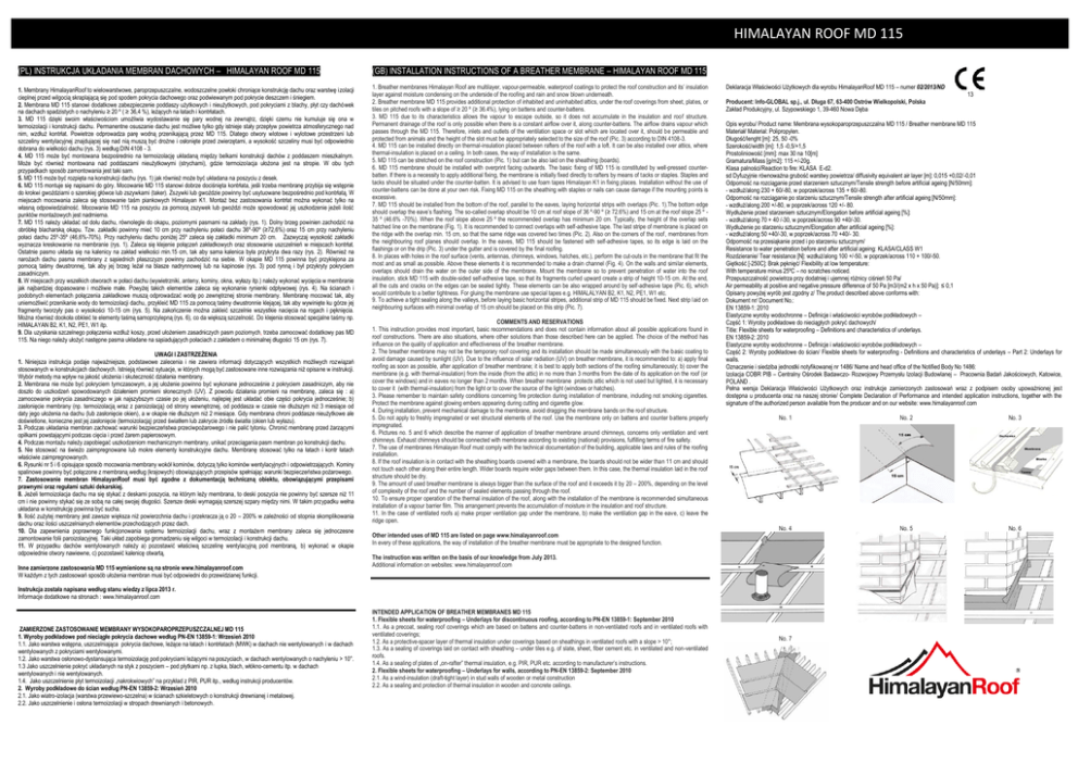 HIMALAYAN ROOF MD 115 (PL) INSTRUKCJA UKŁADANIA MEMBRAN DACHOWYCH – HIMALAYAN ROOF MD 115 (GB) INSTALLATION INSTRUCTIONS OF A BREATHER MEMBRANE – HIMALAYAN ROOF MD 115 1. Membrany HimalayanRoof to wielowarstwowe, paroprzepuszczalne, wodoszczelne powłoki chroniące konstrukcję dachu oraz warstwę izolacji cieplnej przed wilgocią skraplającą się pod spodem pokrycia dachowego oraz podwiewanym pod pokrycie deszczem i śniegiem. 2. Membrana MD 115 stanowi dodatkowe zabezpieczenie poddaszy użytkowych i nieużytkowych, pod pokryciami z blachy, płyt czy dachówek na dachach spadzistych o nachyleniu ≥ 20 º ( ≥ 36,4 %), leżących na łatach i kontrłatach. 3. MD 115 dzięki swoim właściwościom umożliwia wydostawanie się pary wodnej na zewnątrz, dzięki czemu nie kumuluje się ona w termoizolacji i konstrukcji dachu. Permanentne osuszanie dachu jest możliwe tylko gdy istnieje stały przepływ powietrza atmosferycznego nad nim, wzdłuż kontrłat. Powietrze odprowadza parę wodną przenikającą przez MD 115. Dlatego otwory wlotowe i wylotowe przestrzeni lub szczeliny wentylacyjnej znajdującej się nad nią muszą być drożne i osłonięte przed zwierzętami, a wysokość szczeliny musi być odpowiednio dobrana do wielkości dachu (rys. 3) według DIN 4108 - 3. 4. MD 115 może być montowana bezpośrednio na termoizolację układaną między belkami konstrukcji dachów z poddaszem mieszkalnym. Może być również montowana nad poddaszami nieużytkowymi (strychami), gdzie termoizolacja ułożona jest na stropie. W obu tych przypadkach sposób zamontowania jest taki sam. 5. MD 115 może być rozpięta na konstrukcji dachu (rys. 1) jak również może być układana na poszyciu z desek. 6. MD 115 montuje się napisami do góry. Mocowanie MD 115 stanowi dobrze dociśnięta kontrłata, jeśli trzeba membranę przybija się wstępnie do krokwi gwoździami o szerokiej główce lub zszywkami (taker). Zszywki lub gwoździe powinny być usytuowane bezpośrednio pod kontrłatą. W miejscach mocowania zaleca się stosowanie taśm piankowych Himalayan K1. Montaż bez zastosowania kontrłat można wykonać tylko na własną odpowiedzialność. Mocowanie MD 115 na poszyciu za pomocą zszywek lub gwoździ może spowodować jej uszkodzenie jeżeli ilość punktów montażowych jest nadmierna. 7. MD 115 należy układać od dołu dachu, równolegle do okapu, poziomymi pasmami na zakłady (rys. 1). Dolny brzeg powinien zachodzić na obróbkę blacharską okapu. Tzw. zakładki powinny mieć 10 cm przy nachyleniu połaci dachu 36º-90º (≥72,6%) oraz 15 cm przy nachyleniu połaci dachu 25º-35º (46,6%-70%). Przy nachyleniu dachu poniżej 25º zaleca się zakładki minimum 20 cm. Zazwyczaj wysokość zakładki wyznacza kreskowanie na membranie (rys. 1). Zaleca się klejenie połączeń zakładkowych oraz stosowanie uszczelnień w miejscach kontrłat. Ostatnie pasmo układa się na kalenicy na zakład wielkości min.15 cm, tak aby sama kalenica była przykryta dwa razy (rys. 2). Również na narożach dachu pasma membrany z sąsiednich płaszczyzn powinny zachodzić na siebie. W okapie MD 115 powinna być przyklejona za pomocą taśmy dwustronnej, tak aby jej brzeg leżał na blasze nadrynnowej lub na kapinosie (rys. 3) pod rynną i był przykryty pokryciem zasadniczym. 8. W miejscach przy wszelkich otworach w połaci dachu (wywietrzniki, anteny, kominy, okna, wyłazy itp.) należy wykonać wycięcia w membranie jak najbardziej dopasowane i możliwie małe. Powyżej takich elementów zaleca się wykonanie rynienki odpływowej (rys. 4). Na ścianach i podobnych elementach połączenia zakładkowe muszą odprowadzać wodę po zewnętrznej stronie membrany. Membranę mocować tak, aby uniemożliwić przenikanie wody do termoizolacji dachu, przykleić MD 115 za pomocą taśmy dwustronnie klejącej, tak aby wywinięte ku górze jej fragmenty tworzyły pas o wysokości 10-15 cm (rys. 5). Na zakończenie można zakleić szczelnie wszystkie nacięcia na rogach i pęknięcia. Można również dookoła obkleić te elementy taśmą samoprzylepną (rys. 6), co da większą szczelność. Do klejenia stosować specjalne taśmy np. HIMALAYAN B2, K1, N2, PE1, W1 itp. 9. Dla uzyskania szczelnego połączenia wzdłuż koszy, przed ułożeniem zasadniczych pasm poziomych, trzeba zamocować dodatkowy pas MD 115. Na niego należy ułożyć następne pasma układane na sąsiadujących połaciach z zakładem o minimalnej długości 15 cm (rys. 7). 1. Breather membranes Himalayan Roof are multilayer, vapour-permeable, waterproof coatings to protect the roof construction and its’ insulation layer against moisture condensing on the underside of the roofing and rain and snow blown underneath. 2. Breather membrane MD 115 provides additional protection of inhabited and uninhabited attics, under the roof coverings from sheet, plates, or tiles on pitched roofs with a slope of ≥ 20 º (≥ 36.4%), lying on battens and counter-battens. 3. MD 115 due to its characteristics allows the vapour to escape outside, so it does not accumulate in the insulation and roof structure. Permanent drainage of the roof is only possible when there is a constant airflow over it, along counter-battens. The airflow drains vapour which passes through the MD 115. Therefore, inlets and outlets of the ventilation space or slot which are located over it, should be permeable and protected from animals and the height of the slot must be appropriately selected to the size of the roof (Pic. 3) according to DIN 4108-3. 4. MD 115 can be installed directly on thermal-insulation placed between rafters of the roof with a loft. It can be also installed over attics, where thermal-insulation is placed on a ceiling. In both cases, the way of installation is the same. 5. MD 115 can be stretched on the roof construction (Pic. 1) but can be also laid on the sheathing (boards). 6. MD 115 membrane should be installed with overprint facing outwards. The basic fixi