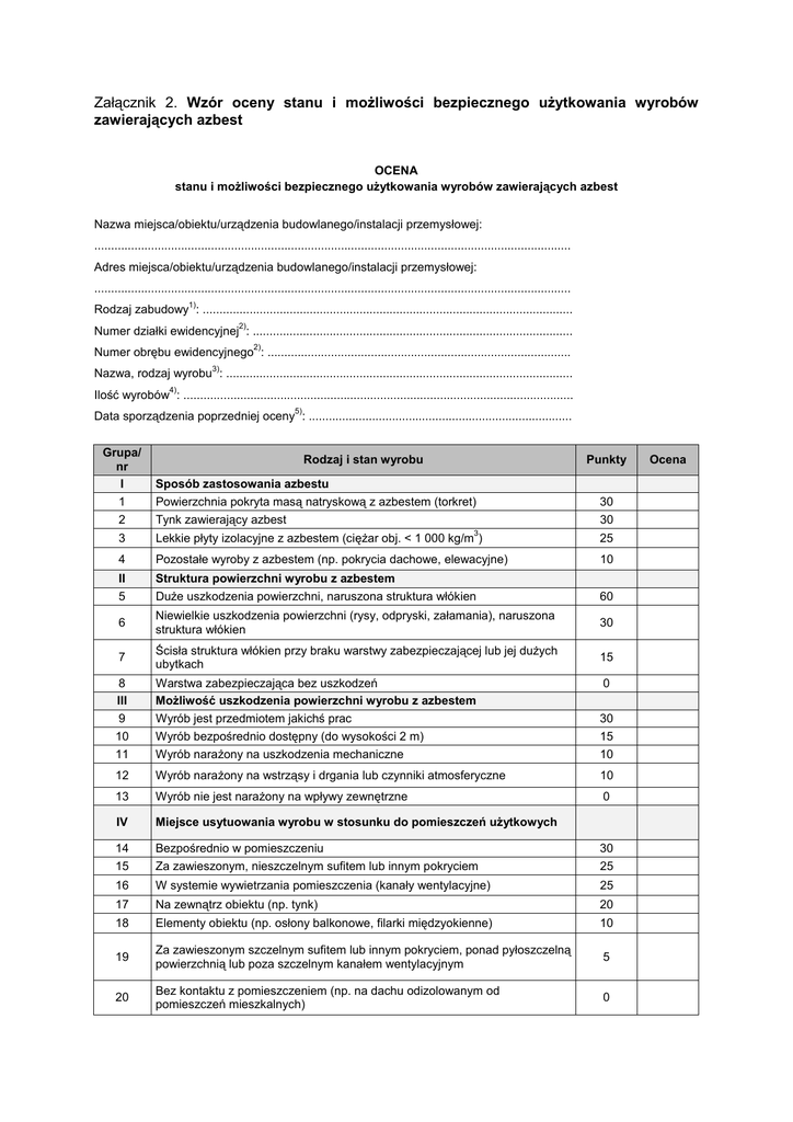 Załącznik 2. Wzór oceny stanu i możliwości bezpiecznego użytkowania wyrobów zawierających azbest OCENA stanu i możliwości bezpiecznego użytkowania wyrobów zawierających azbest Nazwa miejsca/obiektu/urządzenia budowlanego/instalacji przemysłowej: ............................................................................................................................................... Adres miejsca/obiektu/urządzenia budowlanego/instalacji przemysłowej: ............................................................................................................................................... 1) Rodzaj zabudowy : ............................................................................................................... 2) Numer działki ewidencyjnej : ................................................................................................ 2) Numer obrębu ewidencyjnego : ........................................................................................... 3) Nazwa, rodzaj wyrobu : ........................................................................................................ 4) Ilość wyrobów : ..................................................................................................................... 5) Data sporządzenia poprzedniej oceny : ............................................................................... Grupa/ nr I 1 2 Sposób zastosowania azbestu Powierzchnia pokryta masą natryskową z azbestem (torkret) Tynk zawierający azbest 3 Lekkie płyty izolacyjne z azbestem (ciężar obj. < 1 000 kg/m ) 25 4 Pozostałe wyroby z azbestem (np. pokrycia dachowe, elewacyjne) 10 II Struktura powierzchni wyrobu z azbestem 5 Duże uszkodzenia powierzchni, naruszona struktura włókien 60 6 Niewielkie uszkodzenia powierzchni (rysy, odpryski, załamania), naruszona struktura włókien 30 7 Ścisła struktura włókien przy braku warstwy zabezpieczającej lub jej dużych ubytkach 15 8 III 9 10 11 Warstwa zabezpieczająca bez uszkodzeń Możliwość uszkodzenia powierzchni wyrobu z azbestem Wyrób jest przedmiotem jakichś prac Wyrób bezpośrednio dostępny (do wysokości 2 m) Wyrób narażony na uszkodzenia mechaniczne 30 15 10 12 Wyrób narażony na wstrząsy i drgania lub czynniki atmosferyczne 10 13 Wyrób nie jest narażony na wpływy zewnętrzne 0 IV Miejsce usytuowania wyrobu w stosunku do pomieszczeń użytkowych 14 15 Bezpośrednio w pomieszczeniu Za zawieszonym, nieszczelnym sufitem lub innym pokryciem 30 25 16 W systemie wywietrzania pomieszczenia (kanały wentylacyjne) 25 17 Na zewnątrz obiektu (np. tynk) 20 18 Elementy obiektu (np. osłony balkonowe, filarki międzyokienne) 10 19 Za zawieszonym szczelnym sufitem lub innym pokryciem, ponad pyłoszczelną powierzchnią lub poza szczelnym kanałem wentylacyjnym 5 20 Bez kontaktu z pomieszczeniem (np. na dachu odizolowanym od pomieszczeń mieszkalnych) 0 Rodzaj i stan wyrobu Punkty 3 30 30 0 Ocena V Wykorzystanie miejsca/obiektu/urządzenia budowlanego/instalacji przemysłowej 21 22 23 24 Regularne przez dzieci, młodzież lub sportowców Stałe lub częste (np. zamieszkanie, miejsce pracy) Czasowe (np. domki rekreacyjne) Rzadkie (np. strychy, piwnice, komórki) 40 30 15 5 25 Nieużytkowane (np. opuszczone zabudowania mieszkalne lub gospodarskie, wyłączone z użytkowania obiekty, urządzenia lub instalacje) 0 SUMA PUNKTÓW OCENY STOPIEŃ PILNOŚCI UWAGA: W każdej z pięciu grup arkusza należy wskazać co najmniej jedną pozycję. Jeśli w grupie zostanie wskazana więcej niż jedna pozycja, sumując punkty z poszczególnych grup, należy uwzględnić tylko pozycję o najwyższej punktacji w danej grupie. Sumaryczna liczba punktów pozwala określić stopień pilności: od 120 punktów Stopień pilności I wymagane pilnie usunięcie (wymiana na wyrób bezazbestowy) lub zabezpieczenie od 95 do 115 punktów Stopień pilności II wymagana ponowna ocena w terminie do 1 roku do 90 punktów Stopień pilności III wymagana ponowna ocena w terminie do 5 lat ..................................................... Oceniający (nazwisko i imię) ................................................. Właściciel/Zarządca (podpis) .................................................... (miejscowość, data) ................................................ (adres lub pieczęć z adresem) Objaśnienia: 1) Należy podać rodzaj zabudowy: budynek mieszkalny, budynek gospodarczy, budynek przemysłowy, inny. 2) Należy podać numer obrębu ewidencyjnego i numer działki ewidencyjnej faktycznego miejsca występowania azbestu. 3) Przy określaniu rodzaju wyrobu zawierającego azbest należy stosować następującą klasyfikację: - płyty azbestowo-cementowe płaskie stosowane w budownictwie, - płyty faliste azbestowo-cementowe dla budownictwa, - rury i złącza azbestowo-cementowe, - izolacje natryskowe środkami zawierającymi w swoim składzie azbest, - wyroby cierne azbestowo-kauczukowe, - przędza specjalna, w tym włókna azbestowe obrobione, - szczeliwa azbestowe, - taśmy tkane i plecione, sznury i sznurki, - wyroby azbestowo-kauczukowe, z wyjątkiem wyrobów ciernych, - papier, tektura, - inne wyroby zawierające azbest, oddzielnie niewymienione, w tym papier i tektura, podać jakie. 4) 2 3 Ilość wyrobów azbestowych podana w jednostkach masy (Mg) oraz w jednostkach właściwych dla danego wyrobu (m , m , mb). 5) Należy podać datę przeprowadzenia poprzedniej oceny; jeśli jest to pierwsza ocena, należy wpisać „pierwsza ocena”.