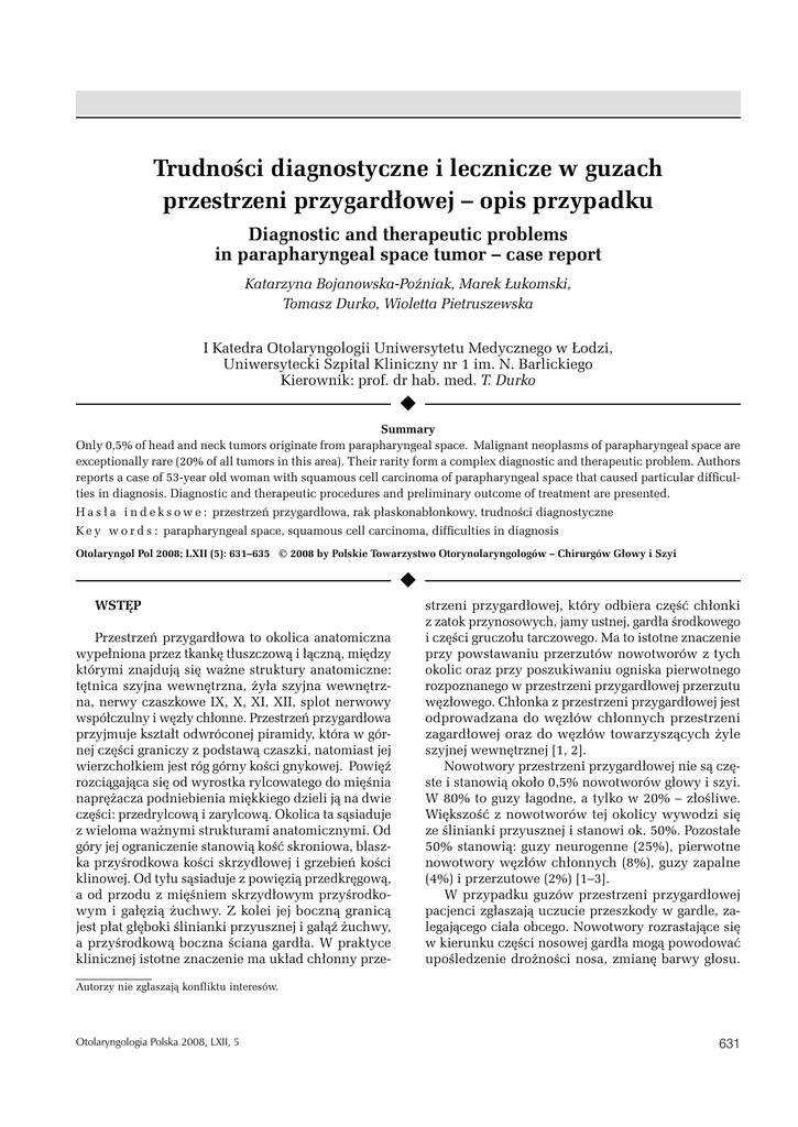 PRACE ORYGINALNE Guzy przestrzeni przygardłowej Trudności diagnostyczne i lecznicze w guzach przestrzeni przygardłowej – opis przypadku Diagnostic and therapeutic problems in parapharyngeal space tumor – case report Katarzyna Bojanowska-Poźniak, Marek Łukomski, Tomasz Durko, Wioletta Pietruszewska I Katedra Otolaryngologii Uniwersytetu Medycznego w Łodzi, Uniwersytecki Szpital Kliniczny nr 1 im. N. Barlickiego Kierownik: prof. dr hab. med. T. Durko Summary Only 0,5% of head and neck tumors originate from parapharyngeal space. Malignant neoplasms of parapharyngeal space are exceptionally rare (20% of all tumors in this area). Their rarity form a complex diagnostic and therapeutic problem. Authors reports a case of 53-year old woman with squamous cell carcinoma of parapharyngeal space that caused particular difficulties in diagnosis. Diagnostic and therapeutic procedures and preliminary outcome of treatment are presented. H a s ł a i n d e k s o w e : przestrzeń przygardłowa, rak płaskonabłonkowy, trudności diagnostyczne K e y w o r d s : parapharyngeal space, squamous cell carcinoma, difficulties in diagnosis Otolaryngol Pol 2008; LXII (5): 631–635 © 2008 by Polskie Towarzystwo Otorynolaryngologów – Chirurgów Głowy i Szyi WSTĘP Przestrzeń przygardłowa to okolica anatomiczna wypełniona przez tkankę tłuszczową i łączną, między którymi znajdują się ważne struktury anatomiczne: tętnica szyjna wewnętrzna, żyła szyjna wewnętrzna, nerwy czaszkowe IX, X, XI, XII, splot nerwowy współczulny i węzły chłonne. Przestrzeń przygardłowa przyjmuje kształt odwróconej piramidy, która w górnej części graniczy z podstawą czaszki, natomiast jej wierzchołkiem jest róg górny kości gnykowej. Powięź rozciągająca się od wyrostka rylcowatego do mięśnia naprężacza podniebienia miękkiego dzieli ją na dwie części: przedrylcową i zarylcową. Okolica ta sąsiaduje z wieloma ważnymi strukturami anatomicznymi. Od góry jej ograniczenie stanowią kość skroniowa, blaszka przyśrodkowa kości skrzydłowej i grzebień kości klinowej. Od tyłu sąsiaduje z powięzią przedkręgową, a od przodu z mięśniem skrzydłowym przyśrodkowym i gałęzią żuchwy. Z kolei jej boczną granicą jest płat głęboki ślinianki przyusznej i gałąź żuchwy, a przyśrodkową boczna ściana gardła. W praktyce klinicznej istotne znaczenie ma układ chłonny prze- strzeni przygardłowej, który odbiera część chłonki z zatok przynosowych, jamy ustnej, gardła środkowego i części gruczołu tarczowego. Ma to istotne znaczenie przy powstawaniu przerzutów nowotworów z tych okolic oraz przy poszukiwaniu ogniska pierwotnego rozpoznanego w przestrzeni przygardłowej przerzutu węzłowego. Chłonka z przestrzeni przygardłowej jest odprowadzana do węzłów chłonnych przestrzeni zagardłowej oraz do węzłów towarzyszących żyle szyjnej wewnętrznej [1, 2]. Nowotwory przestrzeni przygardłowej nie są częste i stanowią około 0,5% nowotworów głowy i szyi. W 80% to guzy łagodne, a tylko w 20% – złośliwe. Większość z nowotworów tej okolicy wywodzi się ze ślinianki przyusznej i stanowi ok. 50%. Pozostałe 50% stanowią: guzy neurogenne (25%), pierwotne nowotwory węzłów chłonnych (8%), guzy zapalne (4%) i przerzutowe (2%) [1–3]. W przypadku guzów przestrzeni przygardłowej pacjenci zgłaszają uczucie przeszkody w gardle, zalegającego ciała obcego. Nowotwory rozrastające się w kierunku części nosowej gardła mogą powodować upośledzenie drożności nosa, zmianę barwy głosu. Autorzy nie zgłaszają konfliktu interesów. Otolaryngologia Polska 2008, LXII, 5 631 K. Bojanowska-Poźniak i inni Przy zamknięciu ujścia gardłowego trąbki słuchowej pojawia się niedosłuch przewodzeniowy lub wysiękowe zapalenie ucha środkowego. W badaniu przedmiotowym najbardziej charakterystycznymi objawami są: asymetria łuków podniebiennych z przemieszczeniem migdałka podniebiennego w kierunku przyśrodkowym oraz asymetria części nosowej gardła. W celu oceny rozległości procesu nowotworowego niezbędne jest wykonanie badań radiologicznych: tomografii komputerowej i rezonansu magnetycznego w płaszczyznach czołowej i poziomej. W przypadku podejrzenia etiologii naczyniowej pomocna może być arteriografia naczyń szyjnych [1–5]. Leczenie nowotworów przestrzeni przygardłowej jest przede wszystkim chirurgiczne. Najczęściej stosuje się dojście przyuszniczo-szyjne. W zależności od wielkości guza oraz jego zaawansowania może być poszerzone o usunięcie ślinianki podżuchwowej oraz mandibulektomię pośrodkową lub boczną. W przypadku nowotworów złośliwych jako uzupełnienie zabiegu operacyjnego zwykle niezbędna jest radioterapia. Nowotwory nieoperacyjne kwalifikuje się do paliatywnej radioterapii lub jednoczasowej radiochemioterapii [1, 2, 4–6]. OPIS PRZYPADKU 53-letnia pacjentka, S.B., zgłosiła się na ostry dyżur laryngologiczny w dniu 09.05.2006 r. z powodu bólu gardła promieniującego do ucha po stronie prawej oraz uczucia zawadzania w gardle, nieustępującego po leczeniu antybiotykami. Dolegliwości pojawiły się przed rokiem i znacznie nasiliły się od 3 tygodni. Pojawienie się objawów pacjentka kojarzyła z poparzeniem tej okolicy gorącym pokarmem. Chora podawała również niedosłuch prawostronny od kilku miesięcy. W wywiadzie: alergia sezonowa, choroba wrzodowa dwunastnicy, nadciśnienie tętnicze. W badaniu laryngologicznym stwierdzono po stronie prawej łuki podniebienne unieruchomione, migdałek podniebienny mały, bez treści ropnej, nieruchomy, „wmurowany” w otaczające tkanki, bez przemieszczenia w stronę przyśrodkową. Część nosowa gardła była unieruchomiona po stronie prawej. Krtań i gardło dolne nie wykazywały odchyleń od stanu prawidłowego. Po stronie prawej stwierdzono wciągniętą błonę bębenkową. Węzły chłonne szyi były niemacalne. W wykonanym badaniu audiometryczny