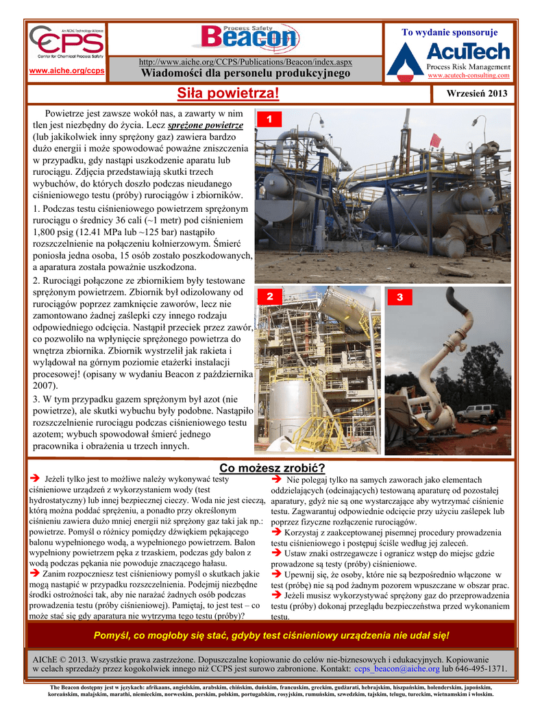 To wydanie sponsoruje www.aiche.org/ccps http://www.aiche.org/CCPS/Publications/Beacon/index.aspx Wiadomości dla personelu produkcyjnego www.acutech-consulting.com Siła powietrza! Powietrze jest zawsze wokół nas, a zawarty w nim tlen jest niezbędny do życia. Lecz sprężone powietrze (lub jakikolwiek inny sprężony gaz) zawiera bardzo dużo energii i może spowodować poważne zniszczenia w przypadku, gdy nastąpi uszkodzenie aparatu lub rurociągu. Zdjęcia przedstawiają skutki trzech wybuchów, do których doszło podczas nieudanego ciśnieniowego testu (próby) rurociągów i zbiorników. 1. Podczas testu ciśnieniowego powietrzem sprężonym rurociągu o średnicy 36 cali (~1 metr) pod ciśnieniem 1,800 psig (12.41 MPa lub ~125 bar) nastąpiło rozszczelnienie na połączeniu kołnierzowym. Śmierć poniosła jedna osoba, 15 osób zostało poszkodowanych, a aparatura została poważnie uszkodzona. 2. Rurociągi połączone ze zbiornikiem były testowane sprężonym powietrzem. Zbiornik był odizolowany od rurociągów poprzez zamknięcie zaworów, lecz nie zamontowano żadnej zaślepki czy innego rodzaju odpowiedniego odcięcia. Nastąpił przeciek przez zawór, co pozwoliło na wpłynięcie sprężonego powietrza do wnętrza zbiornika. Zbiornik wystrzelił jak rakieta i wylądował na górnym poziomie etażerki instalacji procesowej! (opisany w wydaniu Beacon z października 2007). 3. W tym przypadku gazem sprężonym był azot (nie powietrze), ale skutki wybuchu były podobne. Nastąpiło rozszczelnienie rurociągu podczas ciśnieniowego testu azotem; wybuch spowodował śmierć jednego pracownika i obrażenia u trzech innych. Wrzesień 2013 1 2 3 Co możesz zrobić? Î Jeżeli tylko jest to możliwe należy wykonywać testy ciśnieniowe urządzeń z wykorzystaniem wody (test hydrostatyczny) lub innej bezpiecznej cieczy. Woda nie jest cieczą, którą można poddać sprężeniu, a ponadto przy określonym ciśnieniu zawiera dużo mniej energii niż sprężony gaz taki jak np.: powietrze. Pomyśl o różnicy pomiędzy dźwiękiem pękającego balonu wypełnionego wodą, a wypełnionego powietrzem. Balon wypełniony powietrzem pęka z trzaskiem, podczas gdy balon z wodą podczas pękania nie powoduje znaczącego hałasu. Î Zanim rozpoczniesz test ciśnieniowy pomyśl o skutkach jakie mogą nastąpić w przypadku rozszczelnienia. Podejmij niezbędne środki ostrożności tak, aby nie narażać żadnych osób podczas prowadzenia testu (próby ciśnieniowej). Pamiętaj, to jest test – co może stać się gdy aparatura nie wytrzyma tego testu (próby)? Î Nie polegaj tylko na samych zaworach jako elementach oddzielających (odcinających) testowaną aparaturę od pozostałej aparatury, gdyż nie są one wystarczające aby wytrzymać ciśnienie testu. Zagwarantuj odpowiednie odcięcie przy użyciu zaślepek lub poprzez fizyczne rozłączenie rurociągów. Î Korzystaj z zaakceptowanej pisemnej procedury prowadzenia testu ciśnieniowego i postępuj ściśle według jej zaleceń. Î Ustaw znaki ostrzegawcze i ogranicz wstęp do miejsc gdzie prowadzone są testy (próby) ciśnieniowe. Î Upewnij się, że osoby, które nie są bezpośrednio włączone w test (próbę) nie są pod żadnym pozorem wpuszczane w obszar prac. Î Jeżeli musisz wykorzystywać sprężony gaz do przeprowadzenia testu (próby) dokonaj przeglądu bezpieczeństwa przed wykonaniem testu. Pomyśl, co mogłoby się stać, gdyby test ciśnieniowy urządzenia nie udał się! AIChE © 2013. Wszystkie prawa zastrzeżone. Dopuszczalne kopiowanie do celów nie-biznesowych i edukacyjnych. Kopiowanie w celach sprzedaży przez kogokolwiek innego niż CCPS jest surowo zabronione. Kontakt: [email protected] lub 646-495-1371. The Beacon dostępny jest w językach: afrikaans, angielskim, arabskim, chińskim, duńskim, francuskim, greckim, gudżarati, hebrajskim, hiszpańskim, holenderskim, japońskim, koreańskim, malajskim, marathi, niemieckim, norweskim, perskim, polskim, portugalskim, rosyjskim, rumuńskim, szwedzkim, tajskim, telugu, tureckim, wietnamskim i włoskim.