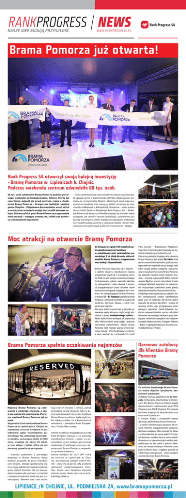 Nasze idee budują przyszłość Brama Pomorza już otwarta! Rank Progress SA otworzył swoją kolejną inwestycję - Bramę Pomorza w Lipienicach k. Chojnic. Podczas weekendu centrum odwiedziło 60 tys. osób. 60 tys. osób odwiedziło Bramę Pomorza podczas pierwszego weekendu jej funkcjonowania. Klienci, którzy już rano licznie pojawili się przed centrum, razem z dyrektorem Bramy Pomorza – Grzegorzem Jasińskim i wójtem gminy Chojnice – Zbigniewem Szczepańskim, wzięli udział w uroczystym przecięciu wstęgi oraz zrobili pierwsze zakupy. Dla wszystkich gości Brama Pomorza przygotowała wiele atrakcji – występy artystyczne, zniżki oraz konkursy z atrakcyjnymi nagrodami. – Duże zainteresowanie otwarciem Bramy Pomorza potwierdza, że wpisuje się ona w oczekiwania i potrzeby całego regionu. Cieszymy się, że mieszkańcy Chojnic i okolicznych miast mają swoje centrum handlowe i nie muszą już jeździć na zakupy do miejscowości oddalonych o kilkadziesiąt kilometrów – mówi Łukasz Gruszczyński, Dyrektor Marketingu Rank Progress SA. – W Bramie Pomorza do dyspozycji Klientów znajdują się nie tylko sklepy odzieżowe, ale również sieciowe restauracje, supermarket spożywczy oraz drogeria. Dzięki współpracy nawiązanej z lokalnymi instytucjami kultury, centrum w Lipienicach będzie również miejscem rozrywki i cyklicznych wydarzeń artystycznych – dodaje. Moc atrakcji na otwarcie Bramy Pomorza 15 listopada br. o godz. 9:00 zostało otwarte największe centrum handlowe w południowej części województwa pomorskiego. Z tej okazji dla osób, które odwiedziły Bramę Pomorza, przygotowano moc atrakcji i niespodzianek. Brama Pomorza otworzyła się z hukiem o wielkim otwarciu mieszkańcom regionu przypomniał wystrzał z prawdziwej armaty! Podczas pierwszego weekendu swojego funkcjonowania galeria zaprosiła klientów do skorzystania z wielu obniżek i promocji przygotowanych przez sieciowe marki oraz punkty usługowe znajdujące się w centrum. Na odwiedzających Bramę Pomorza w dniach 15 – 17 listopada czekały również konkursy, w których można było wygrać 10 skuterów, darmowe zakupy, a także inne atrakcyjne nagrody. Pierwszy dzień otwarcia był gratką dla pasjonatów mody. Wszyscy chętni mogli skorzystać z porad profesjonalnego stylisty – Piotra Sałaty, który doradzał, jak za pomocą kilku trików zmienić swój wygląd i dokonać niezwykłej metamorfozy. Klienci Bramy Pomorza mieli również szansę wygrać darmowe zakupy i bony do sklepów w centrum, a także spotkać się z ambasadorem marki Brama Pomorza spełnia oczekiwania najemców Najemcy Bramy Pomorza są zadowoleni z wielkiego otwarcia, a centrum spełnia ich oczekiwania. Pierwszy weekend Bramy Pomorza już za nami. Regionalne Centrum Handlowe Brama Pomorza w Lipienicach k. Chojnic to największe centrum handlowe w południowej części województwa pomorskiego. Na całkowitej powierzchni obiektu, wynoszącej około 34 000 mkw., znajduje się około 50 lokali, w tym sklepy i butiki, które po raz pierwszy pojawiły się w regionie. – Jesteśmy zadowoleni z pierwszego weekendu w Bramie Pomorza. Nasza kolekcja przypadła do gustu mieszkańcom Chojnic, dlatego spodziewamy się, że w ciągu najbliższych tygodni zyskamy grono stałych klientów. Jak się okazuje, oferta modowa dla mężczyzn w średnich i mniejszych miastach nadal nie jest wystarczająca. Panowie cały czas poszu- kują nowych trendów i kolekcji, jednak przeważnie są one dostępne tylko w dużych aglomeracjach. Cieszę się, że Klienci Bramy Pomorza od teraz będą mogli zrobić zakupy u siebie i to w komfortowych warunkach – powiedział Rafał Chrapkowicz, Prezes Pako Lorente. Oferta handlowa przygotowana przez Rank Progress wpisuje się w potrzeby mieszkańców Chojnic i okolic, co potwierdziło się już podczas pierwszego weekendu. Z wielkiego otwarcia i popularności Bramy Pomorza zadowoleni są również najemcy. Salony należące do sieci LPP, która do centrum w Lipienicach k/ Chojnic, wprowadziła komplet swoich marek – cieszyły się przez cały weekend ogromnym zainteresowaniem klientów. Znane sieci handlowe doceniły również dobór oferty centrum oraz lokalizację obiektu. Pako Lorente – Radosławem Majdanem. Tego dnia na terenie galerii pojawiły się stoiska do makijażu oraz stylizacji fryzur. Muzyczną gwiazdą drugiego dnia otwarcia Bramy Pomorza był zespół De Mono. Fani oprócz wysłuchania koncertu, podczas którego centrum wypełniło się po brzegi, mieli także okazję zdobyć autografy i porozmawiać z muzykami. Na scenie Bramy Pomorza nie zabrakło również innych znanych artystów - imprezę poprowadził Skiba, członek zespołu Big Cyc, a przez całą sobotę trwały występy lokalnych zespołów. Na zakończenie muzycznego szaleństwa przed galerią odbył się niezwykły pokaz pirotechniczny. Ostatniego dnia organizatorzy zadbali o dobre samopoczucie swoich najmłodszych gości oraz ich rodziców. Na terenie galerii pojawiły się atrakcje dla dzieci - stoiska do animacji, strefa Lego przygotowana przez jednego z najemców - Świat Zabawek, kąciki do malowania buziek, a przez cały dzień odbywały się występy lokalnych grup dziecięcych. Natomiast specjalnie dla rodziców wystąpił niepowtarzalny Grzegorz Halama – jeden z najpopularniejszych artystów sceny kabaretowej w Polsce. Darmowe autobusy dla klientów Bramy Pomorza Do centrum handlowego Brama Pomorza można dojechać specjalnymi, bezpłatnymi autobusami. Autobusy kursują codziennie od 15 listopada z kilkunastu przystanków w Chojnicach. Do Bramy Pomorza Klienci dojadą dwoma liniami, realizowanymi przez PKS Chojnice oraz MKZ Chojnice. Przystanek końcowy znajduje się bezpośrednio przy centrum w Lipienicach k. Chojnic. Każdy z przejazdów będzie darmowy dla Klientów Bramy Pomorza. – Z myślą o komfortowych zakupach, dla naszych Klientów przygotowaliśmy specjalne, darmowe autobusy, które 