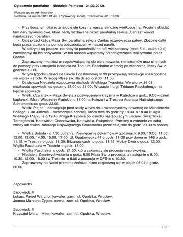 Ogłoszenia parafialne - Niedziela Palmowa - 24.03.2013r. Wpisany przez Administrator niedziela, 24 marca 2013 01:49 - Poprawiony sobota, 13 kwietnia 2013 10:20 - Przy bocznym ołtarzu znajduje się kosz na naszą jałmużnę wielkopostną. Prosimy składać tam dary żywnościowe, które będą rozdawane przez parafialną sekcję „Caritas” wśród najuboższych parafian. - Dziś przed każdą Mszą Św. parafialna sekcja Caritas rozprowadza palmy. Złożone datki będą przeznaczone na pomoc potrzebującym w naszej parafii. - W zakrystii są jeszcze do nabycia paschaliki na stół wielkanocny (małe 5 zł., duże 10 zł) zachęcamy do ich nabywania. W ten sposób wspieramy przedsięwzięcia realizowane przez Caritas. - Zapraszamy młodzież przygotowującą się do bierzmowania, ministrantów oraz chętnych do pomocy przy ustrajaniu Kościoła na Triduum Paschalne w środę po wieczornej Mszy Św. o godzinie 19.00. - W tym tygodniu dzieci ze Szkoły Podstawowej nr 99 przeżywają rekolekcje wielkopostne we wtorek i środę. W środę Msze św. dla dzieci o 9.00 i 11.00. - Dzisiejsza Niedziela rozpoczyna obchody Wielkiego Tygodnia. We wtorek 26.03 możliwość spowiedzi od godziny 18.00 do 21.00. W czasie liturgii Triduum Paschalnego nie będzie spowiedzi. - Wielki Czwartek – Msza Święta z poświęceniem krzyżma w Katedrze o godz. 9.00 – dzień kapłański. Msza Wieczerzy Pańskiej o 18.00 na Księżu i w Trestnie Adoracja Najświętszego Sakramentu do godz. 22.00. - Wielki Piątek – obowiązuje post ścisły w tym dniu rozpoczynamy nowennę do Miłosierdzia Bożego. 7.30 Jutrznia – rozpoczęcie adoracji, która trwa do godziny 18.00. o 18.00 liturgia Wielkiego Piątku, a o 19.45 Droga Krzyżowa po osiedlu następującymi ulicami: Świątnicka, Tarnogórska, Katowicka, Chorzowska, Katowicka, Świątnicka. Prosimy o zabranie ze sobą zniczy lub świec. Adoracja Najświętszego Sakramentu przez całą noc do godz. 20.00 w sobotę. - Wielka Sobota - o 7.30 Jutrznia. Poświęcenie pokarmów w godzinach: 9.00, 10.00, 11.00, 12.00, 13.00, 14.00, 15.00, 17.00. Ul. Opatowiecka 41 o godz. 11.00 przy domu nr 146 o godz. 11.15, w Trestnie o godz. 11.30, Blizanowicach o godz. 11.45, Mokry Dwór o godz. 12.00. Wigilia Paschalna w Trestnie o godz. 18.00 - Wigilia Paschalna o godz. 21.00, która zakończy się procesją rezurekcyjną. - Niedziela Zmartwychwstania o godz. 6.00 Msza Św. z procesją, a następnie o 9.00, 10.30, 12.00, 18.00 i w Trestnie o 6.00 z procesją w DPS-ie o 10.30. - Zapraszamy na Nauki przedmałżeńskie, które rozpoczną się w piątek 05.04 o godz. 20.00. Zapowiedzi Zapowiedź II Łukasz Paweł Warchoł, kawaler, zam. ul. Opolska, Wrocław. Joanna Marzena Zygan, panna, zam. ul. Opolska, Wrocław. Zapowiedź II Krzysztof Marcin Miter, kawaler, zam. ul. Opolska, Wrocław. 1/2 Ogłoszenia parafialne - Niedziela Palmowa - 24.03.2013r. Wpisany przez Administrator niedziela, 24 marca 2013 01:49 - Poprawiony sobota, 13 kwietnia 2013 10:20 Agnieszka Makowiecka, panna, zam. ul. Opolska, Wrocław. Zapowiedź II Robert Gromadziński, kawaler, zam. zam. ul. Opolska, Wrocław. Katarzyna Ewa Stefanienko, panna, zam. ul. Opolska, Wrocław. Zapowiedź I Damian Adrian Kulawiak, kawaler, zam. ul. Tyska, Wrocław. Marta Ewa Szponar, panna, zam. ul. Orzechowa, Wrocław. 2/2