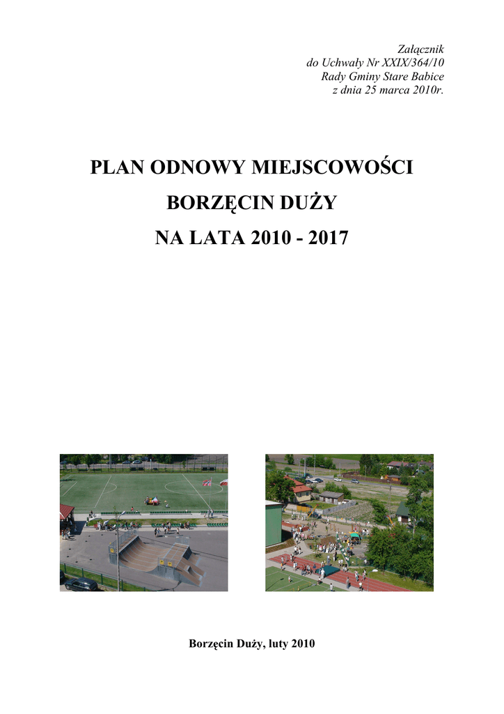 Załącznik do Uchwały Nr XXIX/364/10 Rady Gminy Stare Babice z dnia 25 marca 2010r. PLAN ODNOWY MIEJSCOWOŚCI BORZĘCIN DUŻY NA LATA 2010 - 2017 Borzęcin Duży, luty 2010 SPIS TREŚCI I. Wstęp 3 II. Charakterystyka miejscowości Borzęcin Duży 4 1. Położenie administracyjne, geograficzne, komunikacyjne 4 2. Gleby 5 3. Klimat 6 4. Historia 7 Opis zasobów miejscowości Borzęcin Duży 9 1. Ludność 9 2. Środowisko przyrodnicze 9 3. Infrastruktura techniczna 10 4. Rolnictwo 11 5. Ochrona środowiska 11 6. Infrastruktura społeczna 17 7. Aktywność społeczna mieszkańców Borzęcin Duży 19 8. Analiza SWOT 24 IV. Wizja miejscowości, cele strategiczne, przewidywane do realizacji przedsięwzięcia w ramach Planu Odnowy Miejscowości Borzęcin Duży w latach 2010-2017 25 V. Harmonogram realizacji i przewidywany koszt planowanych zadań 28 III. 2 I. Wstęp Rozwój i odnowa obszarów wiejskich to jedno z kluczowych wyzwań, jakie stoją przed Polską w okresie integracji z Unią Europejską. Zasadniczym jej celem jest wzmocnienie działań służących zmniejszaniu istniejących dysproporcji i różnic w poziomie rozwoju obszarów wiejskich w stosunku do terenów miejskich. Plan Odnowy Miejscowości jest jednym z najważniejszych elementów odnowy wsi, jej rozwoju oraz poprawy warunków pracy i życia mieszkańców. Sporządzenie i uchwalenie takiego dokumentu stanowi niezbędny warunek przy aplikowaniu o środki finansowe w ramach „Programu Rozwoju Obszarów Wiejskich 2007-2013”. Plan Odnowy Miejscowości Borzęcin Duży to dokument, który określa strategię działań w sferze społeczno-gospodarczej na lata 2010-2017. Obszarem realizacji Planu Odnowy Miejscowości Borzęcin Duży jest teren tej miejscowości. Niniejszy plan jest planem otwartym, stwarzającym możliwość aktualizacji w zależności od potrzeb społecznych i uwarunkowań finansowych. Oznacza to, że przewiduje się dopisywanie nowych zadań, a także zmianę kolejności ich realizacji w zależności od uruchomienia i dostępu do funduszy zewnętrznych. Opracowując niniejszą dokumentację zachowano zgodność z obowiązującymi dokumentami programowymi, a w szczególności z: • Strategią Zrównoważonego Rozwoju Gminy Stare Babice do roku 2020 (uchwała nr XL/355/06 Rady Gminy Stare Babice z dnia 28 września 2006 r.), • Studium Uwarunkowań i Kierunków Zagospodarowania Przestrzennego Gminy Stare Babice (uchwała nr XXXVIII/326/06 Rady Gminy Stare Babice z dnia 1 czerwca 2006 r.). Plan Odnowy Miejscowości jest dokumentem uchwalanym przez zebranie wiejskie oraz uchwałą Rady Gminy w sprawie zatwierdzenia Planu Odnowy Miejscowości. 3 II. Charakterystyka miejscowości Borzęcin Duży 1. Położenie administracyjne, geograficzne, komunikacyjne Mapka Gminy Stare Babice Wieś Borzęcin Duży położona jest 8 kilometrów od centrum administracyjnego Gminy Stare Babice, a 20 kilometrów od centrum stolicy Warszawy. Z Warszawą skomunikowana jest linią podmiejską 719 i 729. Wieś otoczona jest z jednej strony Puszczą Kampinoską, z drugiej polami wzdłuż drogi Warszawa - Żelazowa Wola Sochaczew. Przed 1990r. była jedynie rolno - ogrodniczym zapleczem Warszawy. Po odrodzeniu się Samorządu wieś powoli przekształciła się w zespół osiedli mieszkalnych, obszar działalności gospodarczej i ekologicznej. Borzęcin Duży stanowi dobre miejsce do życia i prowadzenia biznesu. 4 Widok na drogę Warszawa-Żelazowa Wola-Sochaczew w Borzęcinie Dużym 2. Gleby Instytut Upraw, Nawożenia i Gleboznawstwa w Puławach zakwalifikował obszar Gminy Stare Babice do dwóch regionów glebowo – rolniczych: Rejon Ożarowsko – Błoński obejmujący południową część gminy i Rejon Kampinoski obejmujący północną część gminy. Rejon Ożarowsko - Błoński cechuje najlepszej jakości i przydatności glebowo rolniczej w gminie, a Rejon Kampinoski cechuje się dużą lesistością oraz dużym udziałem łąk na glebach organicznych. Tereny zmeliorowane stanowią ok. 80% użytków rolnych. Wieś Borzęcin Duży znajduje się w większej części w Rejonie Ożarowsko – Błońskim. Warunki środowiska dla produkcji rolniczej we wsi Borzęcin Duży są bardzo korzystne. W strukturze użytków rolnych dominują grunty orne tworzące kompleksy gleb o bardzo wysokiej bonitacji, znajdują się one w centralnej i południowej części wsi Borzęcin Duży. Są to gleby brunatne właściwe i czarne ziemie zdegradowane oraz gleby szare. W części północnej wsi Borzęcin Duży znajduje się więcej nieużytków i lasów. Na terenie wsi Borzęcin Duży przeważają gleby V i IV klasy. 5 Okolice Borzęcina Dużego 3. Klimat Warunki klimatyczne gminy, a więc i wsi Borzęcin Duży są typowe dla środkowego Mazowsza, w skali kraju względnie ciepłe, zwłaszcza latem i raczej suche. Zaznacza się tu przewaga wpływów kontynentalnych. Z rolniczego punktu widzenia warunki klimatyczne charakteryzują się nieco zbyt niskim opadem 550-575 mm/rok, co jest jednak wartością średnią w skali regionu, podobnie jak liczba dni z opadem wynosząca 155-160. Długość okresu wegetacyjnego ok. 215 dni typowa dla regionu nie ogranicza możliwości uprawy podstawowych gatunków uprawnych. Okres bezprzymrozkowy ok. 170 dni również jest typowy dla regionu, a wartości wyraźnie wyższe wiążą się tylko z wyspą ciepła nad Warszawą. Z punktu widzenia klimatu odczuwalnego korzystne jest przewietrzanie – wiatry o średniej prędkości 2-3 m/sek. z silną dominacją kierunków zachodnich, a więc znad terenów rolnych i leśnych. Dni pogodnych o zachmurzeniu poniżej 20% jest ok. 35 rocznie tj. więcej niż w Warszawie, dni pochmurnych 135-140 tj. mniej niż w Warszawie. 6 4. Historia Parafia Borzęcin należy do najstarszych na Mazowszu. Powstała między rokiem 1166, a 1254. Pierwsze oficjalne wzmianki o wsi pochodzą z roku 1254 kiedy to Papież Innocenty IV mówi o życiu kościoła parafialnego w Borzęcinie. Kościół w 