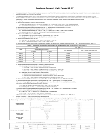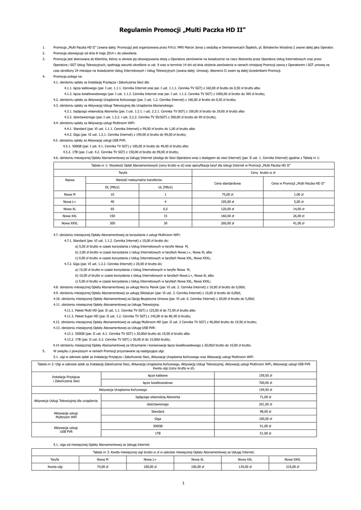 Regulamin Promocji „Multi Paczka HD II” 1. Promocja „Multi Paczka HD II” (zwana dalej: Promocją) jest organizowana przez P.H.U. MMJ Marcin Janos z siedzibą w Siemianowicach Śląskich, pl. Bohaterów Września 2 zwane dalej jako Operator. 2. Promocja obowiązuje od dnia 8 maja 2014 r. do odwołania. 3. Promocja jest skierowana do Klientów, którzy w okresie jej obowiązywania złożą u Operatora zamówienie na świadczenie na rzecz Abonenta przez Operatora Usług Internetowych oraz przez Operatora i SGT Usług Telewizyjnych, spełniają warunki określone w ust. 9 oraz w terminie 14 dni od dnia złożenia zamówienia w ramach niniejszej Promocji zawrą z Operatorem i SGT umowę na czas określony 24 miesiące na świadczenie Usług Internetowych i Usług Telewizyjnych (zwana dalej: Umową). Abonenci Ci zwani są dalej Uczestnikami Promocji. 4. Promocja polega na: 4.1. obniżeniu opłaty za Instalację Przyłącza i Zakończenia Sieci dla: 4.1.1. łącza kablowego (par. I ust. 1.1.1. Cennika Internet oraz par. I ust. 1.1.1. Cennika TV SGT) z 160,00 zł brutto do 0,50 zł brutto albo 4.1.2. łącza światłowodowego (par. I ust. 1.1.2. Cennika Internet oraz par. I ust. 1.1.2. Cennika TV SGT) z 1000,00 zł brutto do 300 zł brutto; 4.2. obniżeniu opłaty za Aktywację Urządzenia Końcowego (par. I ust. 1.2. Cennika Internet) z 160,00 zł brutto do 0,50 zł brutto; 4.3. obniżeniu opłaty za Aktywację Usługi Telewizyjnej dla Urządzenia Abonenckiego: 4.3.1. będącego własnością Abonenta (par. I ust. 1.2.1. i ust. 2.2.1. Cennika TV SGT) z 100,00 zł brutto do 29,00 zł brutto albo 4.3.2. dzierżawionego (par. I ust. 1.2.2. i ust. 2.2.2. Cennika TV ID/SGT) z 300,00 zł brutto do 99 zł brutto; 4.4. obniżeniu opłaty za Aktywację usługi Multiroom WiFi: 4.4.1. Standard (par. VI ust. 1.1.1. Cennika Internet) z 99,00 zł brutto do 1,00 zł brutto albo 4.4.2. Giga (par. VI ust. 1.2.1. Cennika Internet) z 199,00 zł brutto do 99,00 zł brutto; 4.5. obniżeniu opłaty za Aktywację usługi USB PVR: 4.5.1. 500GB (par. I ust. 4.1. Cennika TV SGT) z 100,00 zł brutto do 49,00 zł brutto albo 4.5.2. 1TB (par. I ust. 4.2. Cennika TV SGT) z 150,00 zł brutto do 99,00 zł brutto; 4.6. obniżeniu miesięcznej Opłaty Abonamentowej za Usługę Internet (dostęp do Sieci Operatora wraz z dostępem do sieci Internet) (par. II ust. 1. Cennika Internet) zgodnie z Tabelą nr 1: Tabela nr 1: Wysokość Opłat Abonamentowych (ceny brutto w zł) oraz specyfikacja taryf dla Usługi Internet w Promocji „Multi Paczka HD II” Taryfa Nazwa Ceny brutto w zł Wartość maksymalne transferów DL [Mb/s] UL [Mb/s] Cena standardowa Cena w Promocji „Multi Paczka HD II” 1,00 zł Nowa M 10 1 75,00 zł Nowa L+ 40 4 105,00 zł 5,00 zł Nowa XL 65 6,5 120,00 zł 14,00 zł Nowa XXL 150 15 160,00 zł 26,00 zł Nowa XXXL 300 30 260,00 zł 41,00 zł 4.7. obniżeniu miesięcznej Opłaty Abonamentowej za korzystanie z usługi Multiroom WiFi: 4.7.1. Standard (par. VI ust. 1.1.2. Cennika Internet) z 10,00 zł brutto do: a) 5,00 zł brutto w czasie korzystania z Usług Internetowych w taryfie Nowa M, b) 2,00 zł brutto w czasie korzystania z Usług Internetowych w taryfach Nowa L+, Nowa XL albo c) 0,00 zł brutto w czasie korzystania z Usług Internetowych w taryfach Nowa XXL, Nowa XXXL; 4.7.2. Giga (par. VI ust. 1.2.2. Cennika Internet) z 20,00 zł brutto do: a) 15,00 zł brutto w czasie korzystania z Usług Internetowych w taryfie Nowa M, b) 10,00 zł brutto w czasie korzystania z Usług Internetowych w taryfach Nowa L+, Nowa XL albo c) 5,00 zł brutto w czasie korzystania z Usług Internetowych w taryfach Nowa XXL, Nowa XXXL; 4.8. obniżeniu miesięcznej Opłaty Abonamentowej za usługę Nocny Marek (par. VI ust. 2. Cennika Internet) z 10,00 zł brutto do 0,00zł; 4.9. obniżeniu miesięcznej Opłaty Abonamentowej za usługę SilesiaLan (par. VI ust. 3. Cennika Internet) z 10,00 zł brutto do 0,00zł; 4.10. obniżeniu miesięcznej Opłaty Abonamentowej za Opcję Bezpieczna Umowa (par. VI ust. 6. Cennika Internet) z 20,00 zł brutto do 5,00zł; 4.11. obniżeniu miesięcznej Opłaty Abonamentowej za Usługę Telewizyjną: 4.11.1. Pakiet Multi HD (par. II ust. 1.1. Cennika TV SGT) z 125,00 zł do 73,90 zł brutto albo 4.11.3. Pakiet Super HD (par. II ust. 1.2. Cennika TV SGT) z 145,00 zł do 86,90 zł brutto; 4.12. obniżeniu miesięcznej Opłaty Abonamentowej za usługę Multiroom HD (par. II ust. 2 Cennika TV SGT) z 46,00zł brutto do 19,90 zł brutto; 4.13. obniżeniu miesięcznej Opłaty Abonamentowej za Usługę USB PVR: 4.13.1. 500GB (par. II ust. 6.1. Cennika TV SGT) z 20,00zł brutto do 10,00 zł brutto albo 4.13.2. 1TB (par. II ust. 6.2. Cennika TV SGT) z 30,00 zł do 15,00zł brutto; 4.14 obniżeniu miesięcznej Opłaty Abonamentowej za Utrzymanie i konserwacje łącza światłowodowego z 20,00zł brutto do 10,00 zł brutto. 5. W związku z powyższym w ramach Promocji przyznawane są następujące ulgi: 5.1. ulgi w zakresie opłat za Instalację Przyłącza i Zakończenia Sieci, Aktywację Urządzenia Końcowego oraz Aktywację usługi Multiroom WiFi: Tabela nr 2: Ulgi w zakresie opłat za Instalację Zakończenia Sieci, Aktywację Urządzenia Końcowego, Aktywację Usługi Telewizyjnej, Aktywację usługi Multiroom WiFi, Aktywację usługi USB PVR Kwota ulgi (ceny brutto w zł). Instalacja Przyłącza i Zakończenia Sieci łącze kablowe 159,50 zł łącze światłowodowe 700,00 zł Aktywacja Urządzenia Końcowego Aktywacja Usługi Telewizyjnej dla urządzenia 159,50 zł będącego własnością Abonenta 71,00 zł dzierżawionego 201,00 zł Aktywacja usługi Multiroom WiFi Aktywacja usługi USB PVR Standard 98,00 zł Giga 100,00 zł 500GB 51,00 zł 1TB 51,00 zł 5.1. ulga od miesięcznej Opłaty Abonamentowej za Usługę Internet: Tabela nr 3: Kwota miesięcznej ulgi brutto w zł w zakresie miesięcznej Opłaty Abonamentowej za Usługę Internet. Taryfa Nowa M Nowa L+ Nowa XL Nowa XXL Nowa XXXL Kwota