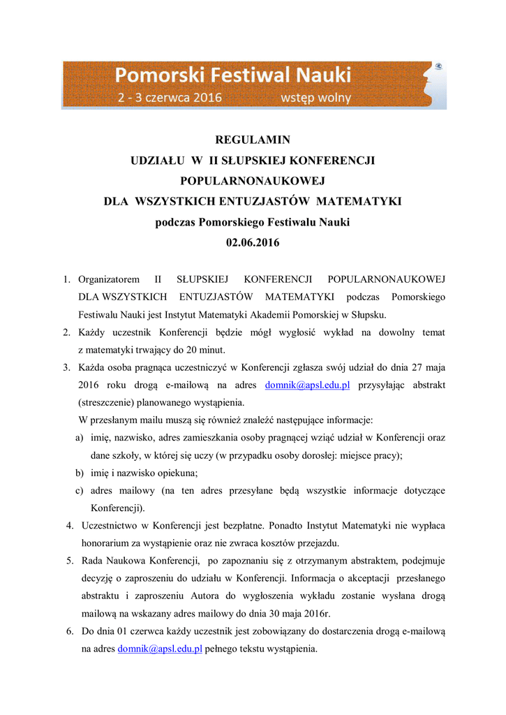 REGULAMIN UDZIAŁU W II SŁUPSKIEJ KONFERENCJI POPULARNONAUKOWEJ DLA WSZYSTKICH ENTUZJASTÓW MATEMATYKI podczas Pomorskiego Festiwalu Nauki 02.06.2016 1. Organizatorem II DLA WSZYSTKICH SŁUPSKIEJ KONFERENCJI ENTUZJASTÓW POPULARNONAUKOWEJ MATEMATYKI podczas Pomorskiego Festiwalu Nauki jest Instytut Matematyki Akademii Pomorskiej w Słupsku. 2. Każdy uczestnik Konferencji będzie mógł wygłosić wykład na dowolny temat z matematyki trwający do 20 minut. 3. Każda osoba pragnąca uczestniczyć w Konferencji zgłasza swój udział do dnia 27 maja 2016 roku drogą e-mailową na adres [email protected] przysyłając abstrakt (streszczenie) planowanego wystąpienia. W przesłanym mailu muszą się również znaleźć następujące informacje: a) imię, nazwisko, adres zamieszkania osoby pragnącej wziąć udział w Konferencji oraz dane szkoły, w której się uczy (w przypadku osoby dorosłej: miejsce pracy); b) imię i nazwisko opiekuna; c) adres mailowy (na ten adres przesyłane będą wszystkie informacje dotyczące Konferencji). 4. Uczestnictwo w Konferencji jest bezpłatne. Ponadto Instytut Matematyki nie wypłaca honorarium za wystąpienie oraz nie zwraca kosztów przejazdu. 5. Rada Naukowa Konferencji, po zapoznaniu się z otrzymanym abstraktem, podejmuje decyzję o zaproszeniu do udziału w Konferencji. Informacja o akceptacji przesłanego abstraktu i zaproszeniu Autora do wygłoszenia wykładu zostanie wysłana drogą mailową na wskazany adres mailowy do dnia 30 maja 2016r. 6. Do dnia 01 czerwca każdy uczestnik jest zobowiązany do dostarczenia drogą e-mailową na adres [email protected] pełnego tekstu wystąpienia. 7. Konferencja odbywać się będzie w czwartek 2 czerwca 2016 roku w auli nr 16 w budynku Instytutu Matematyki Akademii Pomorskiej przy ulicy Arciszewskiego 22 d. 8. 1 czerwca 2016 każdy z uczestników otrzyma na podany przez siebie adres mailowy program imprezy. 9. Na sali wykładowej dostępna będzie tablica z kredą, komputer, rzutnik. 10. Udział w konferencji jest równoznaczny z wyrażeniem przez osoby uczestniczące zgody na przetwarzanie przez organizatora ich danych osobowych na potrzeby Konferencji oraz w celach promocyjnych organizatora (ustawa o ochronie danych osobowych z dn.29.08.1997 r. Dz.U. Nr 133 poz.833 z póz. zm.) 11. Osoby uczestniczące w Konferencji potwierdzają swoją zgodę na powyższe poprzez dostarczenie do organizatora (najpóźniej w dniu konferencji) oświadczenia zgodnie ze wzorem załączonym poniżej regulaminu (Załącznik 1) oraz oświadczenia opiekuna prawnego uczestnika (Załącznik 2 - w przypadku osoby niepełnoletniej) . Załącznik 1 OŚWIADCZENIE UCZESTNIKA II SŁUPSKIEJ KONFERENCJI POPULARNONAUKOWEJ DLA WSZYSTKICH ENTUZJASTÓW MATEMATYKI Imię i nazwisko uczestnika Konferencji …………………...……………………………………………………………………………… Wiek, klasa, nazwa szkoły/miejsce pracy ……………………...…………………………………………………………………………… Adres zamieszkania …………………………………………………………………………………………………... Adres e-mail do korespondencji ………………………………..…………………………………………………………………. Oświadczam, że zapoznałam/em się z Regulaminem II SŁUPSKIEJ KONFERENCJI POPULARNONAUKOWEJ DLA WSZYSTKICH ENTUZJASTÓW MATEMATYKI i akceptuję jego warunki. Oświadczam, że moja praca pt……………………………………………………………………………………………….. a) została przygotowana przeze mnie samodzielnie (uwzględniając merytoryczny wkład nauczyciela/opiekuna naukowego; b) nie narusza praw autorskich w rozumieniu ustawy z dnia 4 lutego 1994 roku o prawie autorskim i prawach pokrewnych (Dz.U. nr 24, poz. 83 z późn. Zm.) oraz dóbr osobistych chronionych prawem; c) nie zawiera danych i informacji, które uzyskałem w sposób niedozwolony. ………………….……………… Data i podpis Załącznik 2 OŚWIADCZENIE OPIEKUNA PRAWNEGO UCZESTNIKA II SŁUPSKIEJ KONFERENCJI POPULARNONAUKOWEJ DLA WSZYSTKICH ENTUZJASTÓW MATEMATYKI Imię i nazwisko opiekuna prawnego uczestnika Konferencji ……………………………………………………………………………………...…………… Adres zamieszkania …………………………………………………………………………………………………... Adres e-mail do korespondencji ……………………...…………………………………………………………………………… Oświadczam, że jestem opiekunem prawnym .............................................................(imię i nazwisko uczestnika) oraz zapoznałam/zapoznałem się z treścią Regulaminu i wyrażam zgodę na udział ............................................................. (imię i nazwisko uczestnika) w II SŁUPSKIEJ KONFERENCJI POPULARNONAUKOWEJDLA WSZYSTKICH ENTUZJASTÓW MATEMATYKI. ………………….……………… Data i podpis