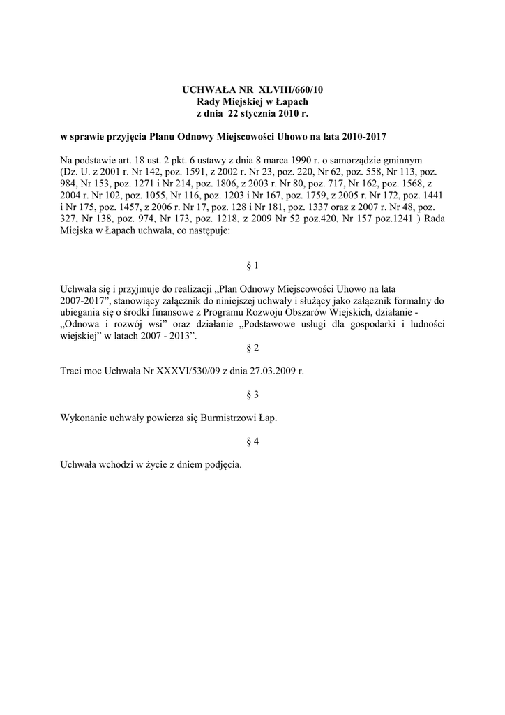 UCHWAŁA NR XLVIII/660/10 Rady Miejskiej w Łapach z dnia 22 stycznia 2010 r. w sprawie przyjęcia Planu Odnowy Miejscowości Uhowo na lata 2010-2017 Na podstawie art. 18 ust. 2 pkt. 6 ustawy z dnia 8 marca 1990 r. o samorządzie gminnym (Dz. U. z 2001 r. Nr 142, poz. 1591, z 2002 r. Nr 23, poz. 220, Nr 62, poz. 558, Nr 113, poz. 984, Nr 153, poz. 1271 i Nr 214, poz. 1806, z 2003 r. Nr 80, poz. 717, Nr 162, poz. 1568, z 2004 r. Nr 102, poz. 1055, Nr 116, poz. 1203 i Nr 167, poz. 1759, z 2005 r. Nr 172, poz. 1441 i Nr 175, poz. 1457, z 2006 r. Nr 17, poz. 128 i Nr 181, poz. 1337 oraz z 2007 r. Nr 48, poz. 327, Nr 138, poz. 974, Nr 173, poz. 1218, z 2009 Nr 52 poz.420, Nr 157 poz.1241 ) Rada Miejska w Łapach uchwala, co następuje: §1 Uchwala się i przyjmuje do realizacji „Plan Odnowy Miejscowości Uhowo na lata 2007-2017”, stanowiący załącznik do niniejszej uchwały i służący jako załącznik formalny do ubiegania się o środki finansowe z Programu Rozwoju Obszarów Wiejskich, działanie „Odnowa i rozwój wsi” oraz działanie „Podstawowe usługi dla gospodarki i ludności wiejskiej” w latach 2007 - 2013”. §2 Traci moc Uchwała Nr XXXVI/530/09 z dnia 27.03.2009 r. §3 Wykonanie uchwały powierza się Burmistrzowi Łap. §4 Uchwała wchodzi w życie z dniem podjęcia. Załącznik do Uchwały Nr XLVIII/660/10 Rady Miejskiej w Łapach z dnia 22 stycznia 2010r. PLAN ODNOWY MIEJSCOWOŚCI UHOWO NA LATA 2010-2017 Opracowany przez: - Mieszkańców miejscowości Uhowo - Liderzy lokalni: - Bielawski Wojciech – Sołtys - Barańczuk Jerzy- mieszkaniec Uhowa, pracownik Domu Kultury - Małachwiej Wiesław- mieszkaniec Uhowa - Bielawski Łukasz- mieszkaniec Uhowa 2 Spis treści Spis treści....................................................................................................................................3 1. Wstęp......................................................................................................................................4 3.2. Społeczna aktywność mieszkańców................................................................................8 3.3. Szkolnictwo......................................................................................................................8 3.4. Bezpieczeństwo publiczne...............................................................................................9 3.5. Kultura.............................................................................................................................9 3.6. Obiekty rekreacyjne i sportowe.....................................................................................10 3.7 Ochrona zdrowia ............................................................................................................10 4. Infrastruktura techniczna.......................................................................................................11 4.1. Zaopatrzenie w wodę.....................................................................................................11 4.2. Kanalizacja i oczyszczanie ścieków...............................................................................11 4.3. Utylizacja odpadów stałych...........................................................................................11 4.4. Telefonizacja i Internet..................................................................................................11 4.5. Drogi..............................................................................................................................11 4.6. System komunikacji.......................................................................................................11 5. Sfera gospodarcza.................................................................................................................12 5.1. Przedsiębiorczość...........................................................................................................12 5.2. Rolnictwo.......................................................................................................................12 5.3. Leśnictwo.......................................................................................................................12 6. Analiza SWOT......................................................................................................................13 7. Wizja rozwoju sołectwa........................................................................................................14 8. Priorytety, cele i działania ....................................................................................................14 9. Harmonogram realizacji celów i działań ..............................................................................16 10. Analiza trwałości projektu ................................................................................................21 11. Zakończenie i wnioski........................................................................................................22 3 1. Wstęp Plan Odnowy Miejscowości Uhowo na lata 2009-2016 zawiera krótki rys historyczny, opis warunków geograficznych, sfery społecznej i gospodarczej oraz infrastruktury technicznej. Przedstawiona analiza SWOT pozwoliła na ustalenie priorytetów w działaniach na przyszłe lata. Szansą rozwoju naszej miejscowości jest eksponowanie walorów turystycznych przy jednoczesnym dbaniu o bezpieczeństwo, kulturę i środowisko naturalne. Zebranie i spisanie różnych informacji na temat miejscowości pozwoliło na opracowanie tego planu, a tym samym na wytyczenie celów zgodnych z wizją rozwoju. Celem realizacji planu i środkiem pozwalającym na przeprowadzenie działań jest mobilizacja społeczności lokalnej albo aktywności i współpracy na rzecz poprawy warunków i jakości życia mieszkańców, turystów i przyszłych pokoleń. 4 2. Charakterystyka miejscowości 2.1. Rys historyczny Uhowo leży na prawym brzegu górnego biegu Narwi. Po