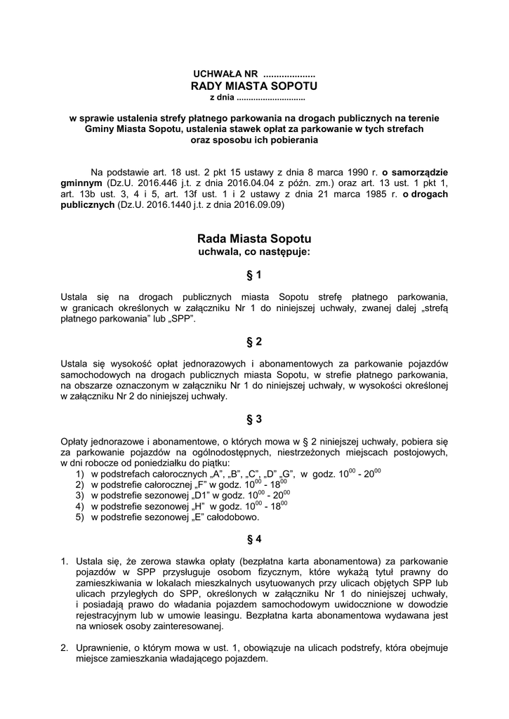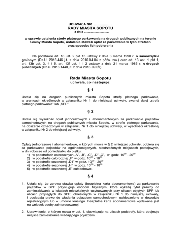 UCHWAŁA NR .................... RADY MIASTA SOPOTU z dnia ............................. w sprawie ustalenia strefy płatnego parkowania na drogach publicznych na terenie Gminy Miasta Sopotu, ustalenia stawek opłat za parkowanie w tych strefach oraz sposobu ich pobierania Na podstawie art. 18 ust. 2 pkt 15 ustawy z dnia 8 marca 1990 r. o samorządzie gminnym (Dz.U. 2016.446 j.t. z dnia 2016.04.04 z późn. zm.) oraz art. 13 ust. 1 pkt 1, art. 13b ust. 3, 4 i 5, art. 13f ust. 1 i 2 ustawy z dnia 21 marca 1985 r. o drogach publicznych (Dz.U. 2016.1440 j.t. z dnia 2016.09.09) Rada Miasta Sopotu uchwala, co następuje: §1 Ustala się na drogach publicznych miasta Sopotu strefę płatnego parkowania, w granicach określonych w załączniku Nr 1 do niniejszej uchwały, zwanej dalej „strefą płatnego parkowania” lub „SPP”. §2 Ustala się wysokość opłat jednorazowych i abonamentowych za parkowanie pojazdów samochodowych na drogach publicznych miasta Sopotu, w strefie płatnego parkowania, na obszarze oznaczonym w załączniku Nr 1 do niniejszej uchwały, w wysokości określonej w załączniku Nr 2 do niniejszej uchwały. §3 Opłaty jednorazowe i abonamentowe, o których mowa w § 2 niniejszej uchwały, pobiera się za parkowanie pojazdów na ogólnodostępnych, niestrzeżonych miejscach postojowych, w dni robocze od poniedziałku do piątku: 1) w podstrefach całorocznych „A”, „B”, „C”, „D” „G”, w godz. 1000 - 2000 2) w podstrefie całorocznej „F” w godz. 1000 - 1800 3) w podstrefie sezonowej „D1” w godz. 1000 - 2000 4) w podstrefie sezonowej „H” w godz. 1000 - 1800 5) w podstrefie sezonowej „E” całodobowo. §4 1. Ustala się, że zerowa stawka opłaty (bezpłatna karta abonamentowa) za parkowanie pojazdów w SPP przysługuje osobom fizycznym, które wykażą tytuł prawny do zamieszkiwania w lokalach mieszkalnych usytuowanych przy ulicach objętych SPP lub ulicach przyległych do SPP, określonych w załączniku Nr 1 do niniejszej uchwały, i posiadają prawo do władania pojazdem samochodowym uwidocznione w dowodzie rejestracyjnym lub w umowie leasingu. Bezpłatna karta abonamentowa wydawana jest na wniosek osoby zainteresowanej. 2. Uprawnienie, o którym mowa w ust. 1, obowiązuje na ulicach podstrefy, która obejmuje miejsce zamieszkania władającego pojazdem. 3. Osobom, które zamieszkują przy ulicach przyległych do SPP, wymienionych w załączniku Nr 1 do niniejszej uchwały, przysługuje uprawnienie, o którym mowa w ust. 1, obowiązujące na ulicach podstrefy, określonej zgodnie z załącznikiem Nr 1 do niniejszej uchwały. 4. Osobie spełniającej warunki określone w ust. 1, 2 i 3 bezpłatna karta abonamentowa przysługuje wyłącznie na jeden pojazd samochodowy. 5. Ustala się zerową stawkę opłaty (karta pojazdu elektrycznego) za parkowanie w SPP pojazdów samochodowych, zasilanych energią elektryczną i pojazdów hybrydowych. Karta wydawana jest na wniosek zamieszkałego w Sopocie właściciela/użytkownika pojazdu. 6. Ustala się zerową stawkę opłaty (bezpłatna karta abonamentowa) za parkowanie pojazdów w SPP dla kierujących pojazdami wykorzystywanymi w związku z charytatywną opieką medyczną i duchową, pełnioną nad chorymi, wymagającymi opieki paliatywnej w ich domach na terenie Sopotu. Z wnioskiem o wydanie bezpłatnej karty abonamentowej określonej powyżej występuje instytucja, która poprzez wolontariuszy świadczy opiekę medyczną i duchową nad pacjentami w miejscu ich zamieszkania. 7. Ustala się zerową stawkę opłaty za parkowanie w SPP - bez konieczności legitymowania się bezpłatną kartą abonamentową dla: a) kierujących oznakowanymi pojazdami służb komunalnych, podczas usuwania skutków awarii oraz pojazdów ratowniczych, b) kierujących pojazdami służbowymi instytucji państwowych i samorządowych, przedstawicielstw państw obcych, pojazdami oznaczonymi symbolami CD, CC, c) kierujących pojazdami jednośladowymi oraz motocyklami wielośladowymi. 8. Ustala się zerową stawkę opłaty dla osób niepełnosprawnych o obniżonej sprawności ruchowej, kierujących pojazdami oraz kierowców przewożących osoby niepełnosprawne o obniżonej sprawności ruchowej, posiadających kartę parkingową osoby niepełnosprawnej, parkujących pojazdy na oznakowanych, wyznaczonych dla osób niepełnosprawnych, miejscach w SPP. §5 1. Opłaty jednorazowe, o których mowa w § 2 niniejszej uchwały wnosi się z góry, poprzez uiszczenie opłaty w urządzeniu kasująco-rejestrującym (parkometrze), wydającym bilet lub przez inkasentów oraz za pomocą telefonów komórkowych. Naliczanie opłaty przez parkometr następuje narastająco po każdej wniesionej monecie, w wysokościach właściwych dla poszczególnych odcinków czasowych wyznaczonych w załączniku Nr 2 do niniejszej uchwały. Opłata wniesiona przez telefon komórkowy jest pobierana za ściśle określony czas parkowania, przez uruchomienie i zatrzymanie płatności. 2. Opłaty abonamentowe określone w załączniku Nr 2 do niniejszej uchwały, wnosi się z góry w siedzibie Zarządu Dróg i Zieleni w Sopocie, w zamian za otrzymanie karty abonamentowej. 3. Karty pojazdów elektrycznych wydaje Zarząd Dróg i Zieleni w Sopocie, określony, nie dłuższy niż 12 miesięcy. na czas 4. Bezpłatne karty abonamentowe wydaje Straż Miejska w Sopocie, na czas określony w danym roku kalendarzowym. 5. W ramach opłaconego czasu parkowania, oznaczonego na dowodzie uiszczenia opłaty, można zmieniać miejsca postoju pojazdu. 6. Wniesienie opłaty za przewidziany czas parkowania, jak również umieszczenie w widocznym miejscu, za przednią szybą samochodu dowodu jej uiszczenia, powinno nastąpić niezwłocznie po zaparkowaniu pojazdu. 7. Osoba wnosząca opłatę za parkowanie za pomocą telefonu komórkowego winna oznaczyć pojazd stosownym identyfikatorem, umieszczonym w sposób widoczny za lub na przedniej szybie pojazdu. 8. W przypadku braku mo