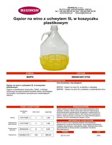 Gąsior na wino z uchwytem 5L w koszyczku plastikowym SYMBOL KOD EAN BDP5 5904816013702 CHARAKTERYSTYKA Inne produkty z tej kategorii: Gąsior na wino z uchwytem 5L w koszyczku plastikowym Gąsior w plastikowym koszyczku. Szkło, z którego wykonane są butle posiada wszelkie atesty zezwalające na kontakt z produktami spożywczymi zawierającymi alkohol . BDP5Z - Gąsior na wino 5L w plastiku z zakrętką BDP5D – Gąsior na wino 5L w plastiku z zamknięciem drucianym DANE LOGISTYCZNE Sztuka PRZEZNACZENIE szer/gł/wys [cm] Ilość sztuk waga [kg] 17X17X35 1 1,50 Gąsior szklany do fermentacji oraz przechowywania wina, nalewek, miodów. Może służyć jako element dekoracyjny. Korki/zamknięcia dopasowane do gąsiora o pojemności 5L: korek z korka o średnicy 30mm, bez otworu do zamknięcia balonu; korek gumowy z otworem na rurkę fermentacyjną o średnicy 33 mm; hermetyczny kapsel z drutu INFORMACJE DODATKOWE Opakowanie jednostkowe 17X17X35 1 1,50 Opakowanie zbiorcze 35X52X35 6 9,00 Paleta Euro 120x80x170 120 360,00 Butli nie wolno myć w gorącej wodzie oraz poddawać gwałtownym zmianom termicznym, zbyt wysoka temperatura mogłaby spowodować uszkodzenie szkła. Zalecane jest mycie gąsiora/butelki w letniej wodzie z dodatkiem środków dezynfekcyjnych. PKWiU VAT 23.13.13.0 23%