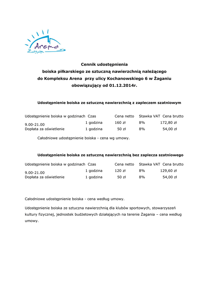 Cennik udostępnienia boiska piłkarskiego ze sztuczną nawierzchnią należącego do Kompleksu Arena przy ulicy Kochanowskiego 6 w Żaganiu obowiązujący od 01.12.2014r. Udostępnienie boiska ze sztuczną nawierzchnią z zapleczem szatniowym Udostępnienie boiska w godzinach Czas 9.00-21.00 Dopłata za oświetlenie Cena netto Stawka VAT Cena brutto 1 godzina 160 zł 8% 172,80 zł 1 godzina 50 zł 8% 54,00 zł Całodniowe udostępnienie boiska - cena wg umowy. Udostępnienie boiska ze sztuczną nawierzchnią bez zaplecza szatniowego Udostępnienie boiska w godzinach Czas 9.00-21.00 Dopłata za oświetlenie Cena netto Stawka VAT Cena brutto 1 godzina 120 zł 8% 129,60 zł 1 godzina 50 zł 8% 54,00 zł Całodniowe udostępnienie boiska - cena według umowy. Udostępnienie boiska ze sztuczna nawierzchnią dla klubów sportowych, stowarzyszeń kultury fizycznej, jednostek budżetowych działających na terenie Żagania – cena według umowy.