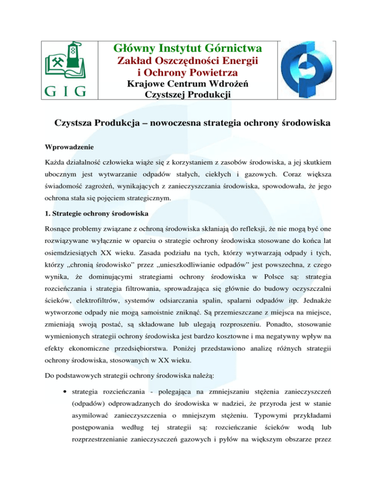 Główny Instytut Górnictwa Zakład Oszczędności Energii i Ochrony Powietrza Krajowe Centrum WdroŜeń Czystszej Produkcji Czystsza Produkcja – nowoczesna strategia ochrony środowiska Wprowadzenie KaŜda działalność człowieka wiąŜe się z korzystaniem z zasobów środowiska, a jej skutkiem ubocznym jest wytwarzanie odpadów stałych, ciekłych i gazowych. Coraz większa świadomość zagroŜeń, wynikających z zanieczyszczania środowiska, spowodowała, Ŝe jego ochrona stała się pojęciem strategicznym. 1. Strategie ochrony środowiska Rosnące problemy związane z ochroną środowiska skłaniają do refleksji, Ŝe nie mogą być one rozwiązywane wyłącznie w oparciu o strategie ochrony środowiska stosowane do końca lat osiemdziesiątych XX wieku. Zasada podziału na tych, którzy wytwarzają odpady i tych, którzy „chronią środowisko” przez „unieszkodliwianie odpadów” jest powszechna, z czego wynika, Ŝe dominującymi strategiami ochrony środowiska w Polsce są: strategia rozcieńczania i strategia filtrowania, sprowadzająca się głównie do budowy oczyszczalni ścieków, elektrofiltrów, systemów odsiarczania spalin, spalarni odpadów itp. JednakŜe wytworzone odpady nie mogą samoistnie zniknąć. Są przemieszczane z miejsca na miejsce, zmieniają swoją postać, są składowane lub ulegają rozproszeniu. Ponadto, stosowanie wymienionych strategii ochrony środowiska jest bardzo kosztowne i ma negatywny wpływ na efekty ekonomiczne przedsiębiorstwa. PoniŜej przedstawiono analizę róŜnych strategii ochrony środowiska, stosowanych w XX wieku. Do podstawowych strategii ochrony środowiska naleŜą: • strategia rozcieńczania - polegająca na zmniejszaniu stęŜenia zanieczyszczeń (odpadów) odprowadzanych do środowiska w nadziei, Ŝe przyroda jest w stanie asymilować zanieczyszczenia o mniejszym stęŜeniu. Typowymi przykładami postępowania według tej strategii są: rozcieńczanie ścieków wodą lub rozprzestrzenianie zanieczyszczeń gazowych i pyłów na większym obszarze przez budowę wysokich kominów. Jak nietrudno zauwaŜyć, ten sposób postępowania stracił sens, o ile kiedykolwiek był sensowny, poniewaŜ koncentracja przemysłu przekroczyła stopień krytyczny, w wyniku czego istotny stał się ładunek zanieczyszczeń a nie jego stęŜenie. • strategia filtrowania - polegająca na stosowaniu róŜnego rodzaju urządzeń filtrujących w celu oddzielenia i zatrzymania części lub całości zanieczyszczeń ze strumienia odpadów. Przykładami najczęściej stosowanych układów filtrujących są oczyszczalnie ścieków oraz instalacje odpylające lub odsiarczające spaliny. Skuteczność takiego sposobu postępowania jest ograniczona i bardzo kosztowna, gdyŜ odpady pofiltracyjne wymagają składowisk i często dodatkowej obróbki neutralizującej, a więc problem zanieczyszczania środowiska nie został rozwiązany a jedynie przesunięty w czasie. • strategia recyrkulacji - polegająca na zawracaniu powstałych odpadów do tego samego procesu wytwórczego lub innych procesów wytwórczych, jako materiałów wsadowych lub ich wykorzystaniu w postaci produktów. Ten sposób postępowania jest bliski idei Czystszej Produkcji, ale stosowany jako jedyny sposób ochrony środowiska będzie nieskuteczny, poniewaŜ nie wszystkie odpady moŜna recyrkulować, a ponadto koszty tego sposobu mogą okazać się zbyt wysokie. Wspomniane koszty obejmują: koszty transportu, koszty związane z przejściem materiałów przez proces technologiczny, koszty ewentualnej obróbki odpadów. • strategia zapobiegania - polegająca na takim postępowaniu, które prowadzi do zapobiegania powstawaniu odpadów u źródła ich generowania w procesach wytwórczych. Jest to sposób, który stanowi istotę Czystszej Produkcji gdyŜ prowadzi do oszczędności materiałów wsadowych i energii, jednocześnie zmniejszając lub zupełnie redukując strumienie odpadów. Stosowanie Czystszej Produkcji nie tylko skutecznie chroni środowisko przez wyeliminowanie lub minimalizację strumieni odpadów, lecz takŜe jest opłacalne, poniewaŜ prowadzi do zwiększania zyskowności i produktywności głównie przez minimalizację kosztów wytwarzania. Czystsza Produkcja (CP) nie lansuje podejścia „czarno - białego”, czyli zasady - albo zapobieganie albo nic. Wprost przeciwnie, chodzi o podejście elastyczne, które w pierwszej kolejności zaleca rozwaŜenie moŜliwości uniknięcia powstawania odpadów, następnie 2 minimalizacji ich ilości, a gdy jest to niemoŜliwe recyrkulacji odpadów. Dopiero na samym końcu naleŜy rozwaŜać moŜliwość usuwania odpadów, co oznacza, Ŝe stosowanie takiej sekwencji postępowania w większości przypadków będzie prowadziło do minimalizacji odpadów, które muszą być usuwane. 2. Istota Czystszej Produkcji W stosunku do terminu „Czystsza Produkcja” zamiennie stosowane są terminy: Czystsze Technologie (Cleaner technologies), Czyste Technologie (Clean technologies), Zapobieganie Odpadom (Pollution prevention) i Czysta Produkcja. Termin „Czystsza Produkcja” zawiera w sobie zasadę, Ŝe jeŜeli jest czysta produkcja zgodnie z jakimiś formalnie ustalonymi kryteriami, to zawsze moŜna doprowadzić do stanu czystszej produkcji, zgodnie z zasadą, Ŝe skoro jest czysto to moŜe być czyściej. Z innych załoŜeń wychodzą przeciwnicy tego terminu twierdząc, Ŝe produkcja powinna być czysta, ale to oznacza albo czystość umowną, albo modelową (nieosiągalną) produkcję bezodpadową. Jak widać nie ma zasadniczej róŜnicy w pojmowaniu zasad i celów CP, choć róŜne instytucje, działające w tym zakresie mogą posługiwać się innymi terminami na określenie tego typu działalności. W tym świetle słuszne wydaje się stwierdzenie, Ŝe CP jest skuteczną drogą naprzód, gwarantującą dalszy zrównowaŜony rozwój. Czystsza Produkcja jest terminem powszechnie stosowanym, ale róŜnie definiowanym. W niniej