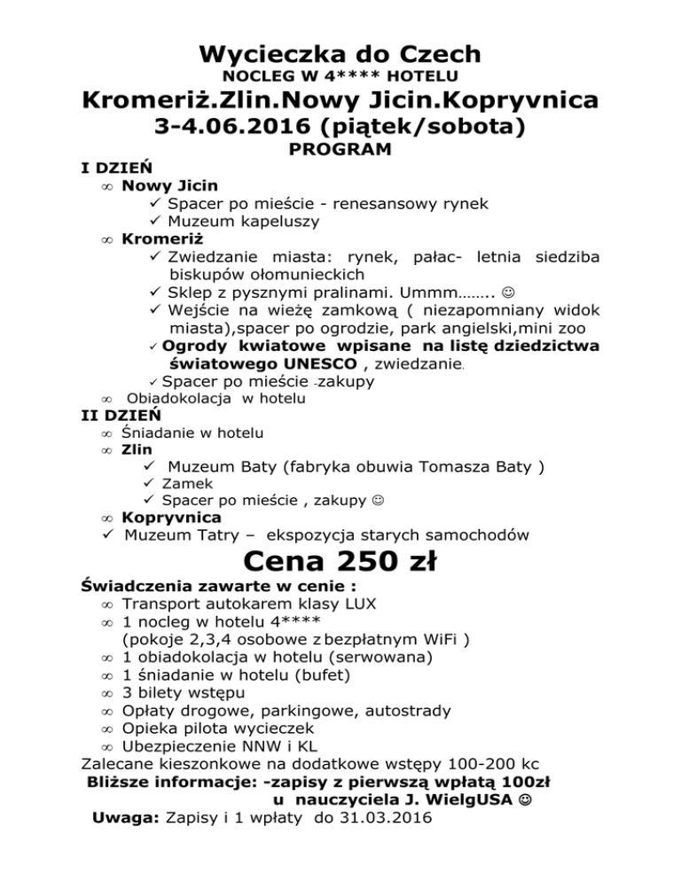 Wycieczka do Czech NOCLEG W 4**** HOTELU KromeriŜ.Zlin.Nowy Jicin.Kopryvnica 3-4.06.2016 (piątek/sobota) PROGRAM I DZIEŃ • Nowy Jicin Spacer po mieście - renesansowy rynek Muzeum kapeluszy • KromeriŜ Zwiedzanie miasta: rynek, pałac- letnia siedziba biskupów ołomunieckich Sklep z pysznymi pralinami. Ummm…….. ☺ Wejście na wieŜę zamkową ( niezapomniany widok miasta),spacer po ogrodzie, park angielski,mini zoo Ogrody kwiatowe wpisane na listę dziedzictwa światowego UNESCO , zwiedzanie. Spacer po mieście -zakupy • Obiadokolacja w hotelu II DZIEŃ • Śniadanie w hotelu • Zlin Muzeum Baty (fabryka obuwia Tomasza Baty ) Zamek Spacer po mieście , zakupy ☺ • Kopryvnica Muzeum Tatry – ekspozycja starych samochodów Cena 250 zł Świadczenia zawarte w cenie : • Transport autokarem klasy LUX • 1 nocleg w hotelu 4**** (pokoje 2,3,4 osobowe z bezpłatnym WiFi ) • 1 obiadokolacja w hotelu (serwowana) • 1 śniadanie w hotelu (bufet) • 3 bilety wstępu • Opłaty drogowe, parkingowe, autostrady • Opieka pilota wycieczek • Ubezpieczenie NNW i KL Zalecane kieszonkowe na dodatkowe wstępy 100-200 kc BliŜsze informacje: -zapisy z pierwszą wpłatą 100zł u nauczyciela J. WielgUSA ☺ Uwaga: Zapisy i 1 wpłaty do 31.03.2016