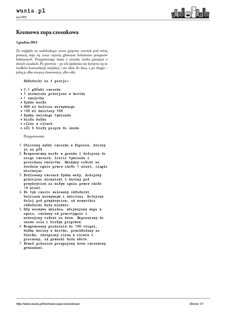 Powered by TCPDF (www.tcpdf.org) wusia.pl eco-PDF Kremowa zupa czosnkowa 3 grudnia 2014 Ze względu na nadchodzący sezon grypowy czosnek pod różną postacią staje się coraz częściej głównym bohaterem przepisów kulinarnych. Przygotowując dania z czosnku trzeba pamiętać o dwóch zasadach. Po pierwsze - po ich zjedzeniu nie korzysta się ze środków komunikacji miejskiej i nie idzie do kina, a po drugie jedzą je albo wszyscy domownicy, albo nikt. Składniki na 4 porcje: 2,5 główki czosnku 3 ziemniaki pokrojone w kostkę 1 szalotka łyżka masła 800 ml bulionu warzywnego 100 ml śmietany 30% łyżka świeżego tymianku biała bułka oliwa z oliwek sól & biały pieprz do smaku Przygotowanie: 1. Obieramy ząbki czosnku z łupinek, kroimy je na pół. 2. Rozpuszczmy masło w garnku i dodajemy do niego czosnek, liście tymianku i posiekaną szalotkę. Smażymy całość na średnim ogniu przez około 5 minut, ciągle mieszając. 3. Podlewamy czosnek łyżką wody, dodajemy pokrojone ziemniaki i dusimy pod przykryciem na małym ogniu przez około 10 minut. 4. Po tym czasie zalewamy składniki bulionem warzywnym i śmietaną. Gotujemy dalej pod przykryciem, aż wszystkie składniki będą miękkie. 5. Gdy warzywa zmiękną, zdejmujemy zupę z ognia, czekamy aż przestygnie i miksujemy całość na krem. Doprawiamy do smaku solą i białym pieprzem. 6. Rozgrzewamy piekarnik do 180 stopni, bułkę kroimy w kostkę, przekładamy na blachę, skrapiamy oliwą z oliwek i pieczemy, aż grzanki będą złote. 7. Przed podaniem posypujemy krem czosnkowy grzankami. http://www.wusia.pl/kremowa-zupa-czosnkowa/ Strona 1/1