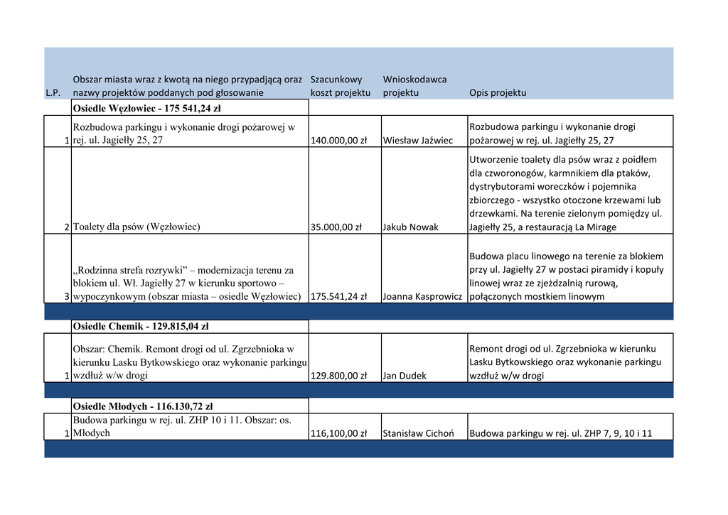 L.P. Obszar miasta wraz z kwotą na niego przypadjącą oraz Szacunkowy nazwy projektów poddanych pod głosowanie koszt projektu Wnioskodawca projektu Opis projektu Wiesław Jaźwiec Rozbudowa parkingu i wykonanie drogi pożarowej w rej. ul. Jagiełły 25, 27 Jakub Nowak Utworzenie toalety dla psów wraz z poidłem dla czworonogów, karmnikiem dla ptaków, dystrybutorami woreczków i pojemnika zbiorczego - wszystko otoczone krzewami lub drzewkami. Na terenie zielonym pomiędzy ul. Jagiełły 25, a restauracją La Mirage Osiedle Węzłowiec - 175 541,24 zł Rozbudowa parkingu i wykonanie drogi pożarowej w 1 rej. ul. Jagiełły 25, 27 2 Toalety dla psów (Węzłowiec) 140.000,00 zł 35.000,00 zł „Rodzinna strefa rozrywki” – modernizacja terenu za blokiem ul. Wł. Jagiełły 27 w kierunku sportowo – 3 wypoczynkowym (obszar miasta – osiedle Węzłowiec) 175.541,24 zł Budowa placu linowego na terenie za blokiem przy ul. Jagiełły 27 w postaci piramidy i kopuły linowej wraz ze zjeżdzalnią rurową, Joanna Kasprowicz połączonych mostkiem linowym Osiedle Chemik - 129.815,04 zł Obszar: Chemik. Remont drogi od ul. Zgrzebnioka w kierunku Lasku Bytkowskiego oraz wykonanie parkingu 1 wzdłuż w/w drogi 129.800,00 zł Jan Dudek Remont drogi od ul. Zgrzebnioka w kierunku Lasku Bytkowskiego oraz wykonanie parkingu wzdłuż w/w drogi Osiedle Młodych - 116.130,72 zł Budowa parkingu w rej. ul. ZHP 10 i 11. Obszar: os. 1 Młodych Stanisław Cichoń Budowa parkingu w rej. ul. ZHP 7, 9, 10 i 11 116,100,00 zł Stary Bytków - 72.662,88 zł 1 Lampa oświetleniowa chodnika (stary Bytków) 7.000,00 zł Janina Lisieńska 2 Budowa chodnika dt. ok.. 60 m. (stary Bytków) 20.000,00 zł 3 Budowa placu zabaw przy ul. Rzepusa 72.000,00 zł Henryk Lisieński Karolina WłoczykOrzechowska Montaż lampy oświetelniowej na końcu chodnika łączącego ul. Waloszka z ul. Bytkowską Budowa chodnika łączącego ul. Waloszka i Krasickiego z ul. Boh. Westerplatte oraz utworzenie przejścia dla pieszych w kierunku szkoły Budowa placu zabaw przy ul. Rzepusa Osiedle Wróbla i Korfantego - 96.699,88 zł 1 96.000,00 zł Barbara Patyk Płuciennik 2 Remont alejki w Lasku Bytkowskim 96.000,00 zł Beata Breguła 3 Strefa zabaw podwórkowych "Akuratny Plac" Rozbudowa miejsc parkowania samochodów 4 osobowych 96.000,00 zł Agnieszka Pyka 96.000,00 zł Adam Górecki 5 Budowa siłowni na wolnym powietrzu 96.600,00 zł Renata Soduś Budowa urządzeń do ćwiczeń na wolnym powietrzu na obszarze między ulicą Wróbla, a Okrężną Remont alejki w Lasku Bytkowskim od garaży przy ul. Leśnej do początku wyremontowanej wcześniej alejki. Budowa placu zabaw w oparciu o wykorzystanie naturalnych walorów miejsca (roślinnośc, ukształtowanie terenu) oraz urządzenia stworzone z naturalnych materiałów. Rozbudowa miejsc parkowania przy ul. Wróbla 3, 4, 5 Budowa siłowni na wolnym powietrzu przy ul. Korfantego 9-10 Grzegorz Mól Budowa parkingu wraz z dojazdem przy budynkach na ul. Zielonej 7, 8, 9 Siłownia na wolnym powietrzu Osiedle Tuwim - 140.458,40 zł 1 Parking ul. Zielona 140.000,00 zł Budowa siłowi na wolnym powietrzu na dużej polanie 2 w Lasku Bytkowskim 3 Modernizacja placu zabaw ul. Okrężna – obszar Tuwim 4 Utworzenie parkingu przy ul. Kasztanowej 140.000,00 zł 140.400,00 zł 40.000,00 zł Andrzej Sędzielewski Jarosława Palczewska Monika Grudziewicz Budowa siłowi na wolnym powietrzu na dużej polanie w Lasku Bytkowskim blisko wejścia od ul. Okrężnej Wymiana podłoża i doposażenie placu zabaw na ul. Okrężnej Utworzenie parkingu przy ul. Kasztanowej 2, 3, 4 Osiedle Fabud - 128.473,44 zł 1 Wykonanie miejsc postojowych wzdłuż ulicy Stawowej 128.473,44 zł Wykonanie chodnika z kostki brukowej i wymiana dwóch słupów oświetleniowych 2 25.000,00 zł Parking na 35 miejsc postojowych przy ul. Wyzwolenia 38 128.400,00 zł Plac zabaw i siłownia na wolnym powietrzu w rej. ul. 4 Stawowa-Wyzwolenia 120.000,00 zł Parking dla samochodów osobowych - 25 szt., ul. J. 5 Dreyzy. Obszar Fabud 63.000,00 zł Wykonanie miejsc postojowych wzdłuż ulicy Tadeusz Woźniak Stawowej Wykonanie chodnika z kostki brukowej na odcinku od ul. Stawowej 4a do sklepu LIDL przy ul. Orzeszkowej i wymiana dwóch słupów Joanna Karaś oświetleniowych Utworzenie Parkinu na 35 miejsc postojowych Dariusz Harasyn przy ul. Wyzwolenia 8 Sandra OrlikBudowa placu zabaw i siłowni na wolnym Barrow powietrzu w rej. ul. Stawowa-Wyzwolenia Utworzenie miejsc parkingowych przy ul. J. Marcin Porembski Dreyzy Chodnik na Wyzwolenia 6 55.000,00 zł Joanna Bober 45.000,00 zł Anna Markiewicz 45.000,00 zł Urszula Strand Budowa chodnika wzdłuż ul. Wyzwolenia od skrzyżowania z ul. Towarową do ul. Hadamika Osiedle Falklandy - 47.150,12 zł 1 2 Wyłożenie kostki brukowej na ścieżce łączącej ul. Budryka z ul. Ks. bp. Czesława Domina Wykonanie miejsc postojowych Wyłożenie kostki brukowej na ścieżce łączącej ul. Budryka z ul. Ks. bp. Czesława Domina Utworzenie miejsc prakingowych przy ul. Budryka 3 Siłownia pod chmurką 47.000,00 zł Michałkowice - 162.393,56 zł Planty Michałkowickie – rynek Michał – remont alejek / 1 Nowe planty Michałkowickie 160.000,00 zł 2 3 4 Budowa kompleksu sportowo-rekreacyjnego Razem rozhuśtajmy świat – integracyjny plac zabaw przy Parku Tradycji Utworzenie miejsc parkingowych przy ul. Krakowskiej 162.393,56 zł 90.000,00 zł 50.000,00 zł Katarzyna Miler Budowa siłowni na wolnym powietrzu przy ul. Budryka 10 na terenie zielonym. Janusz Markiewcz / Jan Wieczorek Jan Zagórski/ Henryk Bazan Naprawa nawierzchni alejek plantów michałkowickich naprzeciw kościoła Budowa kompleksu sportowo - rekreacyjnego przy ul. Bytomskiej. Budowa placu zabaw ze szczególnym Edyta Świątczakuwzględnieniem urządzeń zabawowych dla Gurzęda dzieci z niepełnosprawnościami. Utworzenie miejsc parkingowych przy ul. Paweł Grudziewicz Krakowskiej wraz z dojazdem Osiedle Robotnicze - 100.523,44 zł Zagospodar