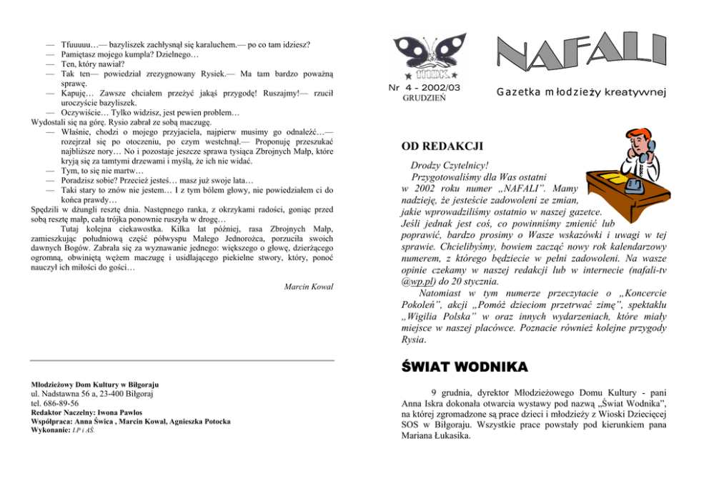 — — — — Tfuuuuu…— bazyliszek zachłysnął się karaluchem.— po co tam idziesz? Pamiętasz mojego kumpla? Dzielnego… Ten, który nawiał? Tak ten— powiedział zrezygnowany Rysiek.— Ma tam bardzo poważną sprawę. — Kapuję… Zawsze chciałem przeżyć jakąś przygodę! Ruszajmy!— rzucił uroczyście bazyliszek. — Oczywiście… Tylko widzisz, jest pewien problem… Wydostali się na górę. Rysio zabrał ze sobą maczugę. — Właśnie, chodzi o mojego przyjaciela, najpierw musimy go odnaleźć…— rozejrzał się po otoczeniu, po czym westchnął.— Proponuję przeszukać najbliższe nory… No i pozostaje jeszcze sprawa tysiąca Zbrojnych Małp, które kryją się za tamtymi drzewami i myślą, że ich nie widać. — Tym, to się nie martw… — Poradzisz sobie? Przecież jesteś… masz już swoje lata… — Taki stary to znów nie jestem… I z tym bólem głowy, nie powiedziałem ci do końca prawdy… Spędzili w dżungli resztę dnia. Następnego ranka, z okrzykami radości, goniąc przed sobą resztę małp, cała trójka ponownie ruszyła w drogę… Tutaj kolejna ciekawostka. Kilka lat później, rasa Zbrojnych Małp, zamieszkując południową część półwyspu Małego Jednorożca, porzuciła swoich dawnych Bogów. Zabrała się za wyznawanie jednego: większego o głowę, dzierżącego ogromną, obwiniętą wężem maczugę i usidlającego piekielne stwory, który, ponoć nauczył ich miłości do gości… Marcin Kowal Nr 4 - 2002/03 GRUDZIEŃ G a z e tk a m ło d z ie ży kreatywnej OD REDAKCJI Drodzy Czytelnicy! Przygotowaliśmy dla Was ostatni w 2002 roku numer „NAFALI”. Mamy nadzieję, że jesteście zadowoleni ze zmian, jakie wprowadziliśmy ostatnio w naszej gazetce. Jeśli jednak jest coś, co powinniśmy zmienić lub poprawić, bardzo prosimy o Wasze wskazówki i uwagi w tej sprawie. Chcielibyśmy, bowiem zacząć nowy rok kalendarzowy numerem, z którego będziecie w pełni zadowoleni. Na wasze opinie czekamy w naszej redakcji lub w internecie (nafali-tv @wp.pl) do 20 stycznia. Natomiast w tym numerze przeczytacie o „Koncercie Pokoleń”, akcji „Pomóż dzieciom przetrwać zimę”, spektaklu „Wigilia Polska” w oraz innych wydarzeniach, które miały miejsce w naszej placówce. Poznacie również kolejne przygody Rysia. ŚWIAT WODNIKA Młodzieżowy Dom Kultury w Biłgoraju ul. Nadstawna 56 a, 23-400 Biłgoraj tel. 686-89-56 Redaktor Naczelny: Iwona Pawlos Współpraca: Anna Świca , Marcin Kowal, Agnieszka Potocka Wykonanie: I.P i AŚ. 9 grudnia, dyrektor Młodzieżowego Domu Kultury - pani Anna Iskra dokonała otwarcia wystawy pod nazwą „Świat Wodnika”, na której zgromadzone są prace dzieci i młodzieży z Wioski Dziecięcej SOS w Biłgoraju. Wszystkie prace powstały pod kierunkiem pana Mariana Łukasika. KONCERT POKOLEŃ 5 grudnia w sali widowiskowej Młodzieżowego Domu Kultury odbył się KONCERT POKOLEŃ zorganizowany przez Stowarzyszenie Miłośników Zespołu Pieśni i Tańca Tanew „Pokolenia” oraz naszą placówkę. Grupa starsza i młodsza Zespołu Tańca Ludowego „Tanew” zaprezentowała tańce biłgorajskie, zaś grupa Stowarzyszenia Miłośników Zespołu Pieśni i Tańca Tanew „Pokolenia”, składająca się z byłych tancerzy zespołu, przedstawiła obrazek biłgorajski „Z pola”. W zabawach biłgorajskich wzięli udział członkowie wszystkich grup. Zebrani goście mogli również usłyszeć gawędę „ Jak się sitarz z piekła wydostał” w wykonaniu Agatki Wołoszyn ze Szkoły Podstawowej nr 5. Na zakończenie wieczoru wszyscy uczestnicy koncertu zaśpiewali pieśń „Biłgorajska ty ziemico”. Koncert przygotowały panie: Anna Iskra i Ewa Chuchro. Imprezie towarzyszyła ekspozycja prac pokonkursowych „Poznajemy ojcowiznę” przygotowana przez panią Annę Świcę. POMÓŻ DZIECIOM PRZETRWAĆ ZIMĘ 7 grudnia na terenie Biłgoraja odbyła się zbiórka darów w ramach akcji „Pomóż dzieciom przetrwać zimę”, zorganizowana przez Polski Czerwony Krzyż. Przeprowadziliśmy sondę, z której wynika, że wielu ludzi popiera tego typu akcje i chętnie bierze w nich udział. Większość mieszkańców Biłgoraja twierdzi, że pomagają dzieciom głównie z potrzeby serca, a jednym z proponowanych sposobów, który pozwoliłby rozwiązać przynajmniej część problemów ubogich maluchów, jest danie pracy i godnego wynagrodzenia rodzicom tych dzieci. Wolontariusze w tej akcji to głównie dzieci i młodzież. Jak sami mówili do pracy skłoniła ich chęć niesienia pomocy najbardziej potrzebującym i bezradnym. Dla jednych był to debiut, dla innych to już któraś z kolei akcja, w której pomagają. — To nie wszystko… — O co chodzi tym pchlażom? — Nie odwracaj się! — Dlaczego? — Po prostu tego nie rób… Za późno… Maniek, na zwrot „nie odwracaj się”, odwrócił się… Stanął oko w oko z różowym bazyliszkiem. — Dzień dobry— powiedział bazyliszek. — Aaaa!!! Mamo!!!— reakcja dinozaura. — Przepraszam… Nie chciałem pana przestraszyć…— niestety, nie zdążył. Maniek już dawno wyrąbał otwór w kracie, po czym, rozpaczliwie odbił się od maczugi i razem z wrzeszczącą małpą wspinał się na górę. — Nie zbliżaj się!— krzyknął Rysiek.— Jestem uzbrojony i niebezpieczny!— dodał po chwili namysłu. — Doprawdy? A co niby mi zrobisz? — Zgniotę cię maczugą! — To rzeczywiście rozsądny argument, o ile uda ci się ją tu zmieścić. No tak, pomyślał Rysiek, zakrywając oczy. — Kogo ja straszę?— zaczął użalać się nagle bazyliszek.— Nie bój się, nic ci nie zrobię… — Dlaczego mam ci wierzyć? — Bo: jestem już stary, mam dość pożerania tych wszystkich dziewic… Ale ty mi na taką nie wyglądasz… Zresztą, nieważne… Te małpy podstępem zwabiły mnie do jaskini i teraz więzią. Mam tego dość, możesz mnie nawet zabić, nie będę robił ci wyrzutów. — Mogę ci ufać?— sp