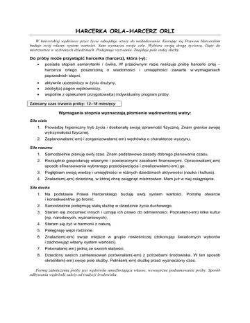 HARCERKA ORLA-HARCERZ ORLI W harcerskiej wędrówce przez życie odnajduje wzory do naśladowania. Kierując się Prawem Harcerskim buduje swój własny system wartości. Sam wyznacza swoje cele. Wybiera swoją drogę życiową. Dąży do mistrzostwa w wybranych dziedzinach. Podejmuje wyzwania. Znajduje pole stałej służby. Do próby może przystąpić harcerka (harcerz), która (-y): • posiada stopień samarytanki / ćwika. W przeciwnym razie realizuje próbę harcerki orlej – harcerza orlego poszerzoną o wiadomości i umiejętności zawarte w wymaganiach poprzednich stopni, • aktywnie uczestniczy w życiu drużyny, • zdobył(a) pagon wędrowniczy, • wspólnie z opiekunem przygotował(a) indywidualny program próby. Zalecany czas trwania próby: 12–18 miesięcy Wymagania stopnia wyznaczają płomienie wędrowniczej watry: Siła ciała 1. Prowadzę higieniczny tryb życia i doskonalę swoją sprawność fizyczną. Znam granice swojej wytrzymałości fizycznej. 2. Zaplanowałam(-em) i zorganizowałam(-em) wędrówkę o charakterze wyczynu. Siła rozumu 1. Samodzielnie planuję swój czas. Znam podstawowe zasady dobrego planowania czasu. 2. Rozsądnie gospodaruję własnymi i powierzonymi zasobami finansowymi. Opracowałam(-em) sposób sfinansowania wybranego przedsięwzięcia i zrealizowałam(-em) go. 3. Pogłębiam swoją wiedzę i umiejętności w różnych dziedzinach aktywności (nauka i kultura). 4. Znalazłam(-em) dziedzinę, w której chcę osiągnąć mistrzostwo. Mam już w niej osiągnięcia. Siła ducha 1. Na podstawie Prawa Harcerskiego buduję swój system wartości. Potrafię otwarcie i konsekwentnie go bronić. 2. Samodzielnie podejmuję stałą służbę w dziedzinie życia duchowego. 3. Staram się zrozumieć innych i uznaję ich prawo do odmienności. Poznałam(-em) kilka kultur (np. narodowych, wyznaniowych). 4. Staram się żyć w harmonii z naturą. 5. Pielęgnuję więzi rodzinne. 6. Znalazłam(-em) swoje miejsce w grupie rówieśniczej (dokonując świadomych wyborów i zachowując własny system wartości). 7. Pokonałam(-em) jedną ze swoich słabości. 8. Dziedziny swoich zainteresowań porównałam(-em) z potrzebami środowiska. W ten sposób określiłam(-em) swoje pole służby. Pełniłam(-em) służbę przez wyznaczony czas. Formą zakończenia próby jest wędrówka umożliwiająca własne, wewnętrzne podsumowanie próby. Sposób odbywania wędrówki zależy od tradycji środowiska.