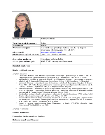 Imię i nazwisko Katarzyna Milik Tytuł lub stopień naukowy doktor