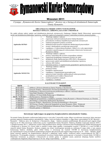 Wrzesień 2011 Czytając „Rymanowski Kurier Samorządowy” dowiesz się o bieżących działaniach Samorządu Gminy Rymanów. ORGANIZACJA URZĘDU GMINY W RYMANOWIE REFERAT OŚWIATY, ZDROWIA, KULTURY I PROMOCJI Do zadań referatu należy nadzór nad działalnością placówek oświatowych, Gminnego Zakładu Opieki Zdrowotnej, sprawowanie opieki nad działalnością kulturalną i sportową, realizacja rządowych programów pomocy materialnej uczniom, promocja gminy. Realizuje zadania z zakresu: organizacji szkół prowadzonych przez Gminę Rymanów prowadzenia ewidencji niepublicznych placówek oświatowych realizacji programów pomocy uczniom Agnieszka SIEŃKO dofinansowania kosztów kształcenia młodocianych pracowników awansi i doskonalenia zawodowego nauczycieli współpracy z Uzdrowiskiem Rymanóo Zdrój S.A.w celu zapewnienia warunków umożliwiających wykorzystanie właściwości leczniczych Rymanowa Zdroju Realizuje zadania z zakresu: pomocy materialnej dla uczniów (stypendium szkolne) organizacja bezpłatnego transportu uczniów do szkół Pokój 21 działalności Rady Społecznej przy SPG ZOZ w Rymanowie Urszula MAKULIŃSKA sprawowanie opieki nad działalnością kulturalną i sportową ochrony dóbr kultury udzielania pomocy w organizowaniu gospodarstw agroturystycznych Realizuje zadania z zakresu: promocji Gminy kontaktów zagranicznych współpracy z organizacjami pozarządowymi Agnieszka NIEMCZYK opracowywania wniosków aplikacyjnych celem pozyskania pozabudżetowych środków finansowych realizacji projektów unijnych współpracy z mediami KALENDARZ WYDARZEŃ DATA 24.07.2011 25.07.2011 28.07.2011 29.07.2011 31.07.2011 06.08.-15.08.2011 09.08.2011 11.08.2011 12.08.2011 14.08.2011 14.08.2011 21.08.2011 WYDARZENIE Jubileusz 130-lecia Ochotniczej Straży Pożarnej w Rymanowie Konwent Wójtów i Burmistrzów Powiatu Krośnieńskiego w Jedliczu Konferencja w Rzeszowie poświęcona problematyce odbioru i utylizacji odpadów Sesja Rady Miejskiej w Rymanowie Jubileusz 125-lecia Kółka Rolniczego w Klimkówce Dni Rymanowa i Rymanowa Zdroju Podpisanie porozumienia o współpracy pomiędzy Gminą Rymanów a Miastem Pustomyty na Ukrainie Dni Pamięci o Żydowskiej Społeczności Rymanowa Konwent Wójtów i Burmistrzów Powiatu Krośnieńskiego w Korczynie XII Wyścig o Puchar Uzdrowisk Karpackich na trasie Rymanów Zdrój - Polańczyk Jubileusz 125-lecia Podhalańskiej Ochotniczej Straży Pożarnej w Posadzie Dolnej Dożynki gminne w Głębokiem Inwestycje wpływające na poprawę bezpieczeństwa mieszkańców Gminy. Na terenie Gminy Rymanów realizowane będą jeszcze w tym roku 2 niezwykle ważne, długo wyczekiwane inwestycje, które znacząco powinny poprawić bezpieczeństwo mieszkańców. Jedną z nich jest budowa chodnika w ciągu drogi wojewódzkiej Nr 887 Brzozów Rymanów - Daliowa, przy ul. Kolejowej w Rymanowie, drugą – budowa przejścia podziemnego dla pieszych pod ciągiem drogi krajowej nr 28. Obie inwestycje realizowane są przy współudziale Gminy Rymanów. Budowę chodnika rozpoczęto końcem 2010 r. w drugim kwartale 2011 r. zakończony został I etap przedsięwzięcia, którego wykonawcą było Przedsiębiorstwo Robót Inżynieryjnych i Drogowych w Krośnie S.A. Koszt robót w ramach I-szego etapu zgodnie z przetargiem wyniósł 1 740 940 zł, w tym 914 000 zł stanowił udział Gminy Rymanów. Końcem sierpnia ma zostać rozstrzygnięty przetarg na realizację II etapu robót, a tym samym kontynuację budowy chodnika, gdzie wkład Gminy w inwestycję ma wynieść 330 000 zł. Inwestycją komplementarną do wspomnianych wyżej jest budowa podziemnego przejścia dla pieszych pod ciągiem drogi krajowej nr 28 – Zator – Medyka, dzięki której znacznie poprawi się bezpieczeństwo pieszych z północnej części miasta, zwłaszcza dzieci uczęszczających do ZSP w Rymanowie. W przypadku ostatniej z wymienionych inwestycji Gmina będzie partycypować w kosztach w kwocie około 210 000 zł. Omawiane inwestycje są jednymi z kluczowych na terenie gminy w ostatnim czasie, ponieważ obejmują bardzo ruchliwe i niebezpieczne fragmenty drogi krajowej nr 28 oraz drogi wojewódzkiej nr 887. Nagrody „Młode Orły” dla najzdolniejszych uczniów w Gminie Rymanów rozdane. W dniu 6 lipca 2011 r. w Auli im. Marka Góry w Zespole Szkół Publicznych w Rymanowie odbyła się uroczystość wręczenia Nagród „Młode Orły” dla najzdolniejszych uczniów ze szkół prowadzonych przez Gminę Rymanów. Nagrody „Młode Orły” ustanowiono Zarządzeniem Burmistrza Gminy Rymanów z dnia 19 maja 2010 roku. Przyznawane są na podstawie Regulaminu, w którego preambule zapisano, że jednym z najważniejszych zadań edukacyjnych jest wspieranie rozwoju, zdolności i talentów dzieci i młodzieży poprzez ustanowienie Nagrody przyznawanej za wysokie wyniki w nauce i inne znaczące osiągnięcia (m.in. sportowe, recytatorskie, teatralne) uczniom szkół prowadzonych przez samorząd gminny. Regulamin Nagród został opracowany przez dyrektorów szkół, zaakceptowany i wprowadzony do realizacji Zarządzeniem przez Burmistrza Gminy. Za najwyższe wyniki w nauce i inne osiągnięcia nagrodę otrzymało 78 uczniów szkół podstawowych gimnazjów oraz liceum ogólnokształcącego w czterech kategoriach: Prymus – dla najlepszych uczniów klas programowo najwyższych szkół podstawowych, gimnazjów i szkoły ponadgimnazjalnej w/g algorytmu uwzględniającego liczbę uczniów w tych klasach. Egzamin - dla uczniów klas programowo najwyższych szkół podstawowych, gimnazjów i szkoły ponadgimnazjalnej, którzy uzyskali najlepsze wyniki sprawdzianu, egzaminu gimnazjalnego oraz maturalnego na szczeblu gminy. Konkursy – dla laureatów i finalistów konkursów przedmiotowych oraz olimpiad przedmiotowych organizowanych przez Kuratorium Oświaty. Mistrz – dla uczniów, którzy osiągnęli inne znaczące sukcesy na szczeblu krajowym lub wojewódzkim proporcjonalnie do liczby ucz