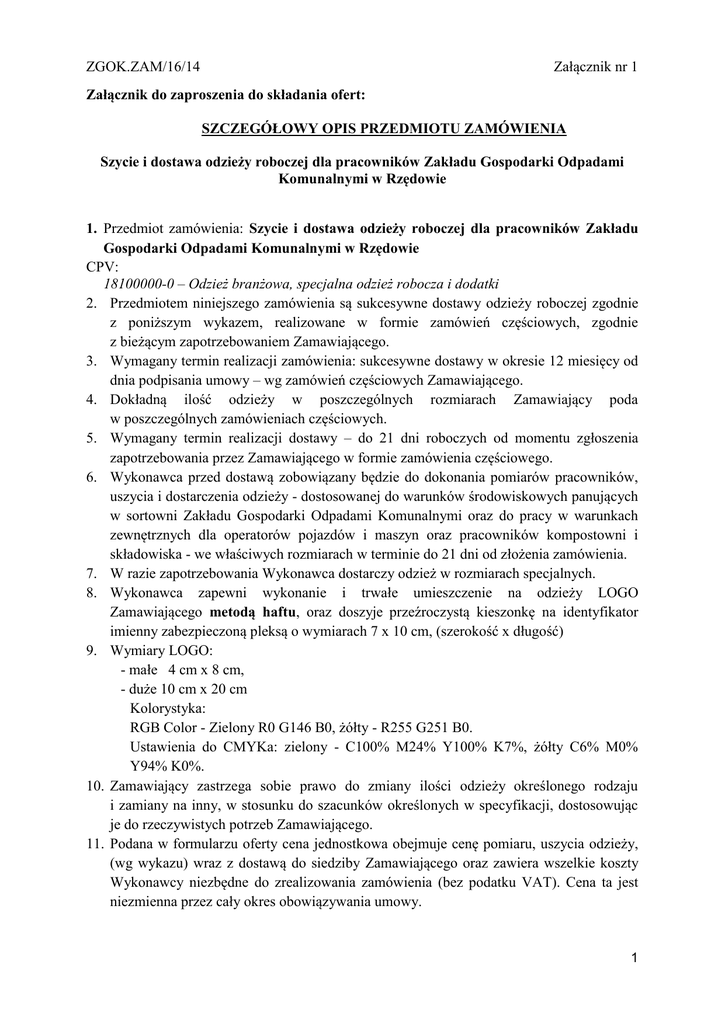 ZGOK.ZAM/16/14 Załącznik nr 1 Załącznik do zaproszenia do