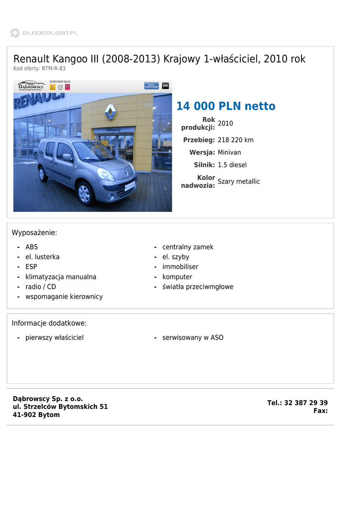 Renault Kangoo III (2008-2013) Krajowy 1-właściciel, 2010 rok Kod oferty: BTM-R-83 14 000 PLN netto Rok 2010 produkcji: Przebieg: 218 220 km Wersja: Minivan Silnik: 1.5 diesel Kolor Szary metallic nadwozia: Wyposażenie: - ABS el. lusterka ESP klimatyzacja manualna radio / CD wspomaganie kierownicy - centralny zamek el. szyby immobiliser komputer światła przeciwmgłowe Informacje dodatkowe: - pierwszy właściciel Dąbrowscy Sp. z o.o. ul. Strzelców Bytomskich 51 41-902 Bytom - serwisowany w ASO Tel.: 32 387 29 39 Fax: