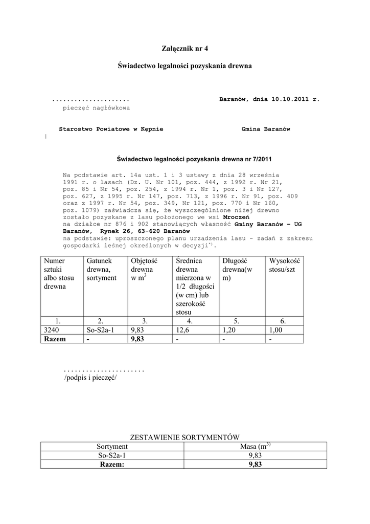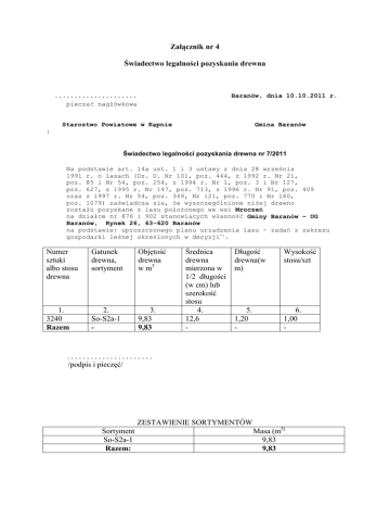 Załącznik nr 4 Świadectwo legalności pozyskania drewna ..................... pieczęć nagłówkowa Baranów, dnia 10.10.2011 r. Starostwo Powiatowe w Kępnie Gmina Baranów | Świadectwo legalności pozyskania drewna nr 7/2011 Na podstawie art. 14a ust. 1 i 3 ustawy z dnia 28 września 1991 r. o lasach (Dz. U. Nr 101, poz. 444, z 1992 r. Nr 21, poz. 85 i Nr 54, poz. 254, z 1994 r. Nr 1, poz. 3 i Nr 127, poz. 627, z 1995 r. Nr 147, poz. 713, z 1996 r. Nr 91, poz. 409 oraz z 1997 r. Nr 54, poz. 349, Nr 121, poz. 770 i Nr 160, poz. 1079) zaświadcza się, że wyszczególnione niżej drewno zostało pozyskane z lasu położonego we wsi Mroczeń na działce nr 876 i 902 stanowiących własność Gminy Baranów – UG Baranów, Rynek 26, 63-620 Baranów na podstawie: uproszczonego planu urządzenia lasu - zadań z zakresu gospodarki leśnej określonych w decyzji*). Numer sztuki albo stosu drewna Gatunek drewna, sortyment Objętość drewna w m3 1. 3240 Razem 2. So-S2a-1 - 3. 9,83 9,83 Średnica drewna mierzona w 1/2 długości (w cm) lub szerokość stosu 4. 12,6 - Długość drewna(w m) Wysokość stosu/szt 5. 1,20 - 6. 1,00 - ...................... /podpis i pieczęć/ ZESTAWIENIE SORTYMENTÓW Sortyment So-S2a-1 Razem: Masa (m3) 9,83 9,83