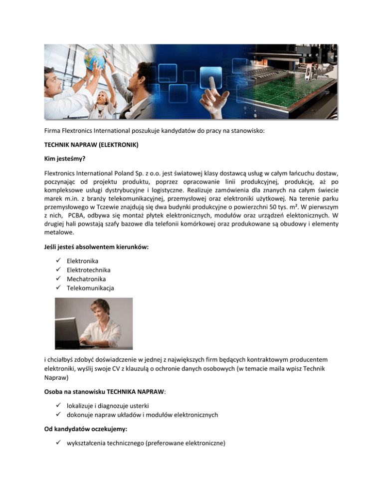 Firma Flextronics International poszukuje kandydatów do pracy na stanowisko: TECHNIK NAPRAW (ELEKTRONIK) Kim jesteśmy? Flextronics International Poland Sp. z o.o. jest światowej klasy dostawcą usług w całym łańcuchu dostaw, poczynając od projektu produktu, poprzez opracowanie linii produkcyjnej, produkcję, aż po kompleksowe usługi dystrybucyjne i logistyczne. Realizuje zamówienia dla znanych na całym świecie marek m.in. z branży telekomunikacyjnej, przemysłowej oraz elektroniki użytkowej. Na terenie parku przemysłowego w Tczewie znajdują się dwa budynki produkcyjne o powierzchni 50 tys. m². W pierwszym z nich, PCBA, odbywa się montaż płytek elektronicznych, modułów oraz urządzeń elektonicznych. W drugiej hali powstają szafy bazowe dla telefonii komórkowej oraz produkowane są obudowy i elementy metalowe. Jeśli jesteś absolwentem kierunków: Elektronika Elektrotechnika Mechatronika Telekomunikacja i chciałbyś zdobyć doświadczenie w jednej z największych firm będących kontraktowym producentem elektroniki, wyślij swoje CV z klauzulą o ochronie danych osobowych (w temacie maila wpisz Technik Napraw) Osoba na stanowisku TECHNIKA NAPRAW: lokalizuje i diagnozuje usterki dokonuje napraw układów i modułów elektronicznych Od kandydatów oczekujemy: wykształcenia technicznego (preferowane elektroniczne) wiedzy z zakresu elektroniki doświadczenie w naprawach podzespołów elektronicznych będzie atutem kandydata zdolności manualnych umiejętności pracy w zespole Oferujemy: możliwość udziału w interesujących projektach o zasięgu międzynarodowym liczne szkolenia zapewniające rozwój zawodowy zdobywanie doświadczenia pod okiem najlepszych specjalistów w branży umowę o pracę atrakcyjny pakiet socjalny (prywatna opieka medyczna oraz karta sportowa) dofinansowanie do nauki języków obych lub studiów