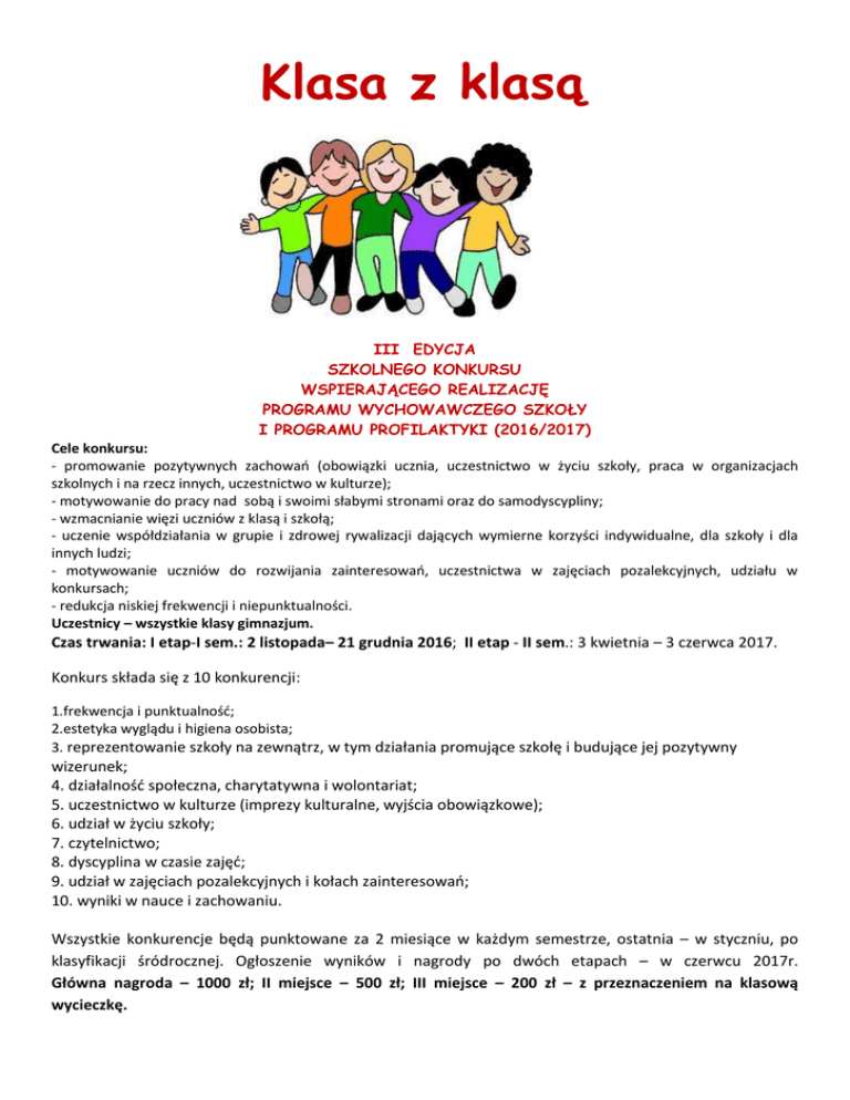 Klasa z klasą III EDYCJA SZKOLNEGO KONKURSU WSPIERAJĄCEGO REALIZACJĘ PROGRAMU WYCHOWAWCZEGO SZKOŁY I PROGRAMU PROFILAKTYKI (2016/2017) Cele konkursu: - promowanie pozytywnych zachowań (obowiązki ucznia, uczestnictwo w życiu szkoły, praca w organizacjach szkolnych i na rzecz innych, uczestnictwo w kulturze); - motywowanie do pracy nad sobą i swoimi słabymi stronami oraz do samodyscypliny; - wzmacnianie więzi uczniów z klasą i szkołą; - uczenie współdziałania w grupie i zdrowej rywalizacji dających wymierne korzyści indywidualne, dla szkoły i dla innych ludzi; - motywowanie uczniów do rozwijania zainteresowań, uczestnictwa w zajęciach pozalekcyjnych, udziału w konkursach; - redukcja niskiej frekwencji i niepunktualności. Uczestnicy – wszystkie klasy gimnazjum. Czas trwania: I etap-I sem.: 2 listopada– 21 grudnia 2016; II etap - II sem.: 3 kwietnia – 3 czerwca 2017. Konkurs składa się z 10 konkurencji: 1.frekwencja i punktualność; 2.estetyka wyglądu i higiena osobista; 3. reprezentowanie szkoły na zewnątrz, w tym działania promujące szkołę i budujące jej pozytywny wizerunek; 4. działalność społeczna, charytatywna i wolontariat; 5. uczestnictwo w kulturze (imprezy kulturalne, wyjścia obowiązkowe); 6. udział w życiu szkoły; 7. czytelnictwo; 8. dyscyplina w czasie zajęć; 9. udział w zajęciach pozalekcyjnych i kołach zainteresowań; 10. wyniki w nauce i zachowaniu. Wszystkie konkurencje będą punktowane za 2 miesiące w każdym semestrze, ostatnia – w styczniu, po klasyfikacji śródrocznej. Ogłoszenie wyników i nagrody po dwóch etapach – w czerwcu 2017r. Główna nagroda – 1000 zł; II miejsce – 500 zł; III miejsce – 200 zł – z przeznaczeniem na klasową wycieczkę. KONKURENCJE - ZASADY PRZYZNAWANIA PUNKTÓW, ODPOWIEDZIALNI Konkurencja 1.Frekwencja i punktualność Zasady punktacji Punkty dla klasy zdobywa każdy uczeń: - ze 100% frekwencją; - z wszystkimi usprawiedliwionymi nieobecnościami; - ze 100% punktualnością. Odpowiedzialni Wychowawcy Ilość przyznanych klasie punktów w każdym przypadku jest równa wartości procentowej: np. 20 uczniów w klasie – 10 uczniów bez nieobecności, czyli 50% - klasa otrzymuje 50 pkt za 100% frekwencji. 2. Estetyka wyglądu i higiena Punkty dla klasy zdobywa każdy uczeń przy każdej SU (P. Kos-Markiewski) kontroli: – kontrola, obliczenie - za mundurek – kontrola 1 raz w tygodniu; średniej wartości proc. dla wszystkich klas, przygotowanie rankingu klas. - za obuwie zamienne – kontrola 1 raz w tygodniu. Wychowawcy/nauczyIlość przyznanych klasie punktów jest równa ciele wspomagający średniej wartości procentowej (jw.) np. mundurek – średnia z czterech kontroli – 80% - klasa otrzymuje 80 pkt za strój szkolny. np. buty – średnia z czterech kontroli – 70% klasa otrzymuje 70 pkt za zmianę obuwia. 3. Reprezentowanie szkoły na zewnątrz (w tym działania promujące szkołę i budujące jej pozytywny wizerunek) Punkty dla klasy zdobywa każdy uczeń: -za indywidualny udział w konkursach przedmiotowych – 10 pkt; wiedzowych, artystycznych i sportowych – 5 pkt, - dodatkowo za zdobycie I-III miejsca, wyróżnienie lub zakwalifikowanie się do kolejnego etapu – 5 pkt; - za udział w innych projektach i konkursach zewnętrznych – 3 pkt; - za reprezentowanie szkoły w rywalizacji zespołowej – 2 pkt. Opiekunowie uczniów w konkursach przygotowanie imiennych list uczniów. Klasa - za przygotowanie stoiska na jarmark Wychowawcy/n.wspoświąteczny 1-15 pkt. magający/ nauczyciele zajęć tech. i art., komisja oceniająca (Dyrekcja, Rada Rodziców, SU) 4.Działalność, społeczna, Punkty dla klasy zdobywa każdy uczeń: charytatywna, wolontariat - za współudział w zorganizowaniu jednej akcji społecznej, charytatywnej - 2 pkt; - za stałą pracę w wolontariacie – 5 pkt; - za stałą pracę w Samorządzie Uczniowskim: 5 pkt. Opiekunowie wszystkich akcji, wolontariatu i SU przygotowanie imiennych list uczniów. Klasa dodatkowo: za akcję społeczną lub charytatywną jako projekt konsolidujący zespół – 15 pkt. 5. Uczestnictwo w kulturze i wyjściach obowiązkowych (jedno wyjście w miesiącu wyżej punktowane) Punkty dla klasy zdobywa każdy uczeń za Wychowawcy uczestnictwo w klasowym wyjściu. Ilość przyznanych klasie punktów jest równa wartości procentowej uczestników np. 20 uczniów w klasie – 15 idących do muzeum, czyli 75 % - klasa otrzymuje 75 pkt za wyjście Dodatkowo klasa za: - wyjście do kina -film wartościowy, profilaktyczny - 5 pkt; - muzeum, teatr, opera – 5 pkt; - inne wyjście obowiązkowe – 5 pkt. 6.Czytelnictwo Klasa za największą ilość książek wypożyczonych Bibliotekarz – ranking w wybranym miesiącu konkursu: 10 – 1 pkt czytelnictwa w kolejnych miesiącach 7. Udział w życiu szkoły Punkty dla klasy zdobywa każdy uczeń: - za przygotowanie uroczystości z okazji Święta Niepodległości, jasełek (lub innej uroczystości) – 3 pkt; - za udział (obecność!) w jarmarku świątecznym: ilość przyznanych klasie punktów jest równa wartości procentowej np. 20 uczniów w klasie – 5 uczniów na jarmarku, czyli 25 % - klasa otrzymuje 25 pkt za udział w jarmarku Wychowawcy, organizatorzy imprez – – przygotowanie listy uczniów biorących udział w organizacji imprezy - za udział w zbiórce makulatury – według K. Osuch – podsumow. kryteriów ustalonych przez organizatora; zbiórki i przyznanie klasom punktów Dodatkowo klasa - za dekorację świąteczną sali lekcyjnej: 1-15 pkt Komisja oceniająca (Dyrekcja, SU) 8. Dyscyplina w szkole 9. Udział w pozalekcyjnych 10.Wyniki w zachowaniu Punkty dla klasy zdobywa każdy uczeń bez uwag Wychowawca/nauczynegatywnych w zeszycie obserwacyjnym: ciel wspomagający Ilość przyznanych klasie punktów jest równa wartości procentowej np. 20 uczniów w klasie – 12 uczniów bez uwag negatywnych, czyli 60% - klasa otrzymuje 60 pkt za dyscyplinę. 