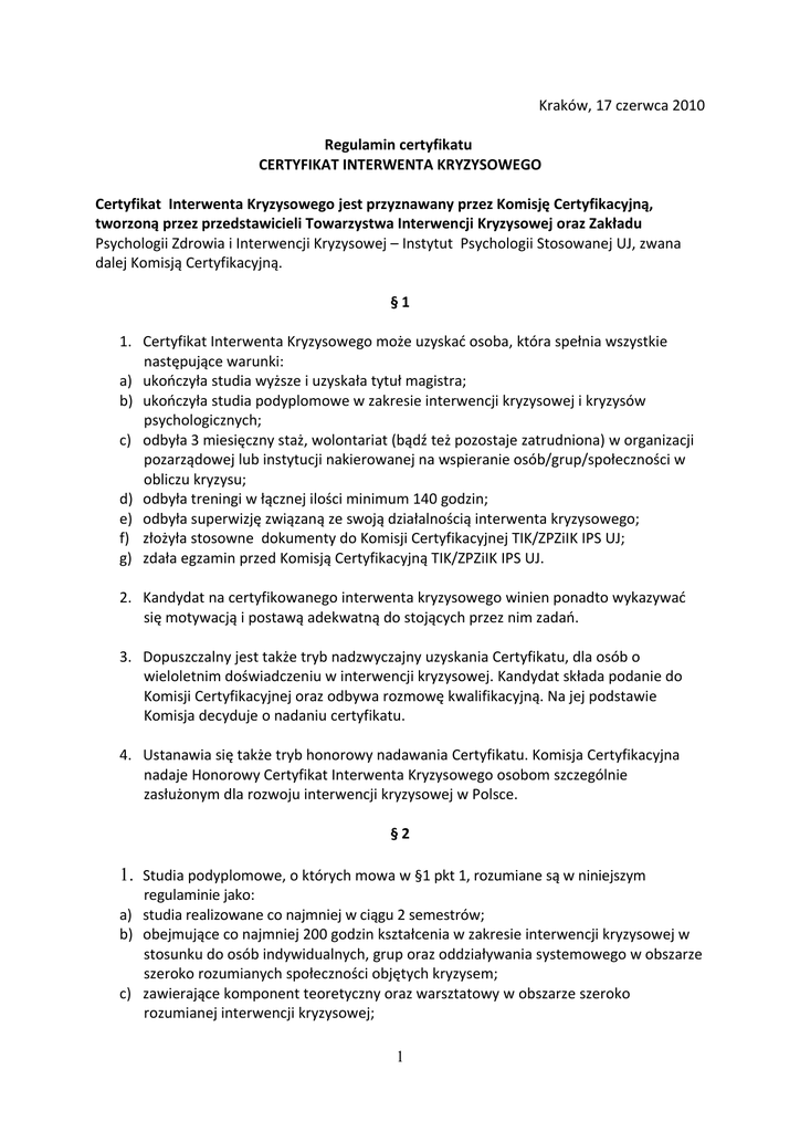 Kraków, 17 czerwca 2010 Regulamin certyfikatu CERTYFIKAT INTERWENTA KRYZYSOWEGO Certyfikat Interwenta Kryzysowego jest przyznawany przez Komisję Certyfikacyjną, tworzoną przez przedstawicieli Towarzystwa Interwencji Kryzysowej oraz Zakładu Psychologii Zdrowia i Interwencji Kryzysowej – Instytut Psychologii Stosowanej UJ, zwana dalej Komisją Certyfikacyjną. §1 1. Certyfikat Interwenta Kryzysowego może uzyskać osoba, która spełnia wszystkie następujące warunki: a) ukończyła studia wyższe i uzyskała tytuł magistra; b) ukończyła studia podyplomowe w zakresie interwencji kryzysowej i kryzysów psychologicznych; c) odbyła 3 miesięczny staż, wolontariat (bądź też pozostaje zatrudniona) w organizacji pozarządowej lub instytucji nakierowanej na wspieranie osób/grup/społeczności w obliczu kryzysu; d) odbyła treningi w łącznej ilości minimum 140 godzin; e) odbyła superwizję związaną ze swoją działalnością interwenta kryzysowego; f) złożyła stosowne dokumenty do Komisji Certyfikacyjnej TIK/ZPZiIK IPS UJ; g) zdała egzamin przed Komisją Certyfikacyjną TIK/ZPZiIK IPS UJ. 2. Kandydat na certyfikowanego interwenta kryzysowego winien ponadto wykazywać się motywacją i postawą adekwatną do stojących przez nim zadań. 3. Dopuszczalny jest także tryb nadzwyczajny uzyskania Certyfikatu, dla osób o wieloletnim doświadczeniu w interwencji kryzysowej. Kandydat składa podanie do Komisji Certyfikacyjnej oraz odbywa rozmowę kwalifikacyjną. Na jej podstawie Komisja decyduje o nadaniu certyfikatu. 4. Ustanawia się także tryb honorowy nadawania Certyfikatu. Komisja Certyfikacyjna nadaje Honorowy Certyfikat Interwenta Kryzysowego osobom szczególnie zasłużonym dla rozwoju interwencji kryzysowej w Polsce. §2 1. Studia podyplomowe, o których mowa w §1 pkt 1, rozumiane są w niniejszym regulaminie jako: a) studia realizowane co najmniej w ciągu 2 semestrów; b) obejmujące co najmniej 200 godzin kształcenia w zakresie interwencji kryzysowej w stosunku do osób indywidualnych, grup oraz oddziaływania systemowego w obszarze szeroko rozumianych społeczności objętych kryzysem; c) zawierające komponent teoretyczny oraz warsztatowy w obszarze szeroko rozumianej interwencji kryzysowej; 1 2. Jednostką organizacyjną studiów podyplomowych powinna być jednostka szkolnictwa wyższego, akredytowana przez MEN. §3 1. Treningi, o których mowa w §1 pkt 1, obejmują następujące formy i treści: a) trening własny (alternatywnie: zgrupowanie dydaktyczno-treningowe, psychodramę, genogramy, grupę Balinta, trening interpersonalny, terapię własną); b) trening w zakresie podstawowej komunikacji z osobami w ostrym kryzysie sytuacyjnym (utrata, przemoc); c) trening antydyskryminacyjny; d) trening genderowy; e) trening związany z wypaleniem zawodowym; f) trening dotyczący mediacji i negocjacji; g) trening dotyczący współpracy ze społecznością. 2. Odbycie treningów winno być udokumentowane na piśmie, w postaci świadectw informujących o treści treningu oraz jego wymiaru godzinowego. §4 1. Superwizja, o której mowa w §1 pkt 1, rozumiana są w niniejszym regulaminie jako: a) superwizja zrealizowana w wymiarze co najmniej 50 godzin; b) odbyta u superwizora/superwizorów wskazanych imiennie w ramach listy ogłoszonej i corocznie aktualizowanej przez Komisję Certyfikacyjną TIK/ZPZiIK IPS UJ. 2. Superwizja może być także prowadzona przez superwizora innego gremium superwizyjnego. Zgodę na wybór superwizora spoza listy superwizorów wyraża Komisja Certyfikacyjna TIK/ZPZiIK IPS UJ. 3. Superwizję można odbyć u więcej niż jednego superwizora, jednak za całość superwizji odpowiada j e d e n superwizor, który po jej zakończeniu wydaje opinię zakończoną jednoznaczną konkluzją dotyczącą przygotowania superwizowanej osoby do samodzielnego prowadzenia interwencji kryzysowych. §5 1. Egzamin certyfikacyjny, o który mowa w §1 pkt 1, kandydat na certyfikowanego Interwenta Kryzysowego składa przez Komisją Certyfikacyjną. 2. W ramach egzaminu ocenie podlega: a) wiedza teoretyczna z zakresu psychologicznych, społecznych i politycznych aspektów kryzysów; b) umiejętność stosowania interwencji kryzysowej z punktu widzenia różnych podejść i nurtów, teoretycznych i praktycznych. 2 3. Komisja Certyfikacyjna podejmuje decyzję o nadaniu kandydatowi certyfikatu Interwenta Kryzysowego na podstawie wyniku egzaminu i opinii superwizora. 4. W przypadku negatywnego wyniku egzaminu, kandydat ma prawo przystąpić do niego ponownie. §6 1. Dokumenty, które należy złożyć ubiegając się o Certyfikat Interwenta Kryzysowego, o których mowa w §1 pkt 1, są następujące: a) podanie do Komisji Certyfikacyjnej o nadanie certyfikatu; b) opis przebiegu pracy zawodowej; c) kserokopia dyplomu studiów wyższych; d) kserokopia dyplomu studiów podyplomowych; e) zaświadczenie o odbyciu stażu praktycznego, wolontariatu bądź wskazanie na praktykę zawodową w organizacji lub instytucji nakierowanej na aktywności w obszarze interwencji kryzysowej; f) zaświadczenia o odbytych treningach; g) opinia superwizora; h) potwierdzenie opłaty egzaminacyjnej. 2. Dokumenty należy składać do końca lutego lub do końca października każdego roku. §7 1. Komisję Certyfikacyjną powołuje na wspólnym posiedzeniu Kierownictwo Zakładu Psychologii Zdrowia i Interwencji Kryzysowej – Instytut Psychologii Stosowanej UJ oraz Zarząd Towarzystwa Interwencji Kryzysowej. 2. W skład Komisji Certyfikacyjnej wchodzą osoby reprezentujące pracowników naukowych oraz praktyków zakresie interwencji kryzysowej, posiadające Certyfikat Interwenta Kryzysowego. 3. Komisja Certyfikacyjna składa się z 3 do 5 osób. 2 osoby reprezentują Zakład Psychologii Zdrowia i Interwencji Kryzysowej – Instytut Psychologii Stosowanej UJ, zaś 3 osoby – Towarzystwo Interwencji Kryzysowej. 4. W Komisji Certyfikacyjnej nie może zasiadać osoba, która opracowała opinię z s