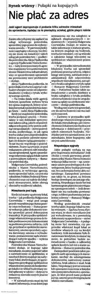 Rynek wtórny l Pułapki na kupujących Nie płać za adres Jeśli agent zaproponuje cl podanie kilku adresów mieszkań do sprzedania, żądając za to pieniędzy, uciekaj, gdzie pieprz rośnie Zanim zdecydujemy się zapłacić za usługi wybranego pośrednika, sprawdźmyjego prawo do wykonywania zawodu.—W pierwszej kołej ności zapytajmy o licencj ę, bez kto rej nie może on świadczyć takich usług jak pośrednictwo — podkreśla pośredniczka Alicja Fijałkowska z agencji Fijałkowski Nieruchomości. —Listę licencjonowanych agentów znajdziemy też na internetowej stronie Ministerstwa Infrastruktury, więc ze sprawdzeniem uprawnień nie powinniśmy mieć problemów —dodaje. Alicja Fijałkowska podkreśla, że. pośrednika trzeba też zapytać o aktualne ubezpieczenie od odpowiedzialności cywilnej z tytułu wykonywanego zawodu. — Na rynku działa wiele agencji. Dobrym sposobem wyboru' bywa też opinia znajomych, którzy wcześniej korzystali z pośrednictwa danego biura — radzi Alicja Fijałkowska. Kiedyjuż znajdziemy pośrednika, trzeba podpisać umowę. — Powinniśmy w niej dokładnie sprecyzować zakres usług, jakich od pośrednika oczekujemy, żeby potem uniknąć niespodzianek—mówi pośredniczka, podkreślając, że jak ognia trzeba unikać pseudopośredników, którzy za podanie adresów mieszkań czy domów żądają pieniędzy. — To nie ma nic wspólnego z pośrednictwem. Znane są sytuacje, że pod wskazanym adresem nikt mieszkania nie sprzedawał. Agent z prawdziwego zdarzenia ogląda lokale razem z potencjalnym nabywcą — tłumaczy pośredniczka. Małgorzata Czerwińska, pośredniczka z Maxon Nieruchomości, podkreśla, że wybierając agencję, warto sprawdzić także, czy jest ona członkiem Polskiej Federacji Nieruchomości oraz czy należy do lokalnych stowarzyszeń, które oferują chociażby możliwość szkoleń. wystawienia nie ma zaległości w opłatach eksploatacyjnych i remontowych —wyjaśnia Małgorzata Czerwińska. Dodaje, że ważne są także informacje o statusie gruntu, na którym znajduje się budynek, trzeba też wiedzieć, czy są wnioski o założenie księgi wieczystej na spółdzielcze własnościowe prawo do lokalu. — W przypadku nieruchomości lokalowej trzeba zaś sprawdzić podstawę prawną nabycia, odpis z księgi wieczystej, zaświadczenie z administracji (lub odpowiednio ^ wspólnoty mieszkaniowej, zarząd*cy) o braku zaległości z tytułu opłat — tłumaczy Małgorzata Czerwińska. — Potrzebne będzie także zaświadczenie z urzędu dzielnicy o braku zaległości z tytułu podatku od nieruchomości oraz że uregulowane są opłaty za użytkowanie wieczyste — dodaje pośredniczka. Według niej warto też sprawdzić, czy do nieruchomości nie ma żadnych roszczeń. — Zarówno w przypadku spółdzielczego własnościowego prawa do lokalu mieszkalnego, jak i nieruchomości lokalowej niezbędna jest informacja o dokonanych i przyszłych remontach budynku. Niezbędne jest też zaświadczenie, że w mieszkaniu, które kupujemy, nikt nie jest zameldowany. Niepokojące sygnały Jakie pułapki czyhają na nas przy kupowaniu mieszkania? Jeśli chodzi o rynek pierwotny, przedstawicielka Maxon Nieruchomości wskazuje kilka rzeczy — np. zawieranie umów przedwstępnych z deweloperem, który buduje pierwszy raz, bez zachowania formy aktu notarialnego. Zaniepokoić powinno nas także to, że grunt, na którym buduje deweloper, nie jest jego własnością. Niepokojący może być też harmonogram płatności niezwiązany z postępem robót.—Jeśli deweMieszkanie pod lupą loper nie ma rachunku powierniKiedyjuż mamy upatrzony lokal, czego, to klient pozbawiony jest natrzeba —jak podkreśla Małgorzata leżnej ochrony — tłumaczy MałgoCzerwińska — wziąć pod uwagę rzata Czerwińska. przede wszystkim jego status prawWedług pośredniczki uważać ny i stan techniczny. — Status praw- trzeba także, kupując lokal na rynny wskazuje, jakie dokumenty trze- ku wtórnym. — Zgubna bywa zbytba sprawdzić przed dokonaniem nia wiara, że skoro mieszkanie jest transakcji. Wprzypadku spółdziel- już wybudowane, to z pewnością czego własnościowego prawa do lo- dokumenty są sprawdzone—mówi kalu podstawowymi dokumentami Małgorzata Czerwińska.—Apułapsą podstawa prawna nabycia, czyli ką może być niewiedza, czy ponp. przydział ze spółdzielni miesz- przedni właściciel kupił lokal ze kaniowej, umowa sprzedaży, umo- środków własnych czy na kredyt wa darowizny, umowa o wybudo- bankowy. Jeśli mieszkanie było fiwanie, postanowienie sądu stwier- nansowane kredytem, to okazać się dzające nabycie spadku — wylicza może, że potrzebne będzie zaMałgorzata Czerwińska. świadczenie z banku o całkowitej Pośredniczka Maxon Nierucho- spłacie kredytu lub też o stanie zamości dodaje, że kupując takie dłużenia —tłumaczy pośredniczka. mieszkanie, musimy poprosić także Zaniepokoić powinien także poo zaświadczenie ze spółdzielni, w śpiech osób sprzedających mieszzasobach której znajduje się naby- kanie, niechęć do udostępniania wany lokal, stwierdzające, że sprze- dokumentów, zastrzeżony numer dającemu przysługuje spółdzielcze telefonu, brak adresu e-maił, brak własnościowe prawo do konkretne- faksu. Niepokojącyjest też wniosek go lokalu i że wkład budowlany zo- lub ujawnione roszczenia w księdze stał opłacony w całości—dotyczy to wieczystej nieruchomości, ujawniazwłaszcza nierozliczonych jeszcze' jące, że ktoś przed nami podpisał inwestycji. już np. umowę przedwstępną na to — W zaświadczeniu musi się też właśnie mieszkanie. znaleźć informacja, że na dzień jego —aig